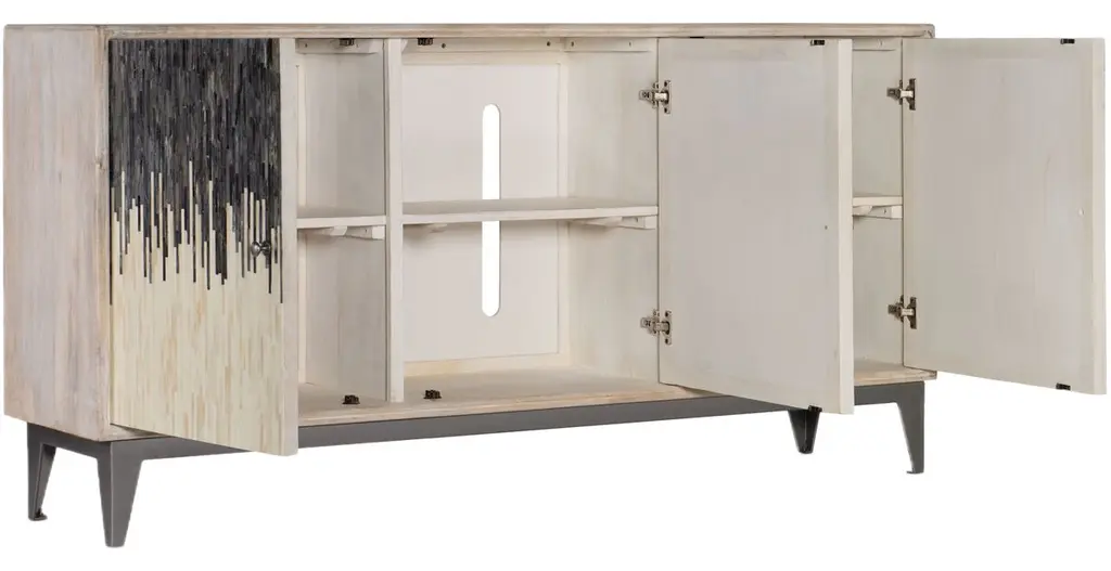 With a modern art vibe, this Three-Door Console is crafted with contrasting door fronts. The outside of the case is in a rustic light finish, accented by matte zinc metal knobs and iron base. There’s one removable shelf behind each door and a ventilated back panel. Accommodates up to a 70-inch TV.