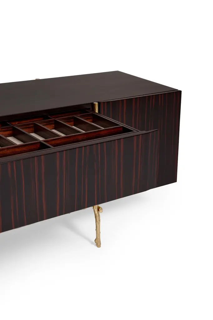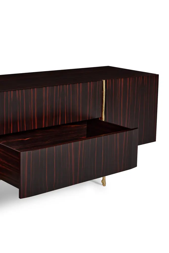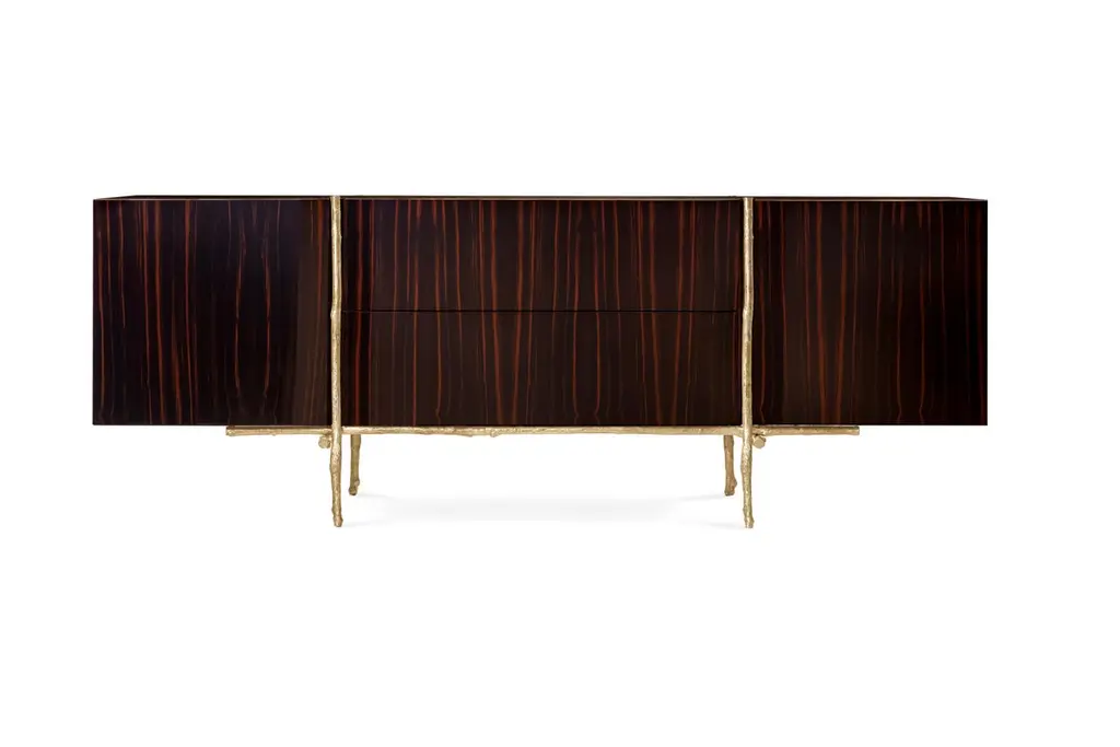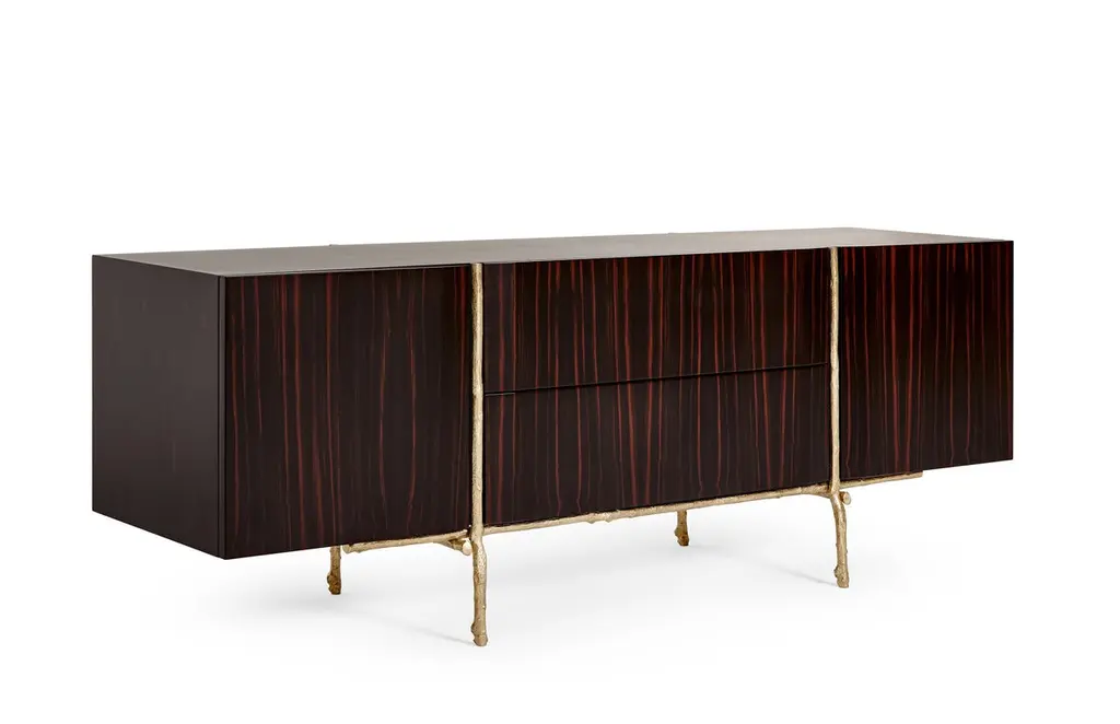 Bosque Sideboard by Ginger & JaggerDimensions: D 62 x W 220 x H 80 cm.Materials: Wood and brass.Finish: Body, interior, and exterior in Amara Ebony wood veneer in gloss finishing; structure in cast Brass in Brass finishing.This product is suitable for custom size. This product is made for living areas and interior spaces only. This product is not specified for bathrooms, spas, or humid environments. Not suitable for exteriors. Available in different finishes. Please contact us.Launched in Europe in 2012, Ginger & Jagger is a product design brand that prides itself on creating handcrafted high-end contemporary products inspired by Nature.Designed and produced in Porto, a land of craftsmen and age-old tradition, Ginger & Jagger’s Earth to Earth collection is an evocative poetic realm, where Nature’s sculptural shapes are made eternal through handcraft, with unique artisanal techniques and an outstanding blend of superb materials such as brass, silver and copper, marble and stone, and wood.The designer's compass is kept by an uncompromising desire for creative innovation balanced with the integrity of the materials, the artisanal techniques employed, and the brand's very own narrative element.The artisanal techniques availed range from brass casting, wood, and marble marquetry, hand-hammered metals, and hand-sculpted marble.Striving towards sustainability. Ginger & Jagger supports organizations worldwide, with contributions indexed to the products crafted every year.