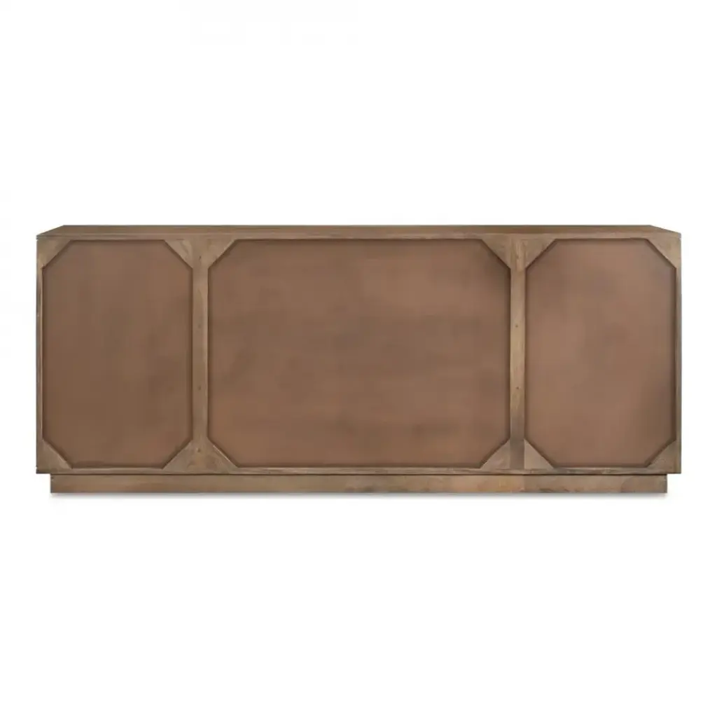 A minimalist storage option inspired by the architectural depth of an interior wall, the Bowen sideboard showcases simple geometry. Crafted from solid Mango wood with a matte sandblast brown finish, this piece features a simple, blocky silhouette that adds dimension. Four doors with magnetic catches reveal two adjustable interior shelves, bringing subtle functionality to any space.