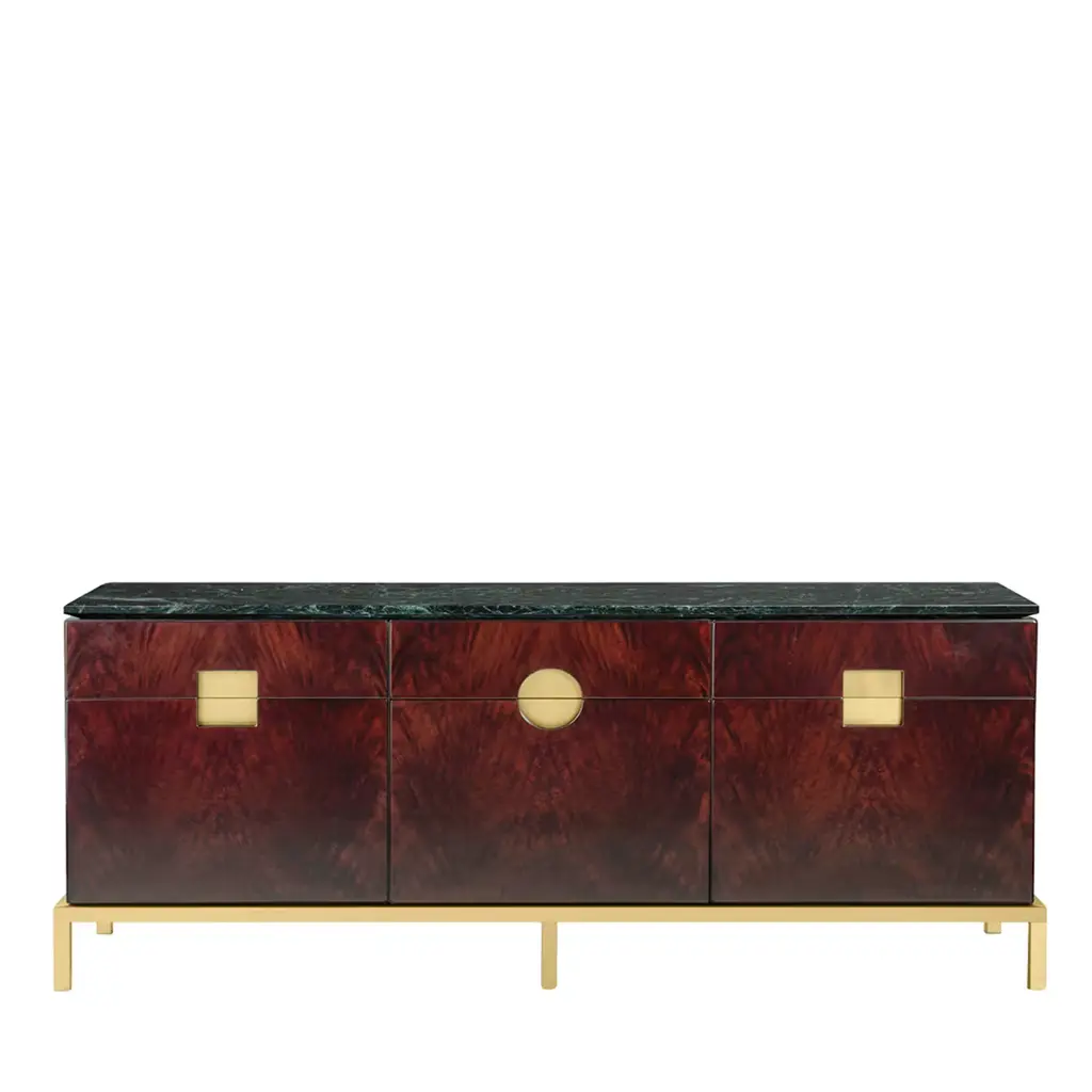 Showcasing a stunning, asymmetrical structure, this wooden sideboard will be an eye-catching addition to a modern interior. Its sculptural silhouette comprises a supporting, brass-finished metal sphere and four front panels enriched with a continuous metallic stripe in the same finish. The characteristic wood grain is enhanced by the brown lacquer. This piece is widely customizable in terms of finishes, please inquire with Concierge for options.