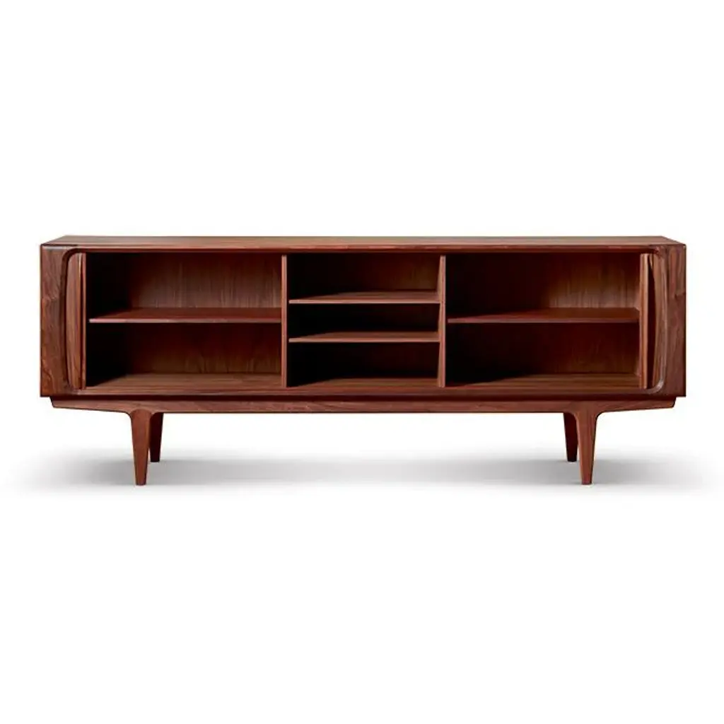 Sideboard no. 142 is the first of the mid-century sideboards relaunched by Bernh. Pedersen & Son. The sideboard was designed in 1965 and taps into the essence of Danish Modern with its clean lines, functional design and expert craftsmanship. The sideboard features tambour doors that roll seamlessly into the back. A rare technique today that is not only pleasing to the eye, but also functionally ideal as it minimizes the space needed. The interior of the cabinet is beautifully finished with adjustable shelves on each side and a middle section with optional shelves or pull-out dovetail trays for added storage. The curved front edges are constructed in solid wood as are the tambour doors, base and legs. To add extra detail to the design, the legs are pulled slightly under the sideboard to account for skirting, making it possible to place the piece up close to the wall. With a veneered back it can also find great use as a room divider. The eloquent lines and high quality cabinetmaking are sure to make this piece of furniture look beautiful in any setting. The sideboard is available in oak, walnut, teak or rosewood/palisander in either oil, soap or lacquer finish. On request the piece can be custom-made in almost any type of wood. The dovetail trays come in two optional heights and are easily adaptable to the middle section. Every piece is made in Denmark and individually numbered upon final assembling. The sideboard comes in two lengths.