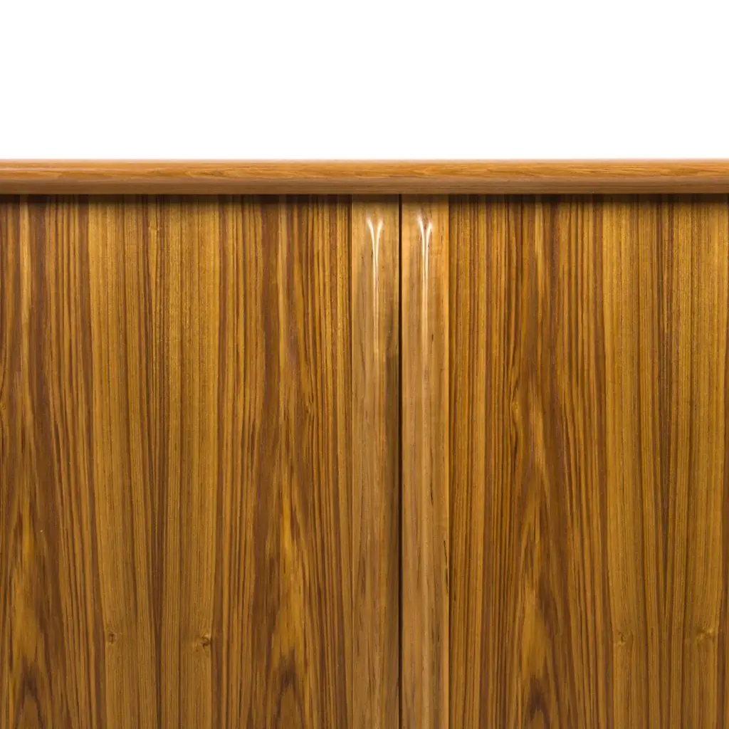 Sideboard no. 156 is the first of the mid-century sideboards relaunched by Bernh. Pedersen & Son. The sideboard was designed in 1966 and taps into the essence of Danish Modern with its clean lines, functional design and expert craftsmanship. The sideboard features tambour doors that roll seamlessly into the back. A rare technique today that is not only pleasing to the eye, but also functionally ideal as it minimizes the space needed. The interior of the cabinet is beautifully finished with adjustable shelves on each side and a middle section with optional shelves or pull-out dovetail trays for added storage. The curved front edges are constructed in solid wood as are the tambour doors, base and legs. To add extra detail to the design, the legs are pulled slightly under the sideboard to account for skirting, making it possible to place the piece up close to the wall. With a veneered back it can also find great use as a room divider. The eloquent lines and high quality cabinetmaking are sure to make this piece of furniture look beautiful in any setting. The sideboard is available in oak, walnut, teak or rosewood/palisander in either oil, soap or lacquer finish. On request the piece can be custom-made in almost any type of wood. The dovetail trays come in two optional heights and are easily adaptable to the middle section. Every piece is made in Denmark and individually numbered upon final assembling. The sideboard comes in two lengths.