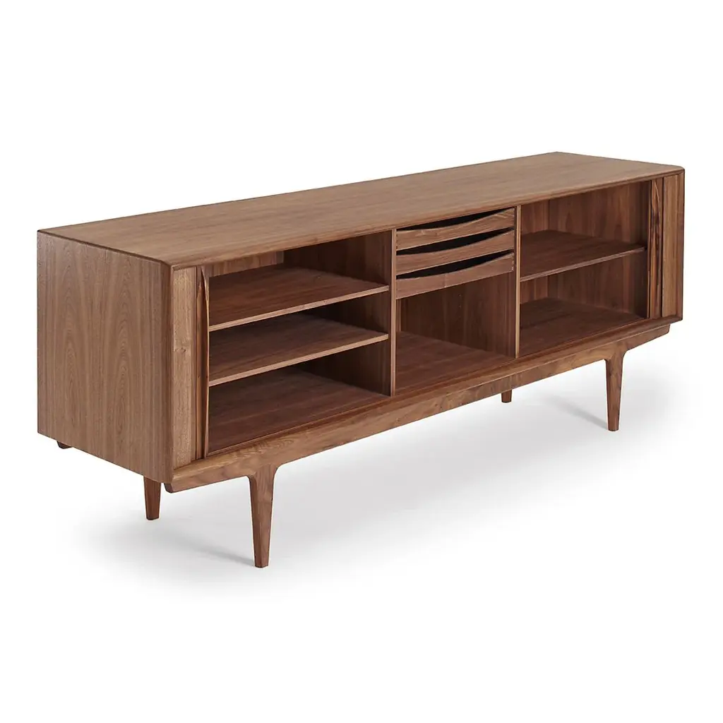 Sideboard no. 156 is the first of the mid-century sideboards relaunched by Bernh. Pedersen & Son. The sideboard was designed in 1966 and taps into the essence of Danish Modern with its clean lines, functional design and expert craftsmanship. The sideboard features tambour doors that roll seamlessly into the back. A rare technique today that is not only pleasing to the eye, but also functionally ideal as it minimizes the space needed. The interior of the cabinet is beautifully finished with adjustable shelves on each side and a middle section with optional shelves or pull-out dovetail trays for added storage. The curved front edges are constructed in solid wood as are the tambour doors, base and legs. To add extra detail to the design, the legs are pulled slightly under the sideboard to account for skirting, making it possible to place the piece up close to the wall. With a veneered back it can also find great use as a room divider. The eloquent lines and high quality cabinetmaking are sure to make this piece of furniture look beautiful in any setting. The sideboard is available in oak, walnut, teak or rosewood/palisander in either oil, soap or lacquer finish. On request the piece can be custom-made in almost any type of wood. The dovetail trays come in two optional heights and are easily adaptable to the middle section. Every piece is made in Denmark and individually numbered upon final assembling. The sideboard comes in two lengths.