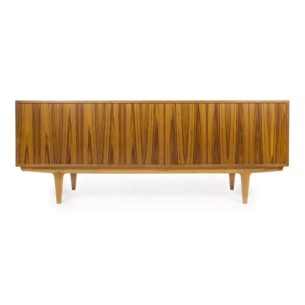 Sideboard no. 156 is the first of the mid-century sideboards relaunched by Bernh. Pedersen & Son. The sideboard was designed in 1966 and taps into the essence of Danish Modern with its clean lines, functional design and expert craftsmanship. The sideboard features tambour doors that roll seamlessly into the back. A rare technique today that is not only pleasing to the eye, but also functionally ideal as it minimizes the space needed. The interior of the cabinet is beautifully finished with adjustable shelves on each side and a middle section with optional shelves or pull-out dovetail trays for added storage. The curved front edges are constructed in solid wood as are the tambour doors, base and legs. To add extra detail to the design, the legs are pulled slightly under the sideboard to account for skirting, making it possible to place the piece up close to the wall. With a veneered back it can also find great use as a room divider. The eloquent lines and high quality cabinetmaking are sure to make this piece of furniture look beautiful in any setting. The sideboard is available in oak, walnut, teak or rosewood/palisander in either oil, soap or lacquer finish. On request the piece can be custom-made in almost any type of wood. The dovetail trays come in two optional heights and are easily adaptable to the middle section. Every piece is made in Denmark and individually numbered upon final assembling. The sideboard comes in two lengths.