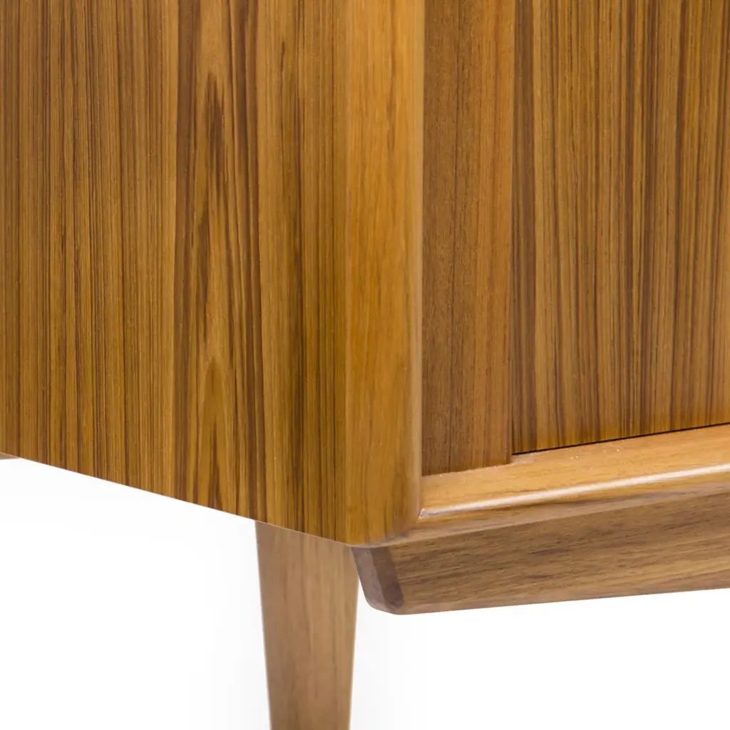 Sideboard no. 156 is the first of the mid-century sideboards relaunched by Bernh. Pedersen & Son. The sideboard was designed in 1966 and taps into the essence of Danish Modern with its clean lines, functional design and expert craftsmanship. The sideboard features tambour doors that roll seamlessly into the back. A rare technique today that is not only pleasing to the eye, but also functionally ideal as it minimizes the space needed. The interior of the cabinet is beautifully finished with adjustable shelves on each side and a middle section with optional shelves or pull-out dovetail trays for added storage. The curved front edges are constructed in solid wood as are the tambour doors, base and legs. To add extra detail to the design, the legs are pulled slightly under the sideboard to account for skirting, making it possible to place the piece up close to the wall. With a veneered back it can also find great use as a room divider. The eloquent lines and high quality cabinetmaking are sure to make this piece of furniture look beautiful in any setting. The sideboard is available in oak, walnut, teak or rosewood/palisander in either oil, soap or lacquer finish. On request the piece can be custom-made in almost any type of wood. The dovetail trays come in two optional heights and are easily adaptable to the middle section. Every piece is made in Denmark and individually numbered upon final assembling. The sideboard comes in two lengths.