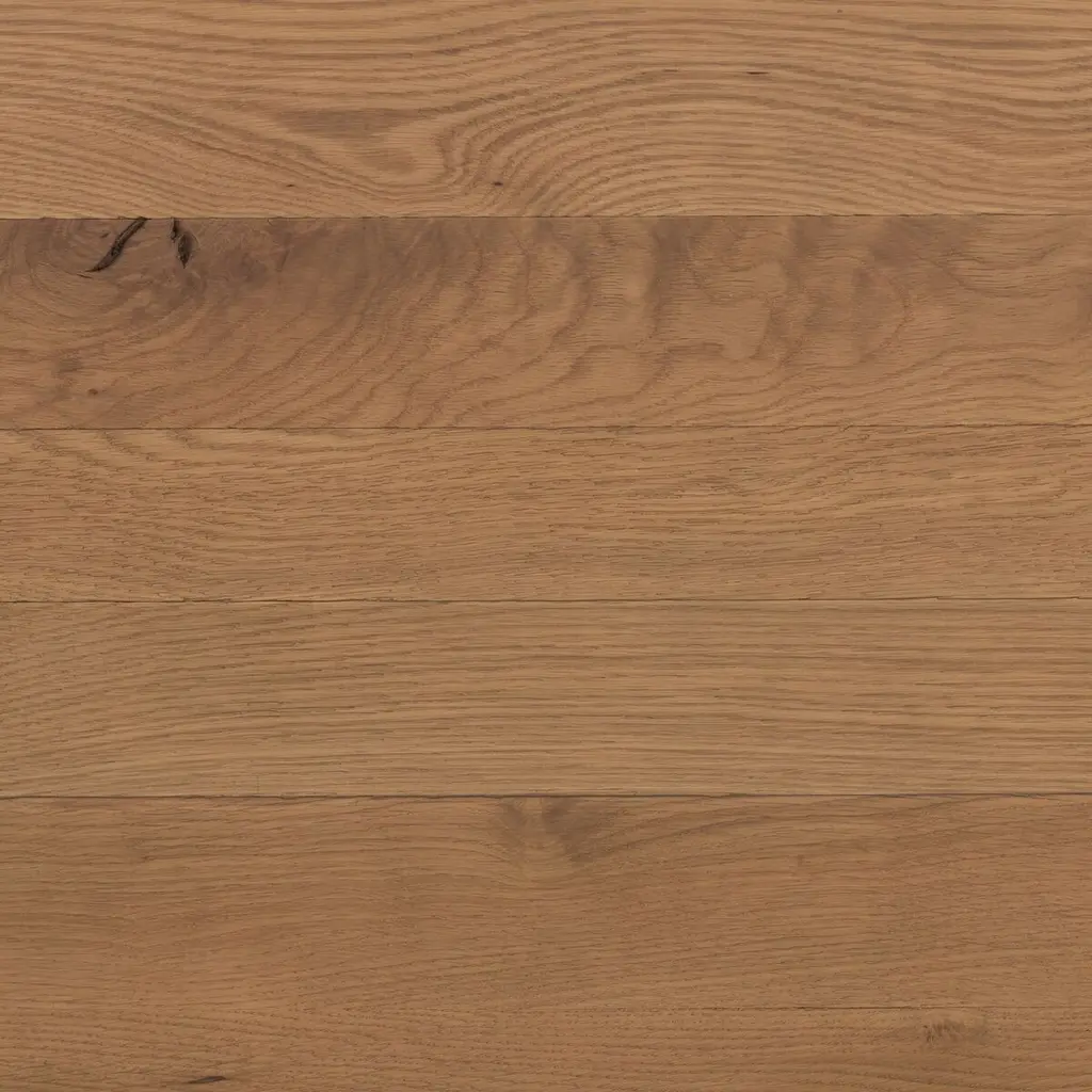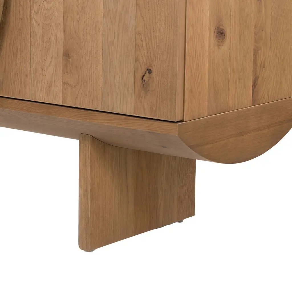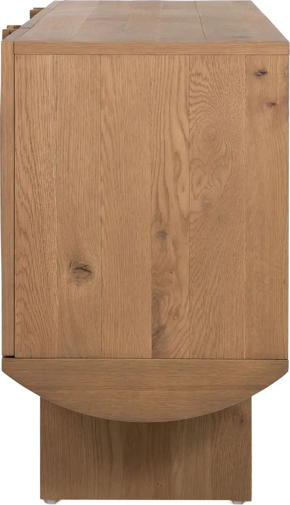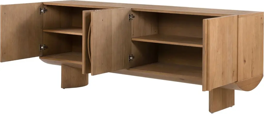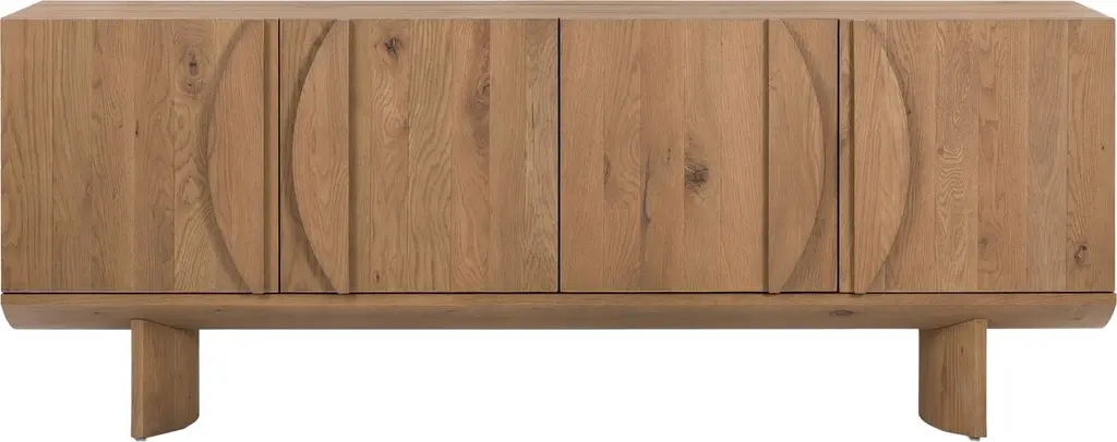 Not only does oak boast a distinctive grain, but it's also scratch resistant. Both qualities add to the appeal of this sideboard, as does its bold shape, an ideal marriage of straight lines and smooth curves, and its semicircular door handles. Behind each pair of doors is an adjustable shelf and a cutout for cord management.