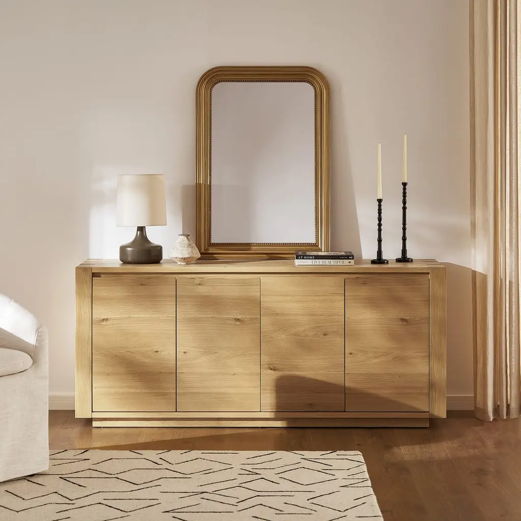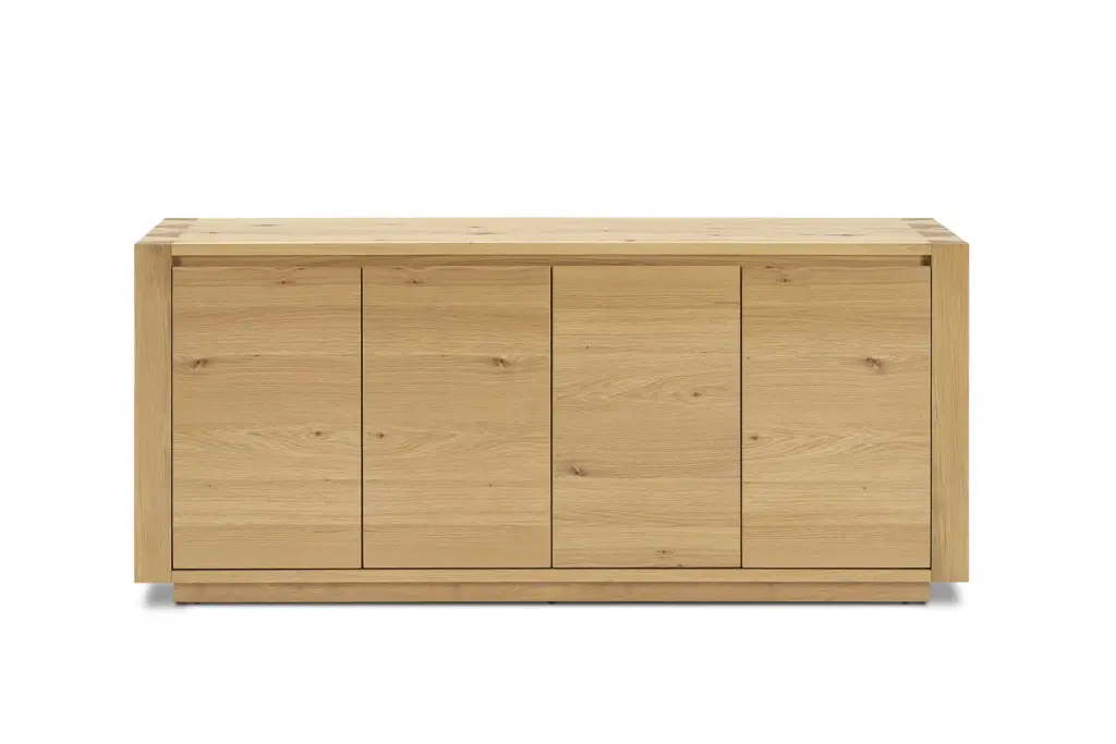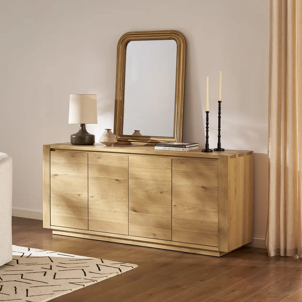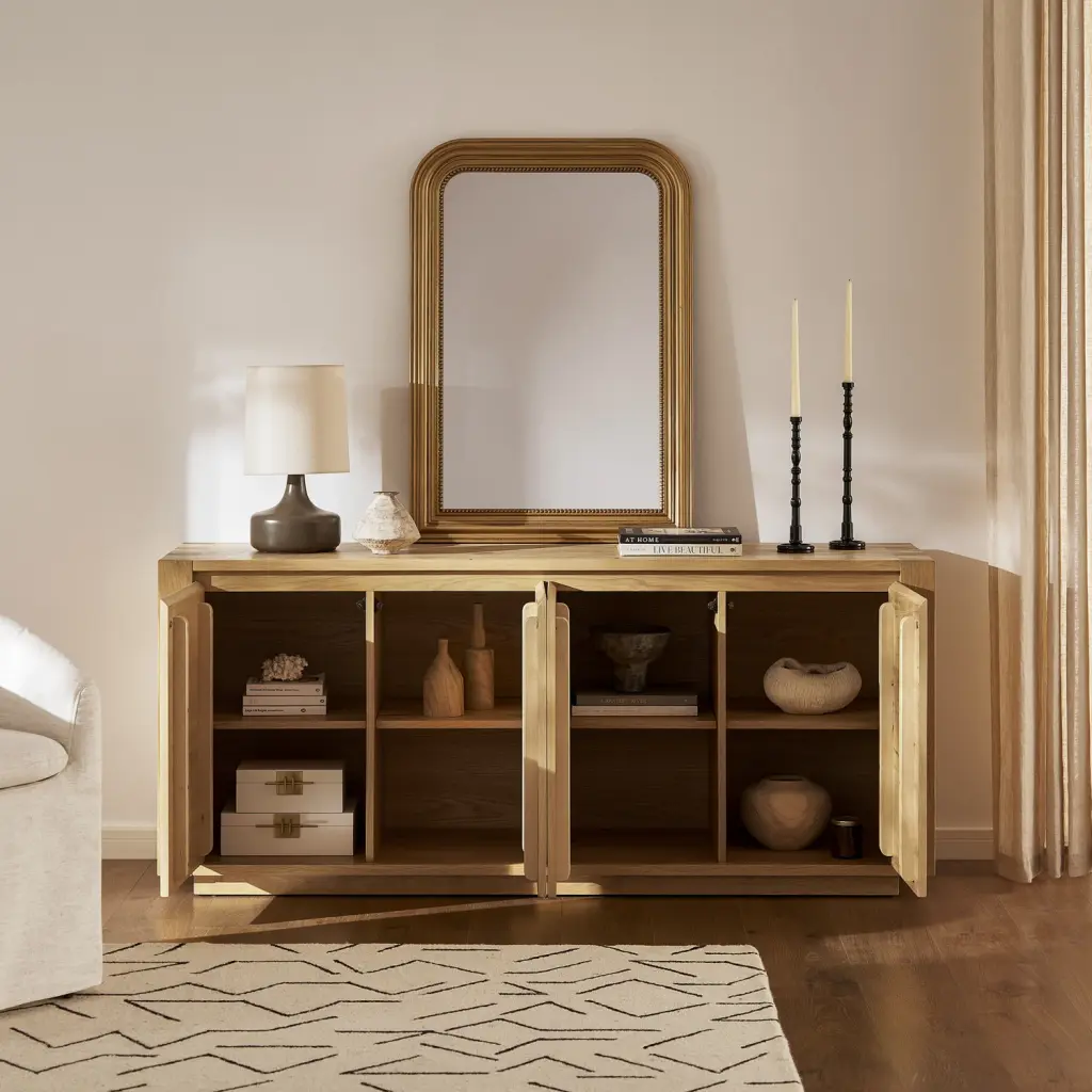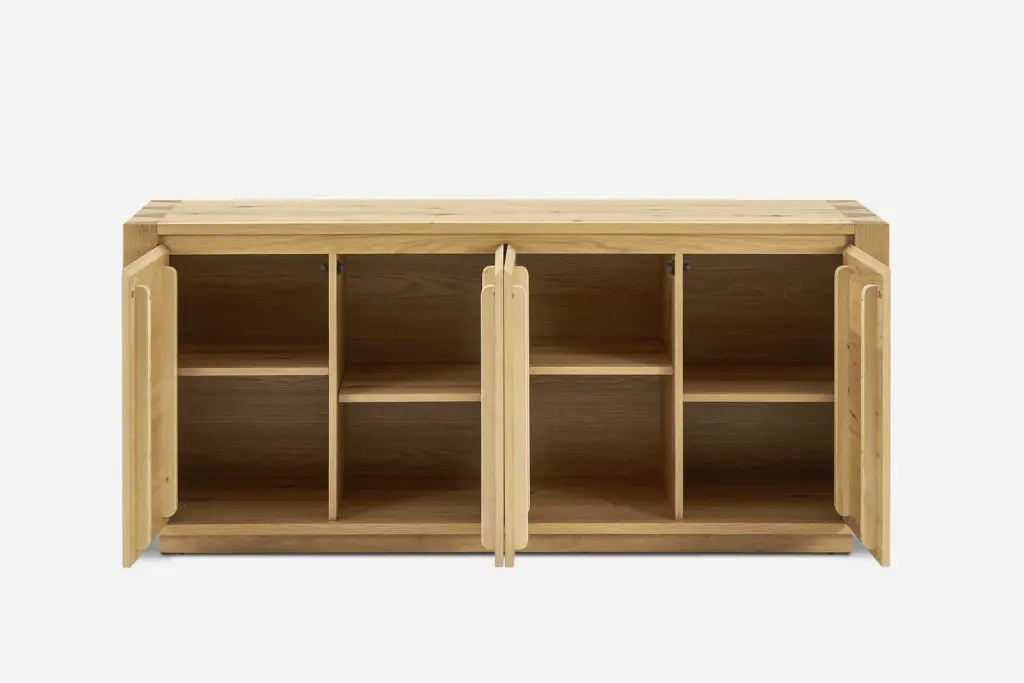 Boasting farmhouse appeal, the Bradley Sideboard celebrates the rustic charm of wood, with doors that open to access adjustable shelves.