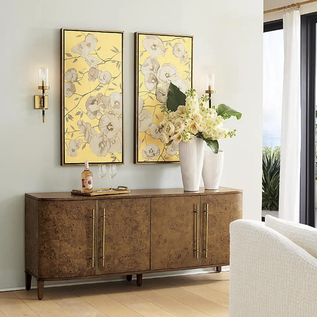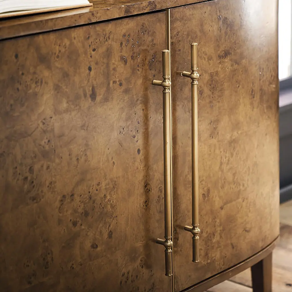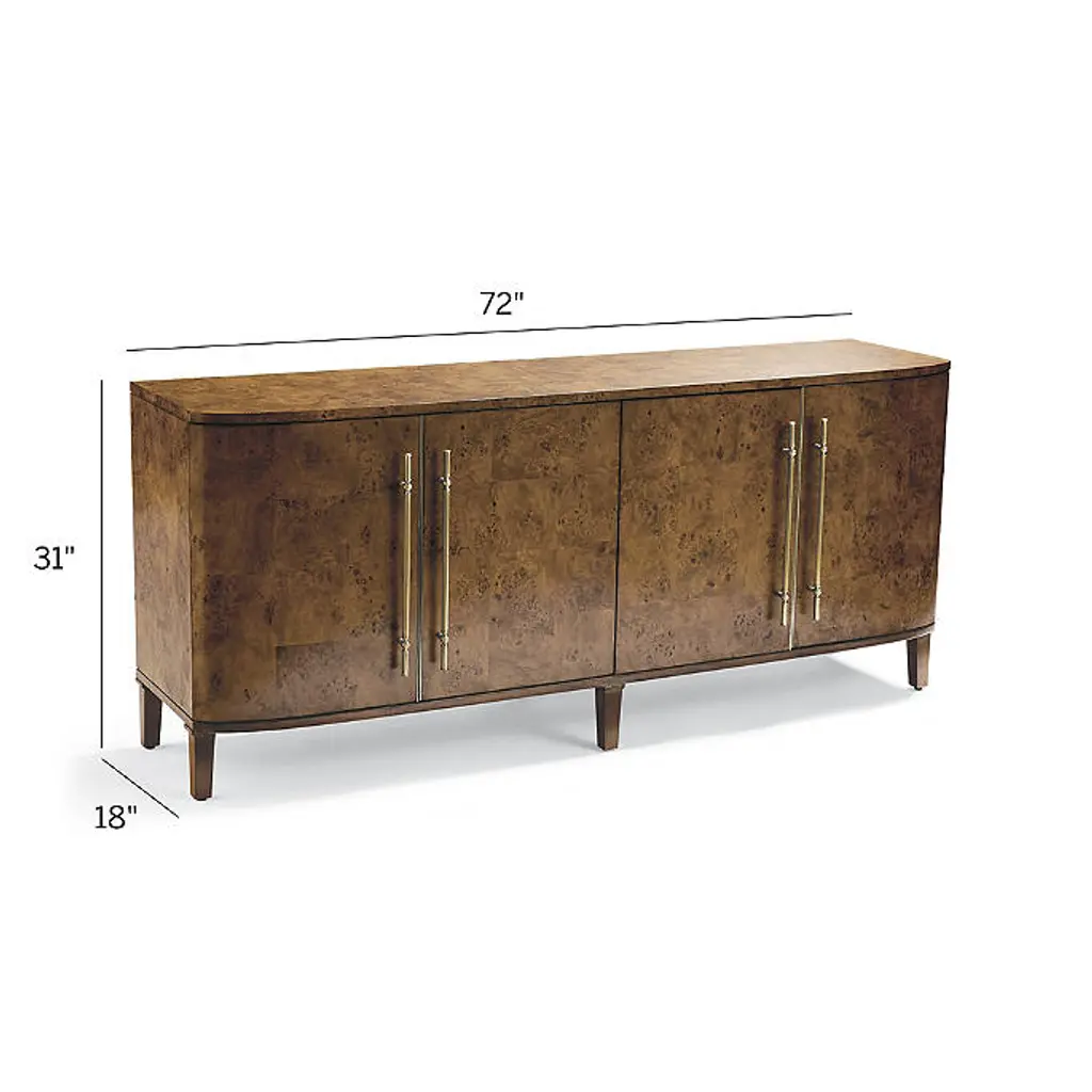 With its gently curved silhouette and burlwood exterior, our timeless Brando Collection elevates the look of any room while providing plenty of storage and serving space. Crafted of mahogany hardwood and engineered wood with Mappa burl veneer, this classic sideboard features curved front doors that open to reveal ample storage for bottles and barware. It also has a convenient built-in power strip with a USB port. Crafted of mahogany hardwood and engineered wood with burl veneer Russet, Coffee, or Fawn finish Antiqued burnished brass-finished hardware Long door pulls Soft-close doors with adjustable hinges to ensure cabinet door alignment Two adjustable and reversible wine shelves Power strip on the back includes two outlets and one USB port Adjustable hinges on doors Adjustable feet for leveling Arrives assembled Included anti-tip kit is required for installation; kit consists of safety-tested mounting hardware, a nylon strap and instructions To prevent injuries from furniture tipping over, this item must be permanently affixed to the wall; professional installation is recommended To prevent injuries or damage to item, recommended team lift (two or more people) for furniture placement Coordinates with the Brando Bar Cabinet and Brando 3-piece Coffee Table A Frontgate exclusive. At Frontgate, our primary focus is quality. We guarantee that every product we sell will stand up to the supreme test – our customers' satisfaction. To learn more about our policies, visit our Shipping & Processing, Returns & Exchanges and Warranty & Price Guarantee pages.