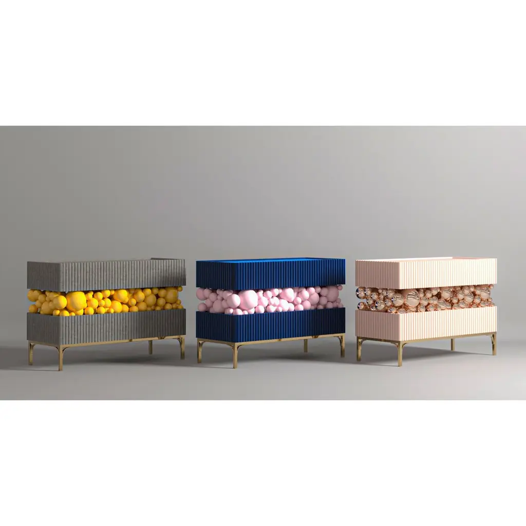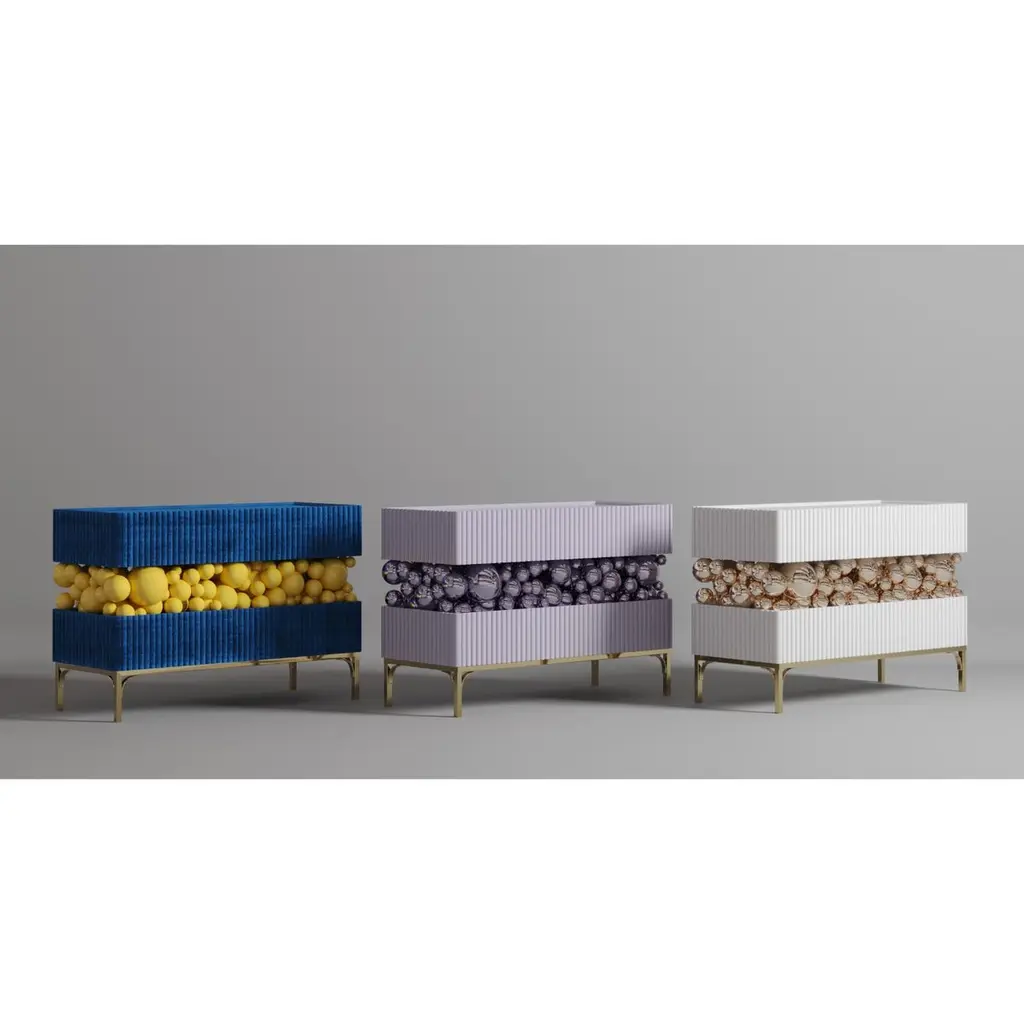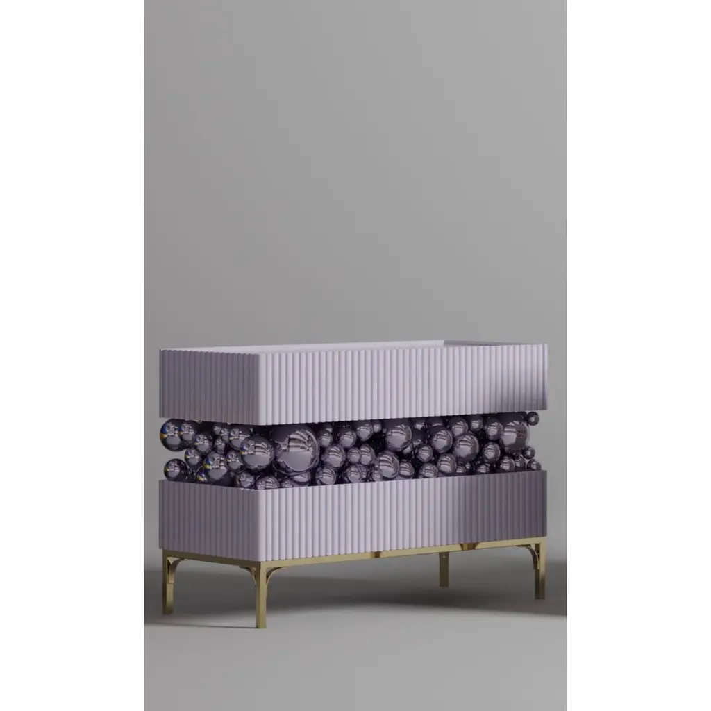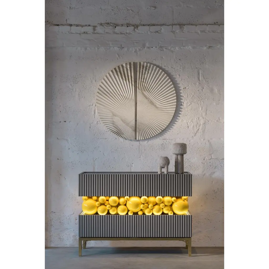 Brass And Gloss Paint Bubbles Decorative Sideboard by PANOPTIKUM COLLECTIONSDimensions: D 50 x W 120 x H 85 cm.Materials: MDF, brass, gloss paint, and LED lighting.The “Bubbles collection” is an emotional design that appeals to our inner child. It is inspired by childhood excitement, provoked by the first reaction to rainbow-colored soap bubbles and pink bubble gum.Colour palette: pastels and pure, rich colors and textures, gloss and mattecoating of the facades.An airy array of the «bubbles» masking the load-bearing console between the two functional zones of the cabinet creates a dynamic contrast of shapes, like a layer of puffy cream in a cake. Due to its height, the item can function as a sideboard or TV console.PANOPTIKUM COLLECTIONS is proof of the feasibility of the materialization of ideas, even the most unusual ones, which were embodied in astonishing yet functional interior objects. We created this platform for experimentation with design objects, ideas, materials, shapes, and textures. This is a real collection of unusual objects, each of which was once just a reckless idea. The most expensive ideas are those whose implementation requires not only material resources but also courage, intuition, and skill.