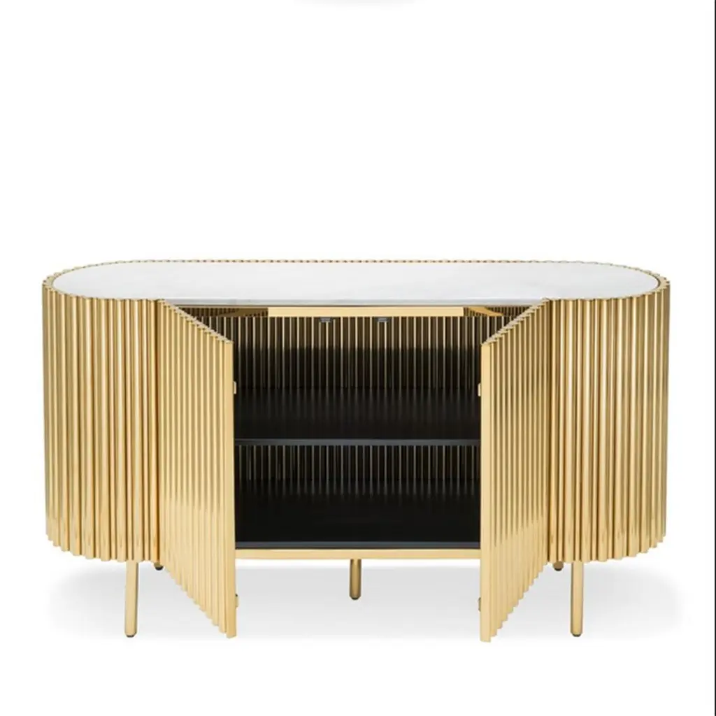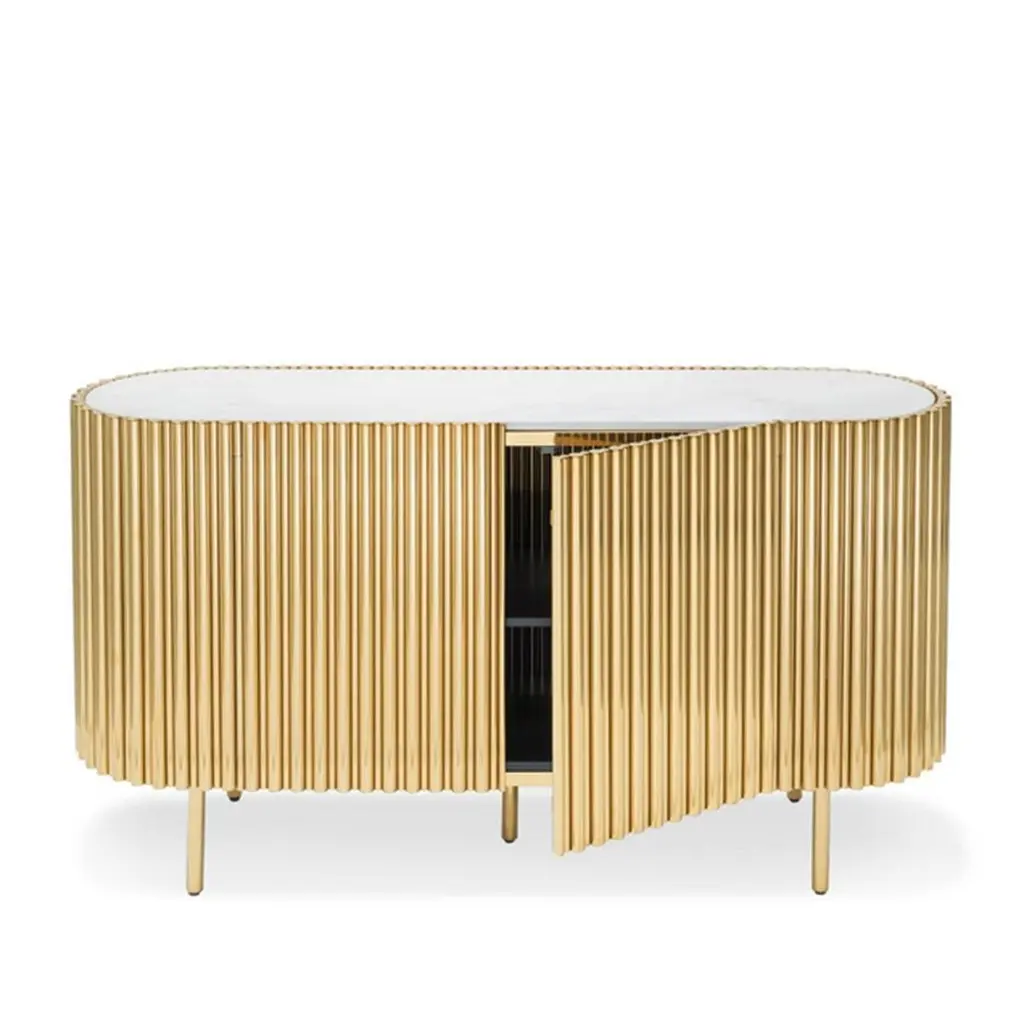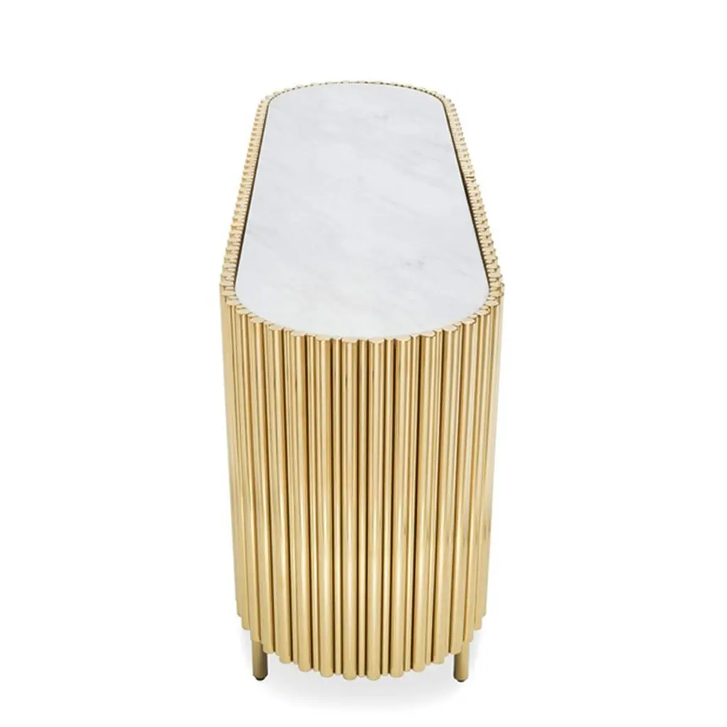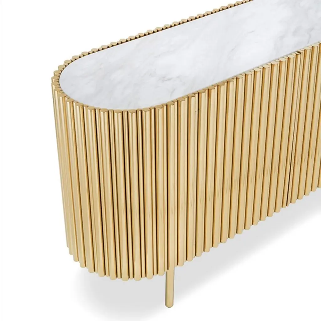 Sideboard brass tubes white oval with steel structure in goldfinish and with white resin marble top. With 2 doors and 1 shelf.