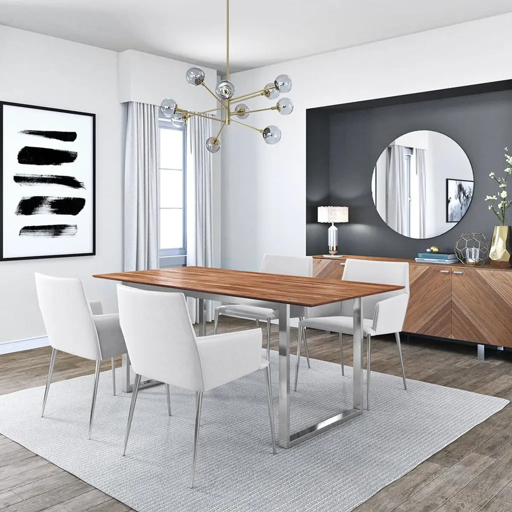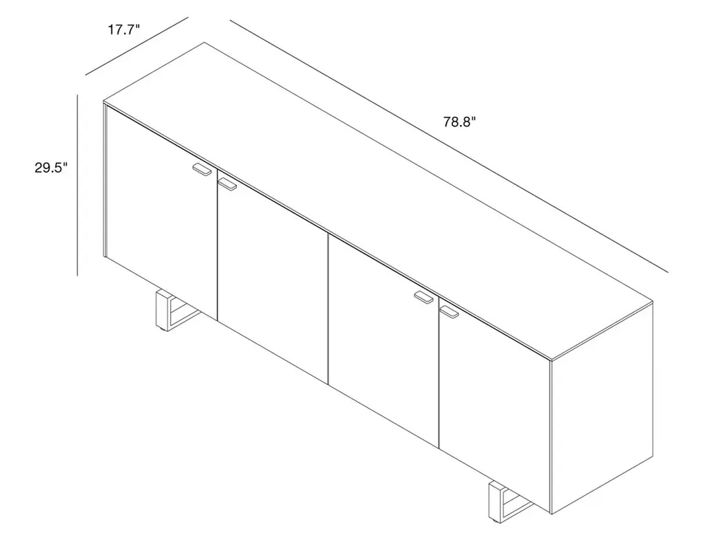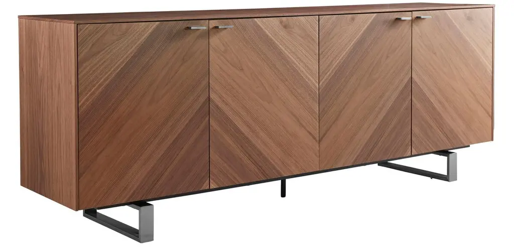 The chevron pattern of the walnut veneers on the four door fronts adds a sophisticated note to this clean-lined sideboard. The brushed stainless-steel legs and handles are a cool complement to the warm wood. More than six feet wide, with shelves behind the doors, this sideboard offers a wealth of storage space.