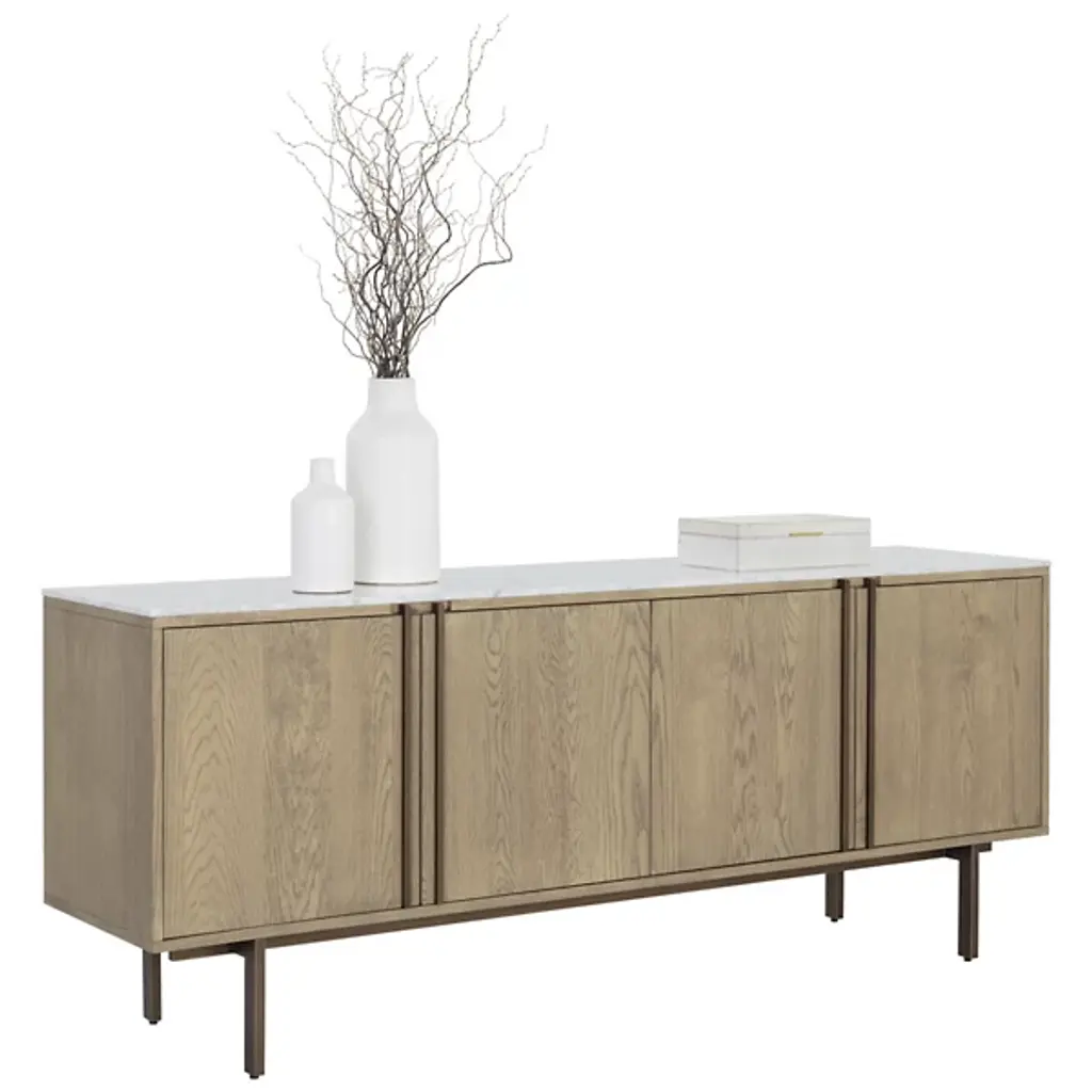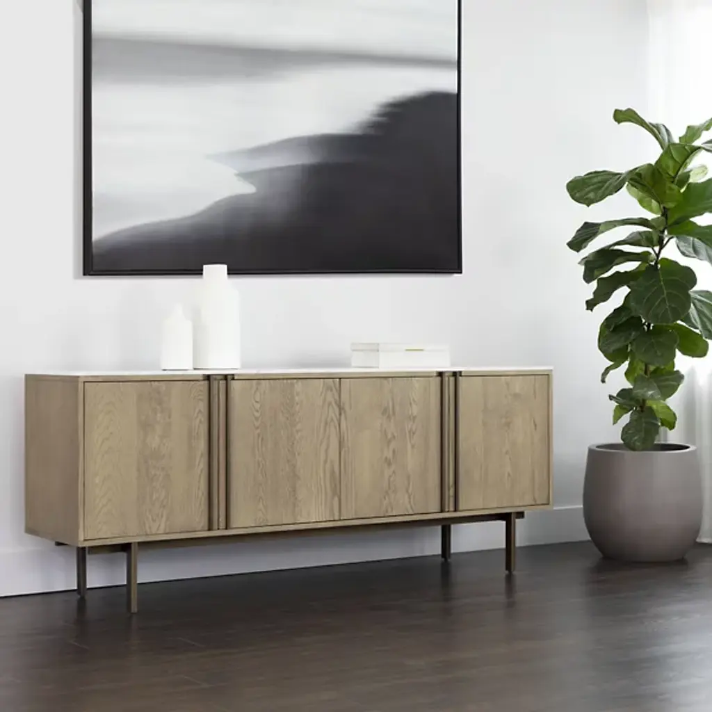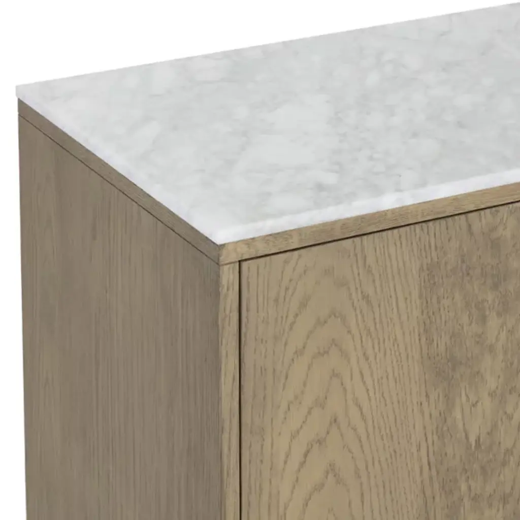 The Briar Sideboard from Sunpan blends mid-century and modern design elements, creating a striking piece that enhances any space. Constructed with a solid oak wood frame, it’s topped with a stunning white marble surface that exudes timeless elegance. The piece is completed with a sturdy metal base and hardware in an antique brass finish, adding a touch of vintage charm. An anti-tip kit is included for added safety. As a natural material, the marble showcases unique veining, pitting, fissures, micro-cracks, and color variations, making each piece unique.