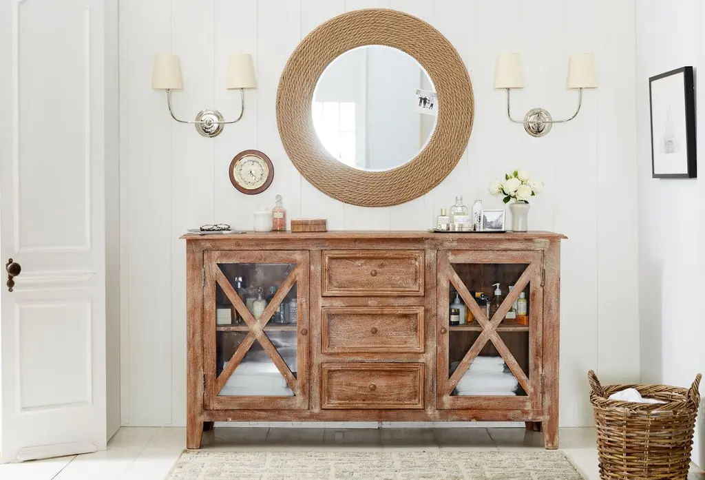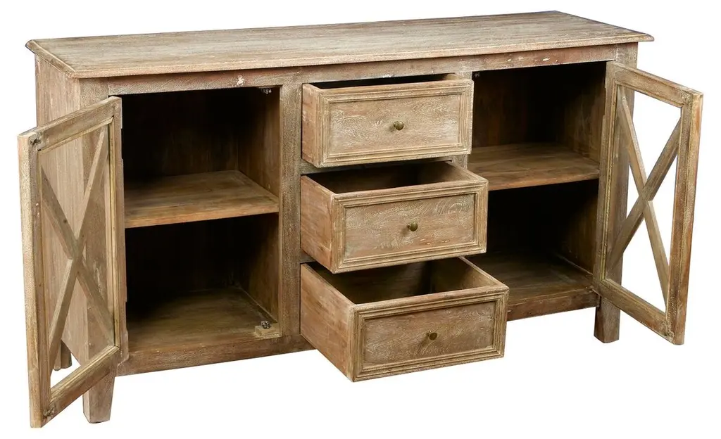 An artfully distressed sand finish gives this handcrafted sideboard rustic charm. With three drawers and shelves behind its two glass-front doors, it provides a wealth of storage and display space.