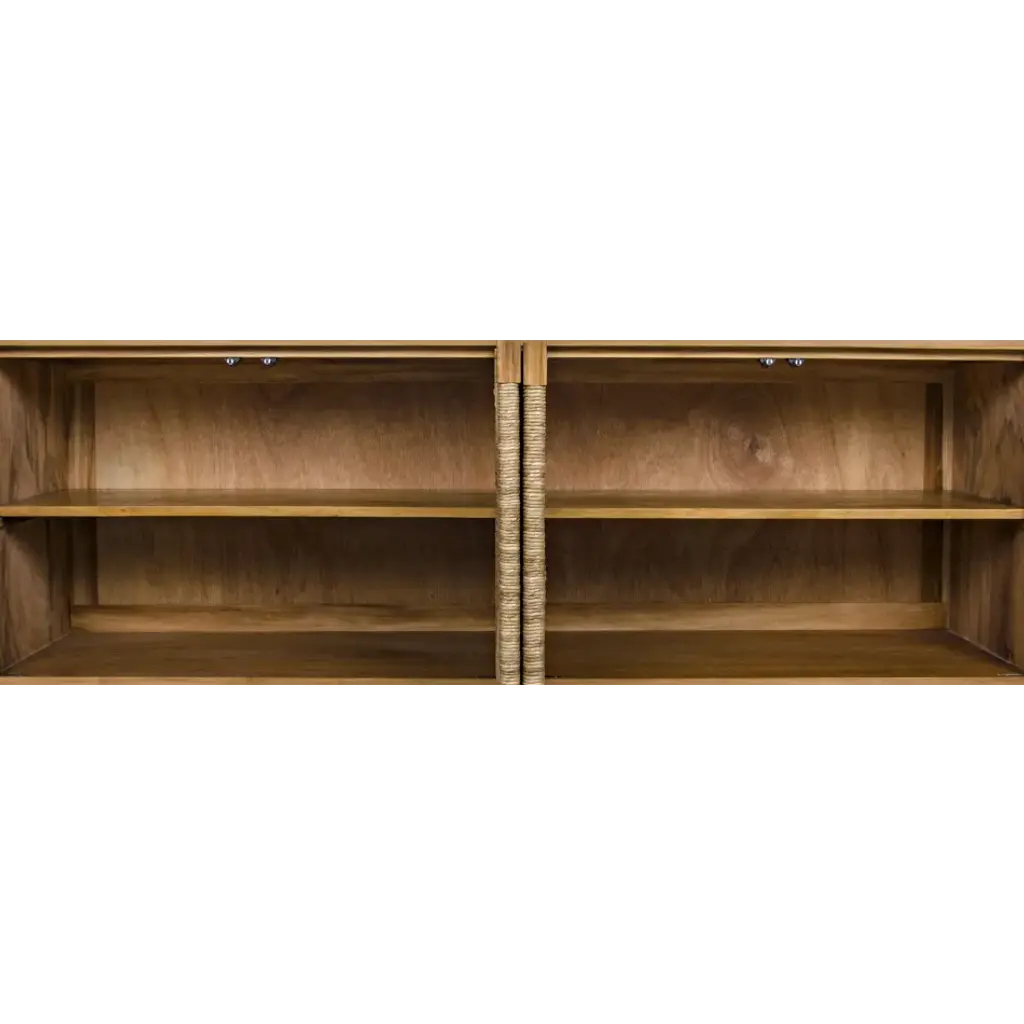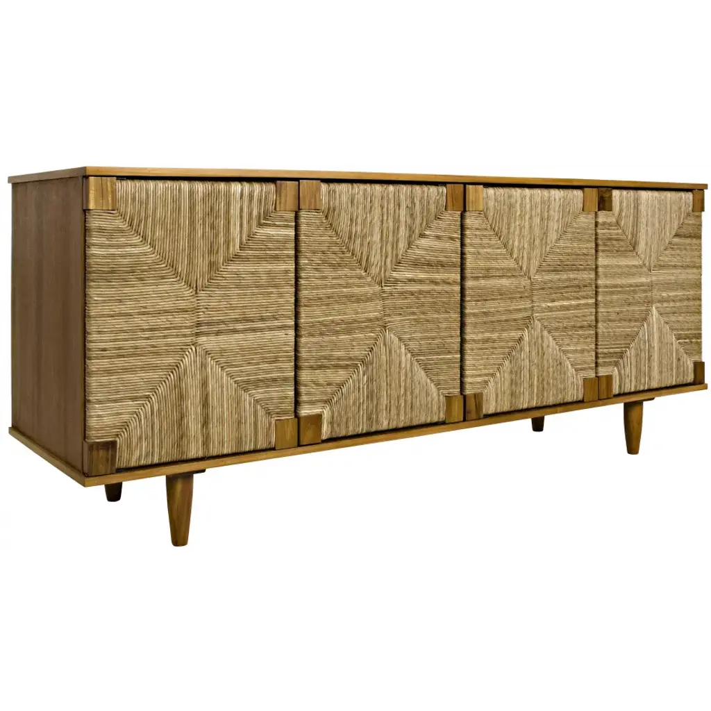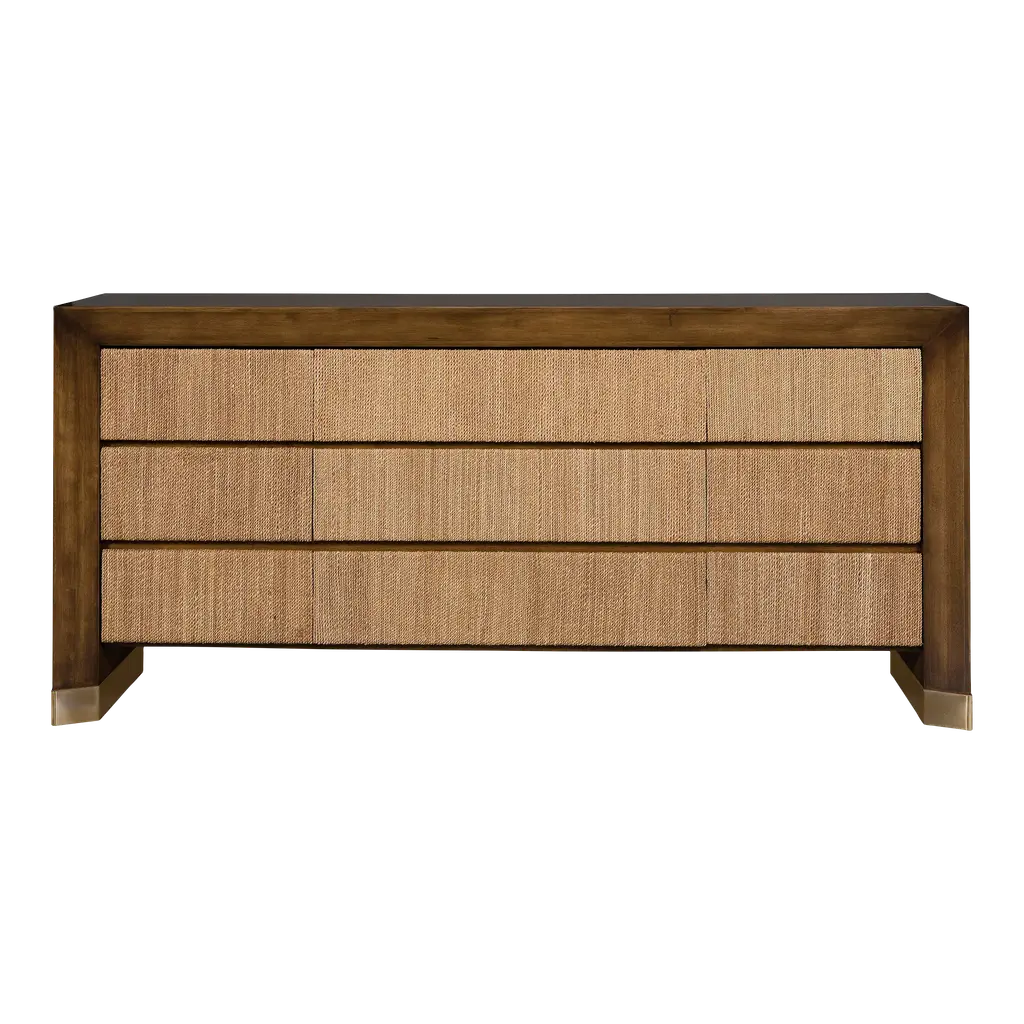 Solid mahogany pairs beautifully with natural sea grass in this updated classic. Designed to provide for maximum display space across the mahogany top, it also features two generous lower compartments with one fixed shelf each.