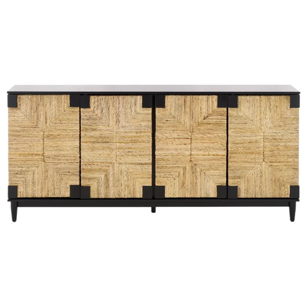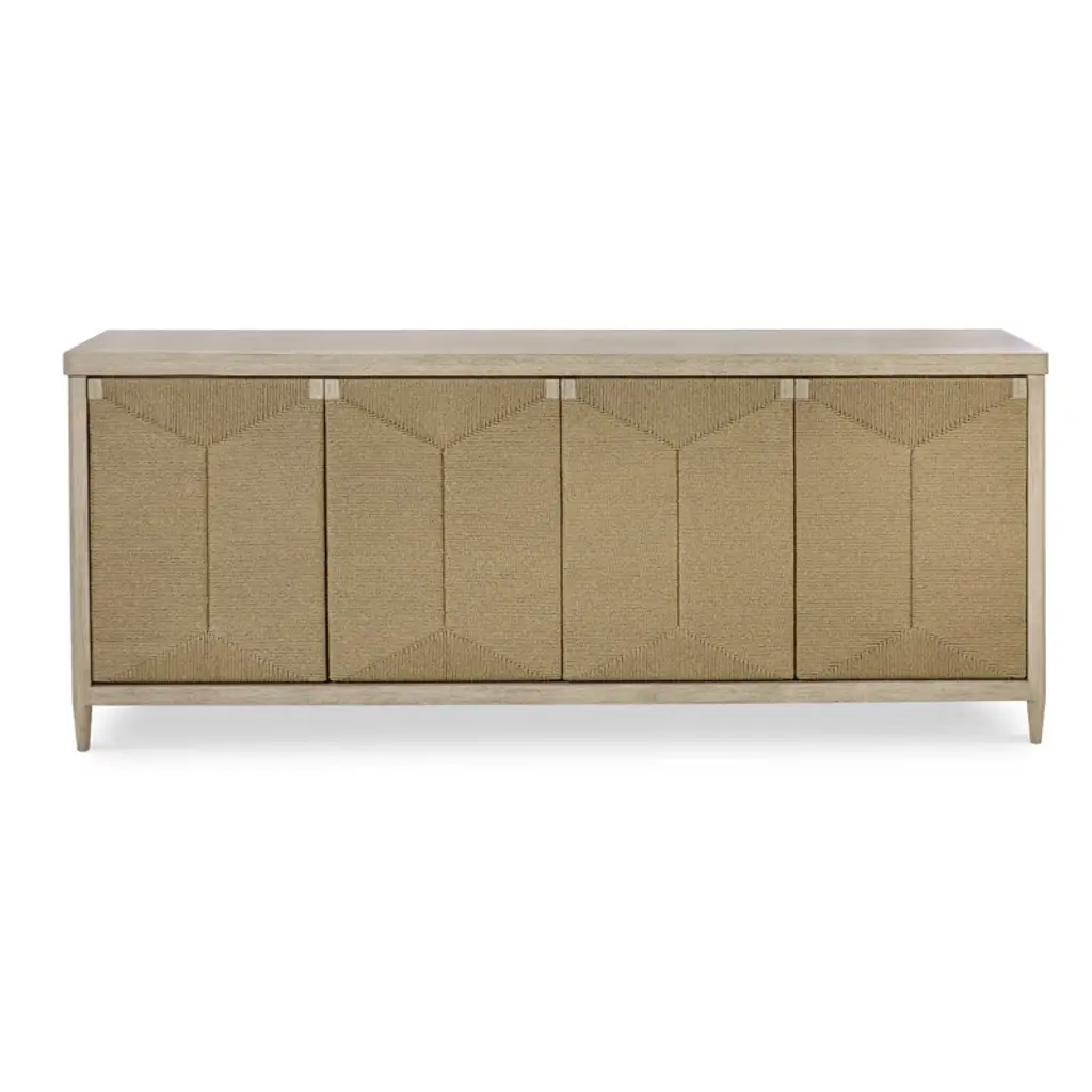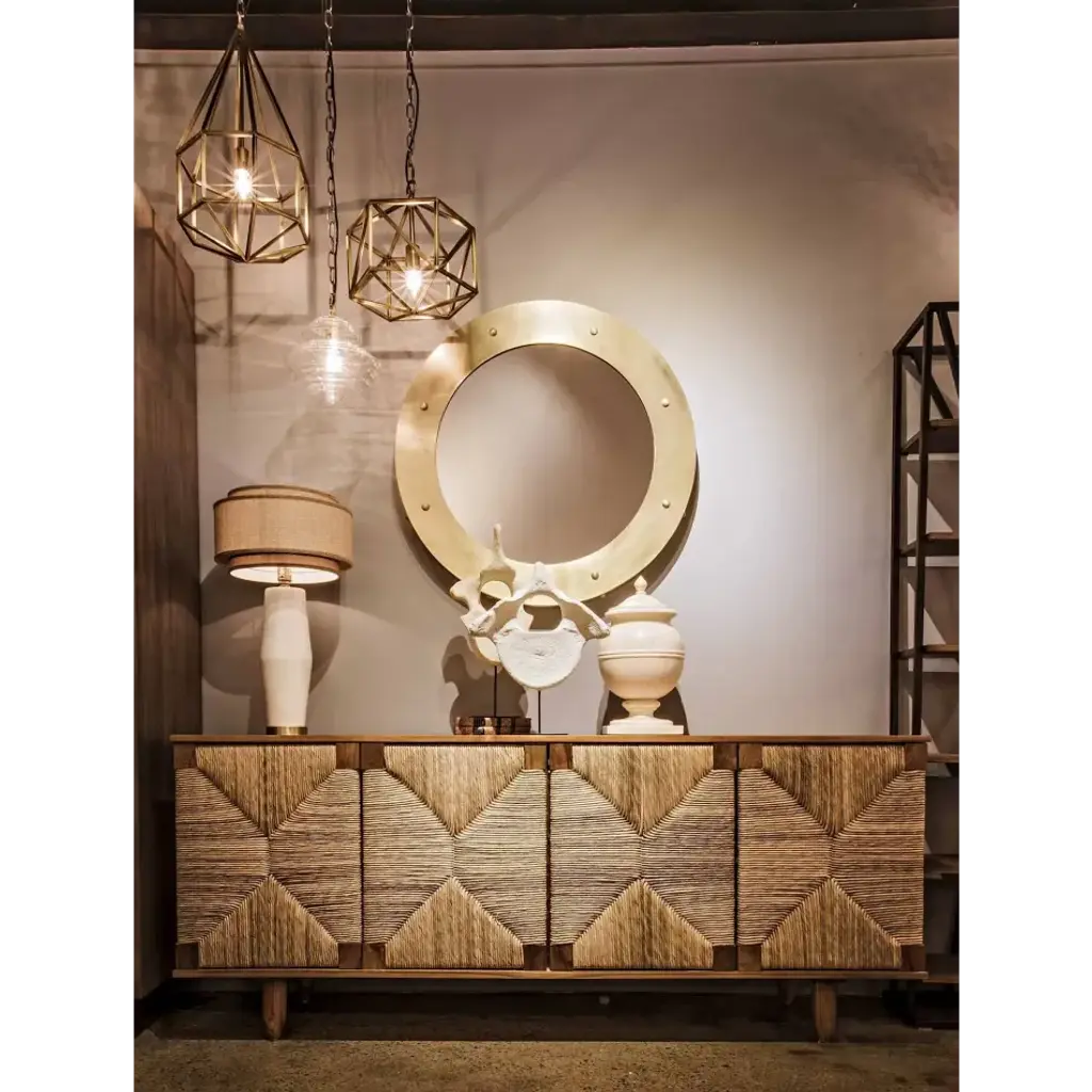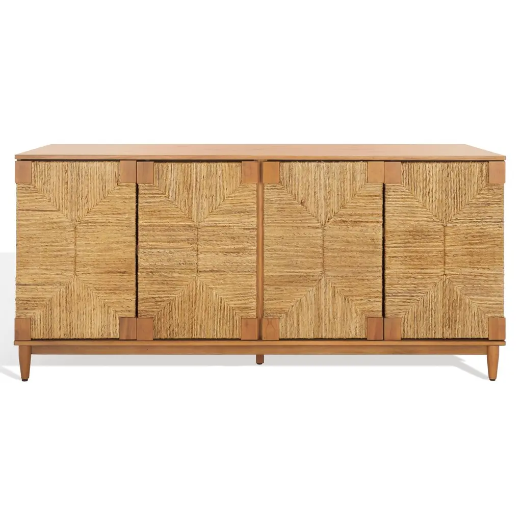 Solid mahogany pairs beautifully with natural sea grass in this updated classic. Designed to provide for maximum display space across the mahogany top, it also features two generous lower compartments with one fixed shelf each.