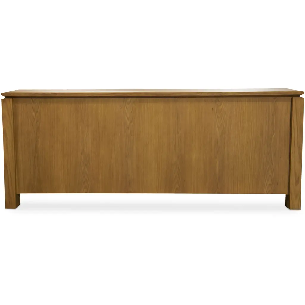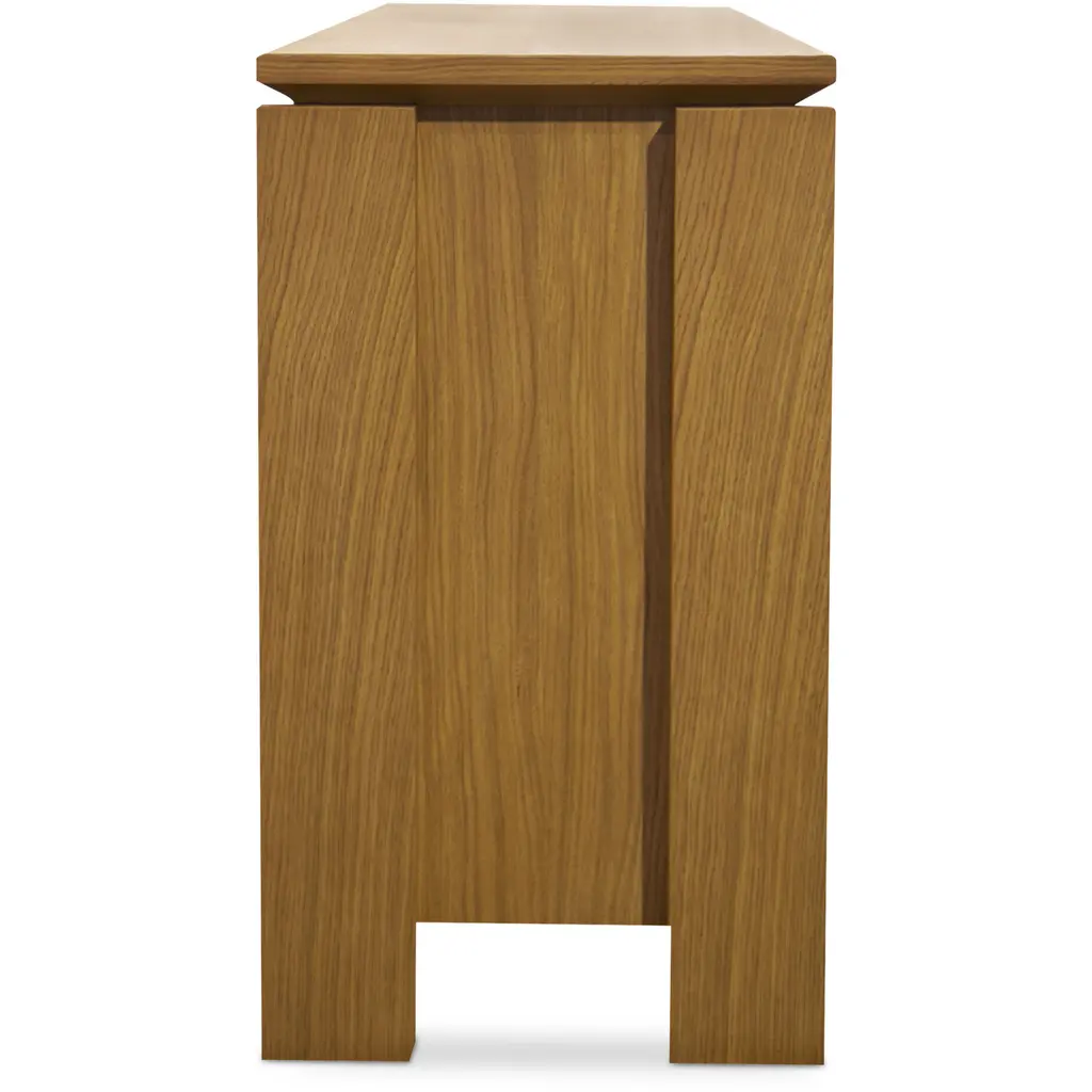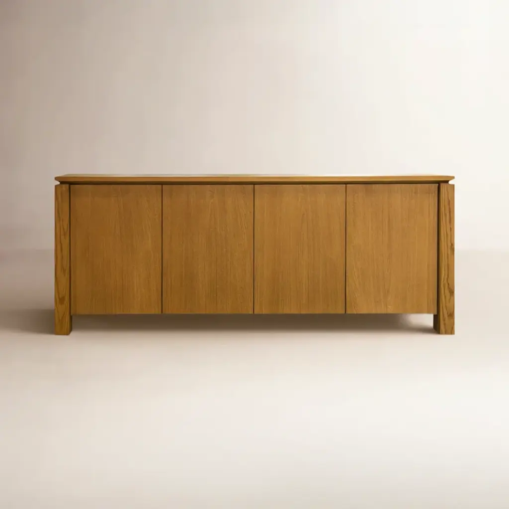 The Brook sideboard blends a blocky silhouette with a visually light, undercut top that appears to float on its strong, thick legs. Crafted from solid oak and clean oak veneer door fronts, its mid-tone brown oak finish, enhanced by wire brushing, offers a rustic flair that complements various interior styles.