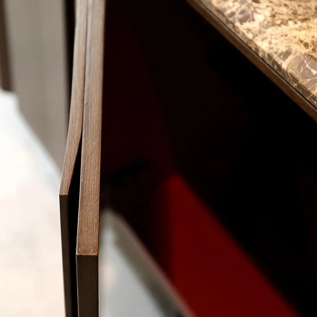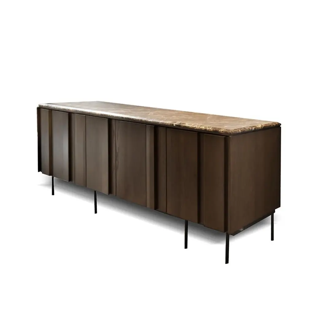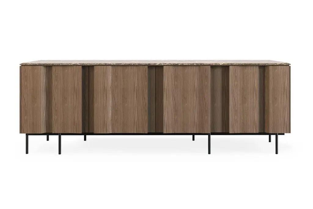Bryant sideboard by CollectorMaterials: Marble top. Oak wooden doors and structure. Legs in metal with a painted finish. Lacquered interior.Dimensions: W 202 x D 50 x H 72 cm Also available in walnut.A series of vertical lines runs from top to bottom shaping the fluctuating alignment of the doors and creating a game of light and shade trough the wooden panels. The polished marble top and the solid and unconventional minimalist metal structure gives Bryant sideboard it’s strong personality.The Collector brand aims to be part of the daily life by fusing furniture to our home routine and lifestyle, that’s why we’ve designed our pieces with the intention to embrace diverse styles and to blend in inside anycontemporary setting.Described by our motto: “built to fit a good idea.”, this wide range of product typologies were designed to work in diverse layers of importance. It can work as a center piece of the house, with strong personality or just complementing the background by gently blending in. The result is a clean-lined furnishing collection that can easily be customized to work specifically and according to each unique need, reflecting essentially our traditional methods of furniture manufacturing with accurate industrial production methods.We strive to achieve the best quality possible by selecting the best materials and by the constant development of our production processes and manufacturing partnerships.