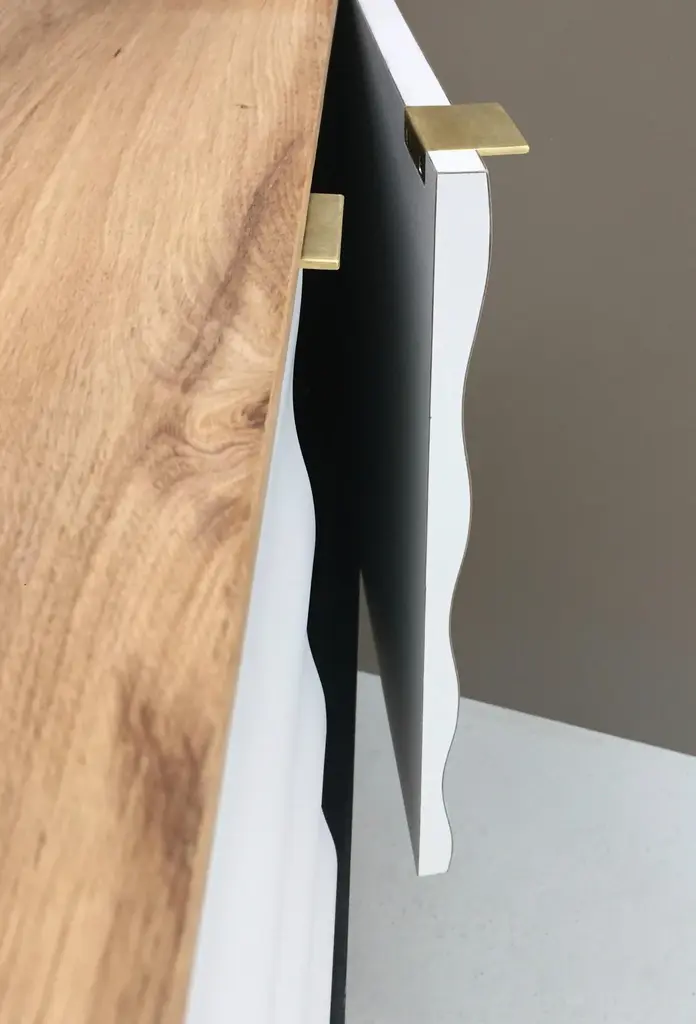 The Buckhurst sideboard is hand-made to order in birch plywood veneer. It features two hand-shaped and veneered doors, alongside three full-depth drawers. The drawer fronts are made with the end grain from OSB, giving it a unique look. This piece also features hand-cut and shaped brass handles. The Buckhurst sideboard is available in different dimensions and colors, Imprinted by Maker,Numbered Imprinted by Maker,Numbered,Imprinted by Maker,Numbered