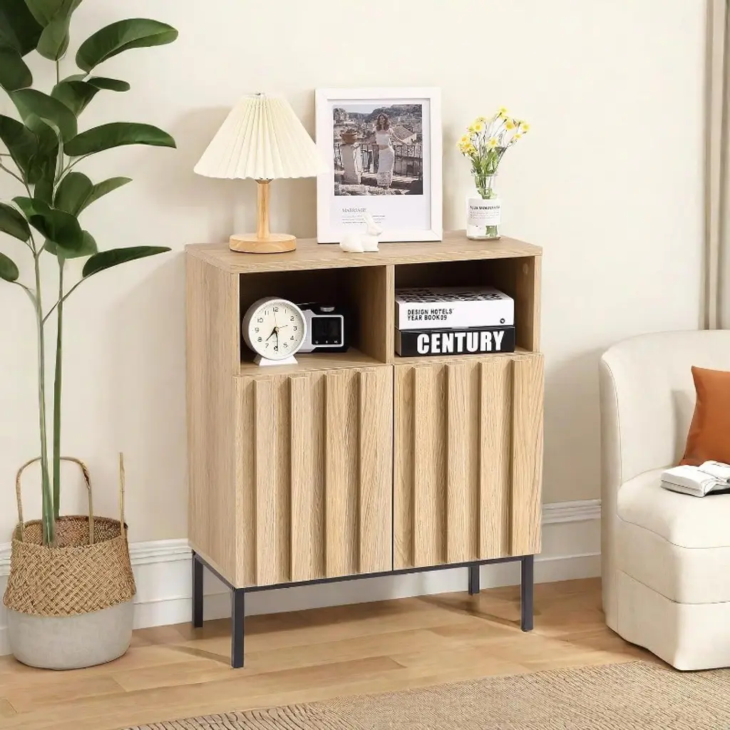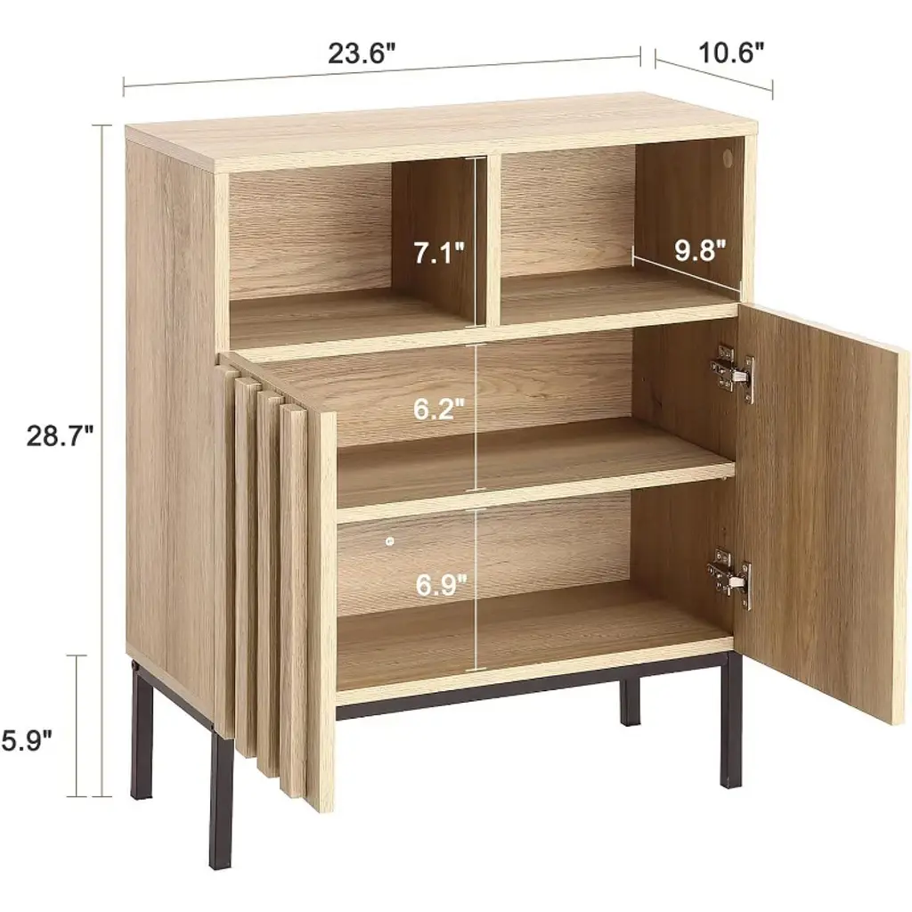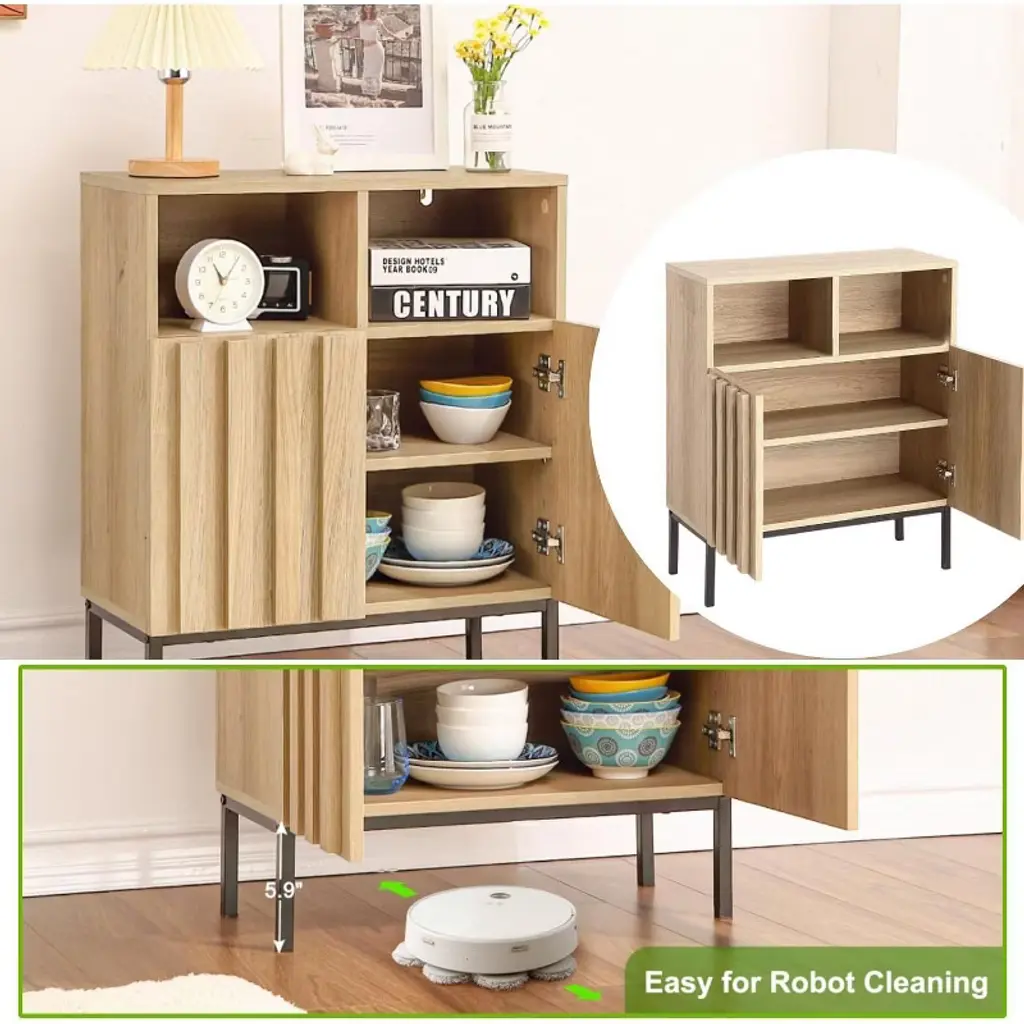 Eye-catching Design: Combining the sturdiness of iron with the warmth of oak-effect veneer, this storage cabinet exudes both modernity and vintage charm. Decorative wood slats on the cabinet doors add a touch of natural simplicity, instantly making it a focal point in any home decor. Flexible Storage System: With three adjustable shelf heights, the interior offers versatility to accommodate a variety of items. The 2-door accent cabinet integrates both open and closed storage functions, allowing you to showcase your collections or hide clutter, showcasing flexibility in space utilization. A Versatile Home Companion: Suitable for living rooms, foyers, bedrooms, dining rooms and dens, this cabinet blends into any environment. Whether used as a standalone sideboard buffet or combined with a TV stand, it effortlessly adds functionality and aesthetics to your living space. Elevated Design, Effortless Cleaning: With its sturdy, raised iron legs, the entryway cabinet not only provides stability, but also creates ample space underneath for robotic vacuums to glide effortlessly. Durability Meets Aesthetics: Crafted from ironwork and oak-effect veneer, this storage cabinet embodies both durability and beauty. The ironwork construction provides sturdy support, while the oak-inspired veneer adds a natural touch.