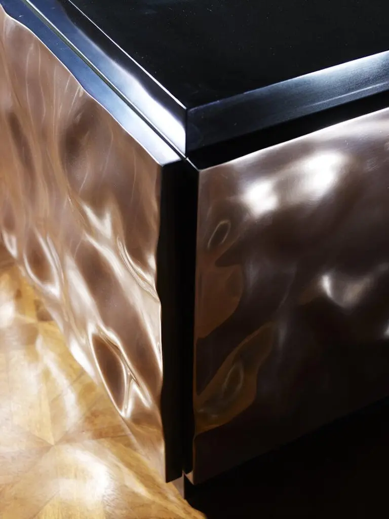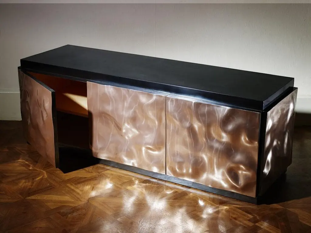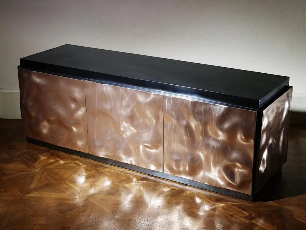 Bumper is a sideboard with three doors. By combining two materials (the pink copper of the doors and the deep black of the oxidized zinc top with its bluish glints) and two textures (the bumpy appearance of the doors and the smoothness of the top), the artist has created a study in contrasts that changes with the light. Each of the three compartments has a shelf.Dimensions : L 150 cm x H 55 cm x D 45 cm // L 59 in. x H 21.65 in. x D 17.7 in.Limited edition of 8 - Made To Order (production time: 20 weeks)Over nearly 20 years, French artist Frédérique Domergue has created a unique body of work based on combinations of metal and rare wood species. She learned traditional woodworking and metalworking techniques from master artisans, and quickly developed her own skillful approaches, especially metal cladding which has become her hallmark.Frédérique Domergue uses thin sheets of metal that hug the contours of the wood (which she sometimes sculpts beforehand) to create a "second skin". The artist creates astonishing effects by transforming metal into a material that appears supple and elastic. She draws on her extensive expertise with a wide range of metals (bronze, zinc, titanium, steel, etc.) to achieve surprising results. She sometimes uses oxidation techniques that lend sheets of zinc or bronze warm, sensual hues that shift with the light. Her entirely hand-made pieces take on a patina over time as the unexpected alchemy of the materials reveals an array of subtle, distinguished tones. The passion that drives her, the curiosity that propels her toward new worlds and the care she brings to finishing her pieces have enabled Frédérique Domergue to produce a singular oeuvre that allies excellence, innovation, esthetics and audacity.