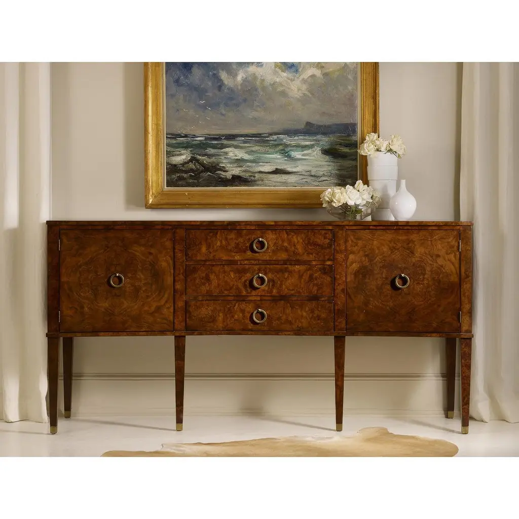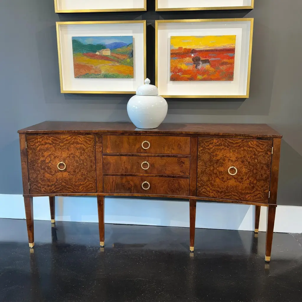 Crafted from exquisite walnut burl veneer, this masterpiece showcases rich, organic patterns that enhance any sophisticated space. The concave front adds a touch of architectural intrigue, while the tapered legs provide a refined silhouette. Designed for both functionality and style, this sideboard offers ample storage with three central drawers and two spacious side cabinets, all adorned with solid brass hardware for a polished finish.Perfect for grand dining rooms or luxurious living spaces, this statement piece seamlessly blends classic craftsmanship with modern appeal. Whether used as a serving station, media console, or storage solution, the Burl Wood Sideboard is an enduring investment in beauty and practicality.Dimensions: 80" W x 22" D x 40" H