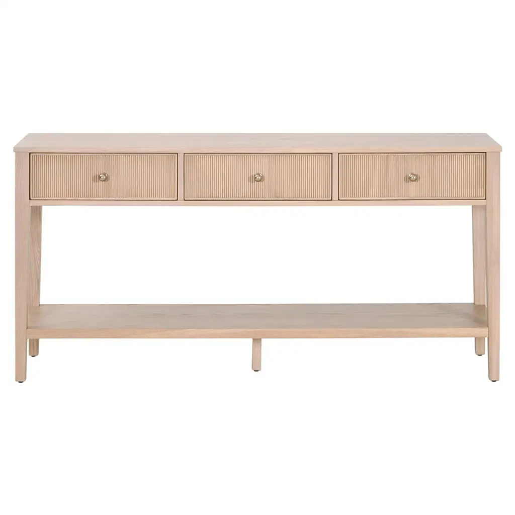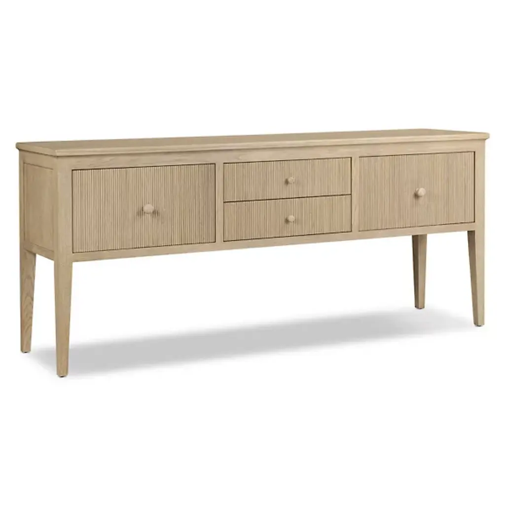 A design collaboration by Amber Lewis and Four Hands. Reeding-paneled drawer fronts add depth to this tall, spacious sideboard inspired by Swedish antiques. Tapered legs complement a unique storage format, with two large drawers flanking two smaller stacked drawers in the center. Crafted from dark, distressed oak and accented with simple antique-style wooden hardware.