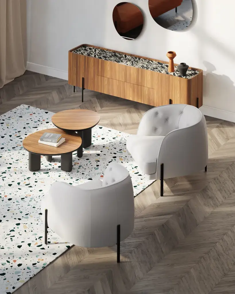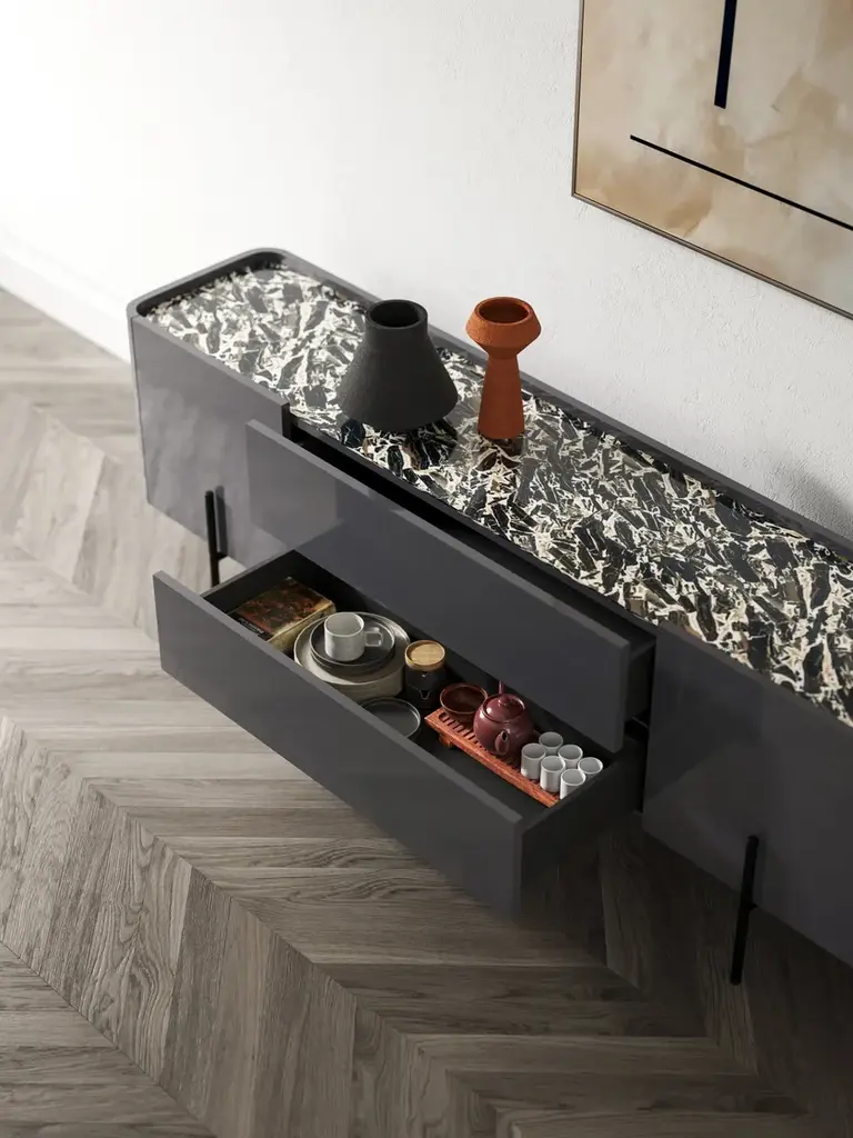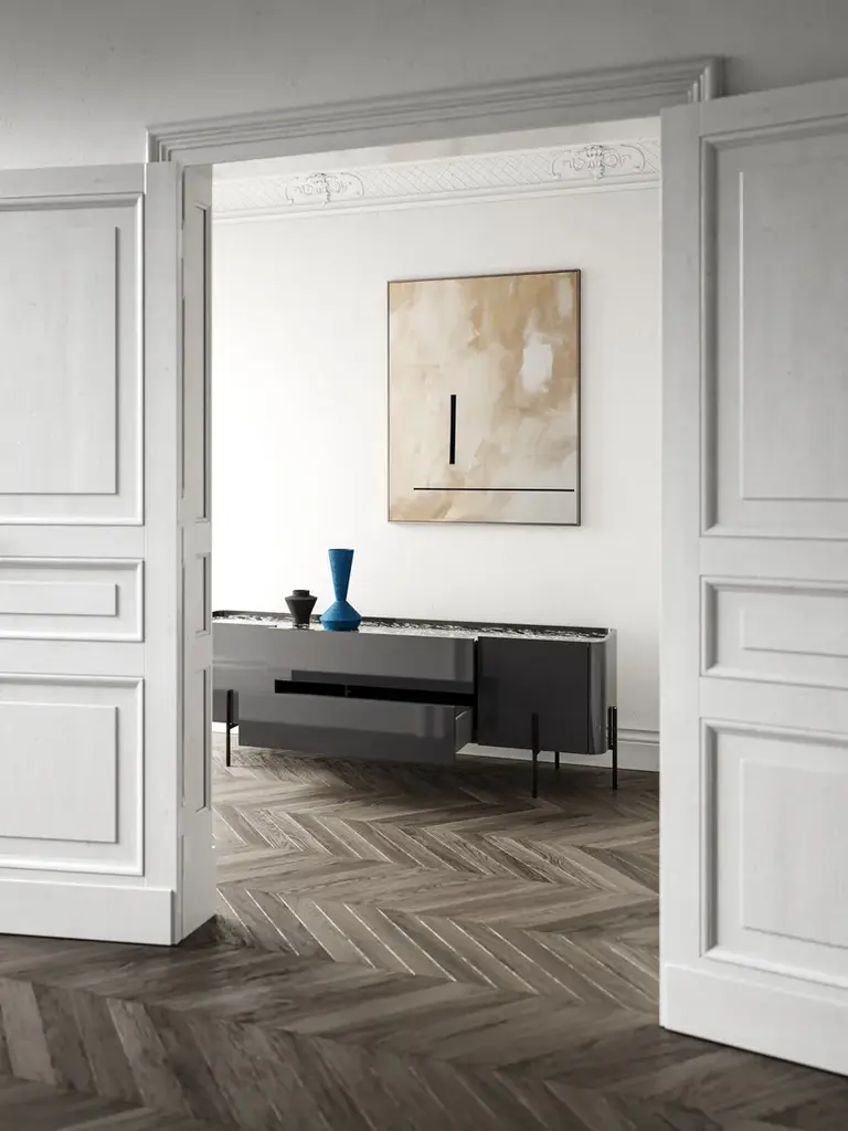 Caillou is a sideboard with drawers.Sides: hot bent plywoodStructure, doors and front: chipboard wood panel veneered with Natural Ash, Carbon Ash, Canaletto Walnut, Thermo Treated Walnut or glossy, matt or metallic lacquer in the finishings in the collectionBase: steel in the metal finishings in the collection, adjustable tips and decorative metal element in a golden plated finishTop (optional): 6 mm thick rear laquered glass or 6 mm thick ceramic in the effects in the collectionThe rounded shapes are set in a metal structure and are transformed into a precious detail that outlines the unique and unmistakable aesthetic of the Caillou sideboard. Equipped with central drawers, they expand the possibilities of placement in different rooms of the house. To complete its versatility, a further refinement: a ceramic or glass top, to be chosen from the 40 possible variants in the collection. As with all the products in the LJL collection, the Liu Jo brand affirms its character thanks to the presence of the unmistakable golden capsule positioned at the end of the black tubular.From the creative vision of Liu Jo was born the custom-made living room. Craftsmanship, versatility, style and sustainability come together to enter the world of home and transform the furniture. Liujo’s living collection is a declaration of intent: new forms and customizable materials open the space to new reading keys and give life to unique pieces. The house is dressed and changed to meet all the needs of everyday life detaching from the classic nomenclatures and running on elegant lines, delicate finishes, soft fabrics and customizable colors. Not only sofas, poufs or armchairs, but design with a strong identity, free, sectional and removable, with irregular and fresh shapes that revolutionize the environment. Recognizable and iconographic in ideas, shape and finish, the pieces of furniture by Liu Jo find their reason for being in contrast: structures and rigid elements are designed to contain and embrace curves and movements, enhancing personal style and easily changing position and function.