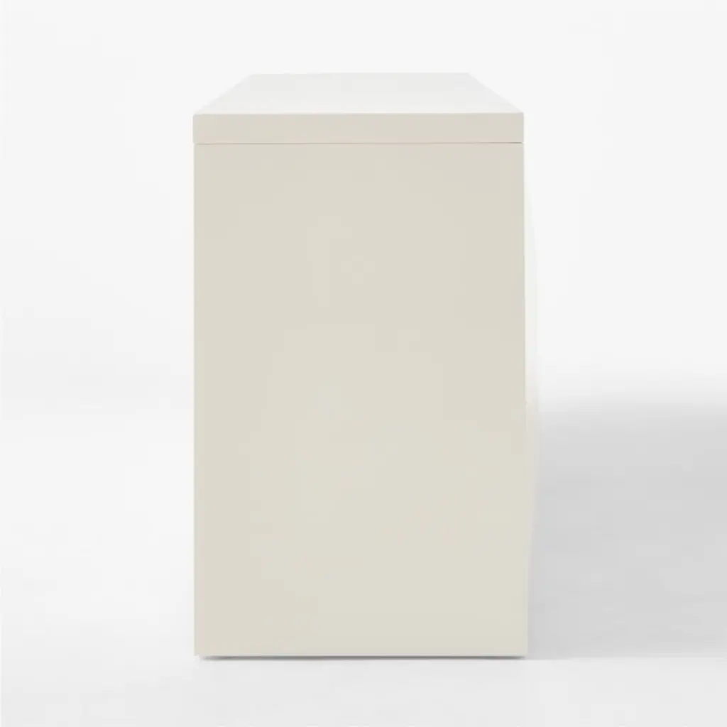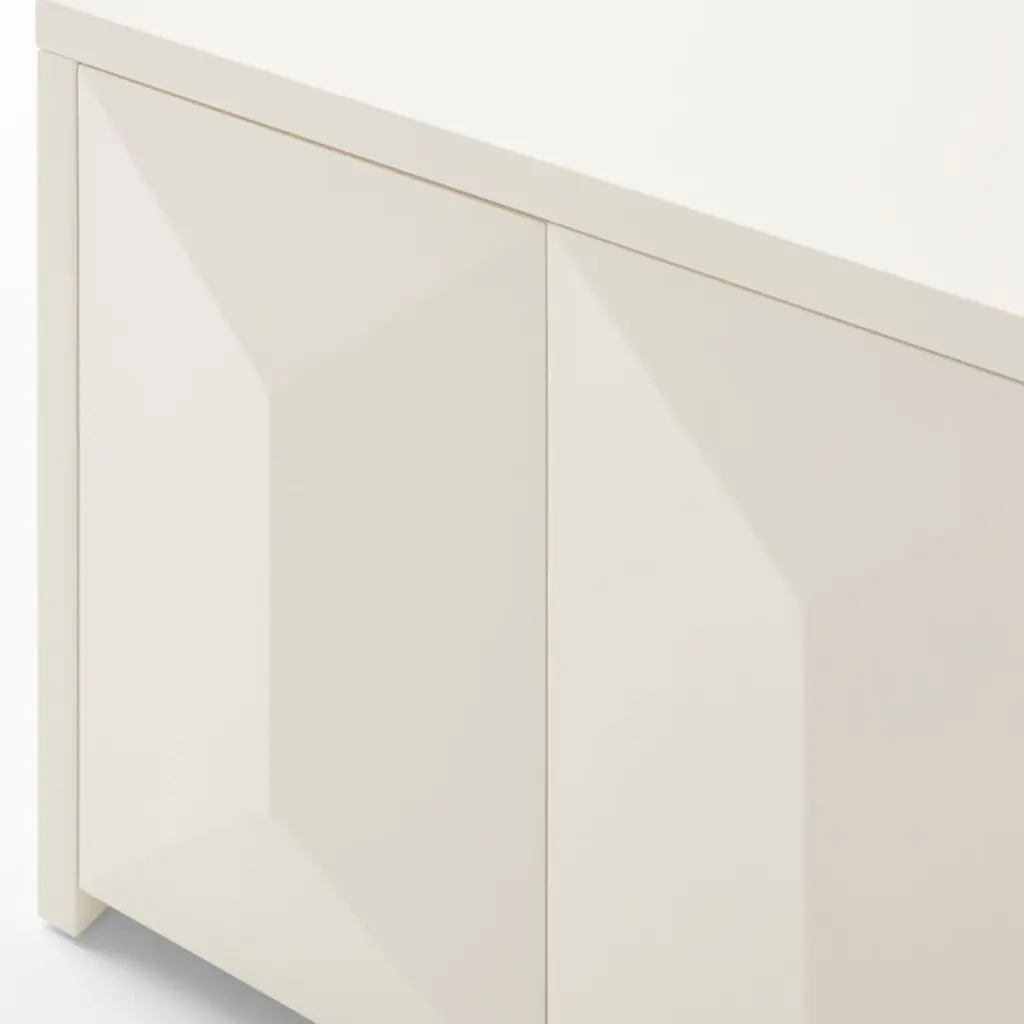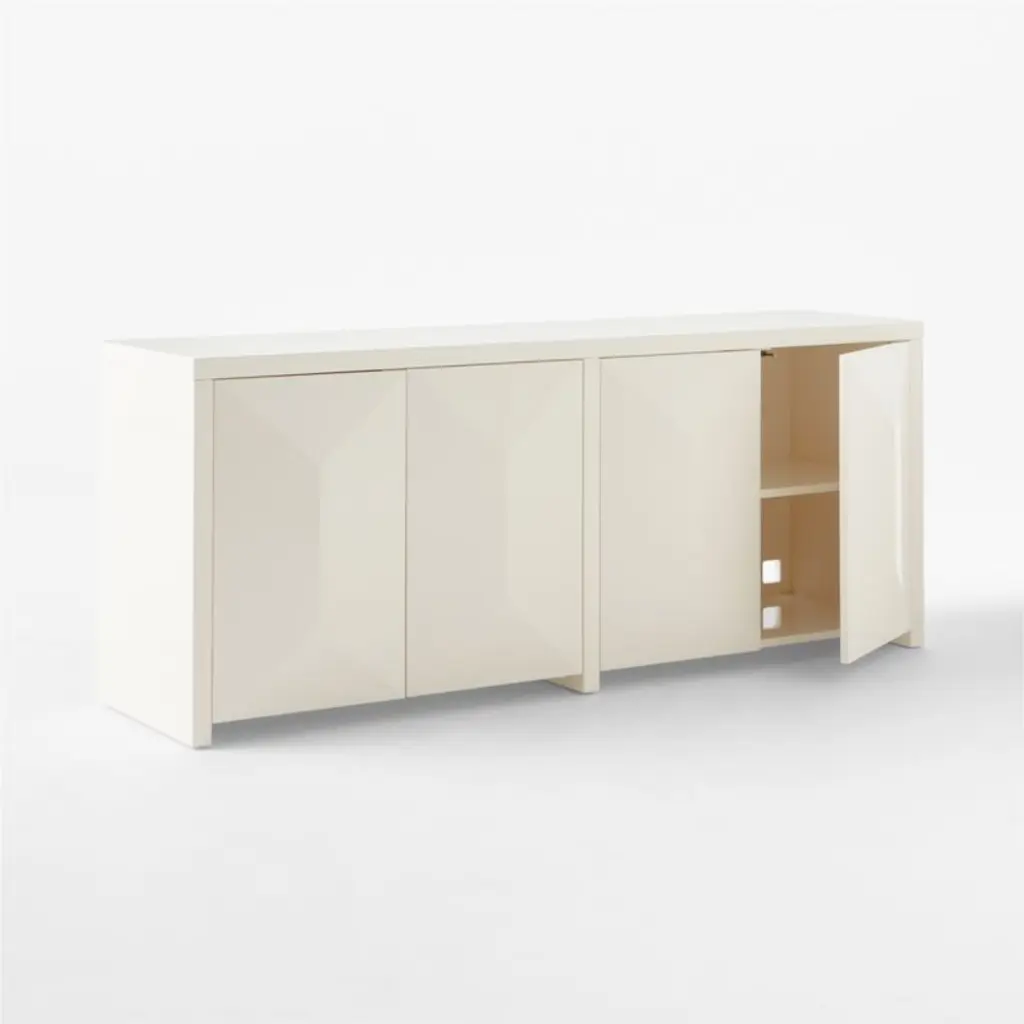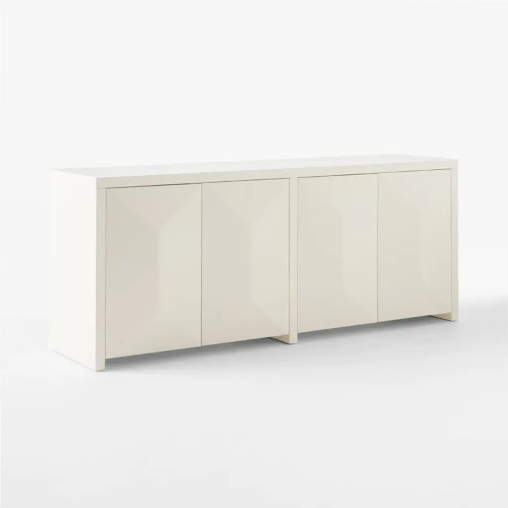 High-gloss ivory credenza by NYC-based designer Brett Beldock takes inspiration from the sculptural designs of Brutalism. The faceted front brings rich dimension to the design while cleverly concealing four push-to-open doors. Finished in a creamy white high-gloss lacquer that feels fresh while adding a touch of warmth to the space. CB2 exclusive.