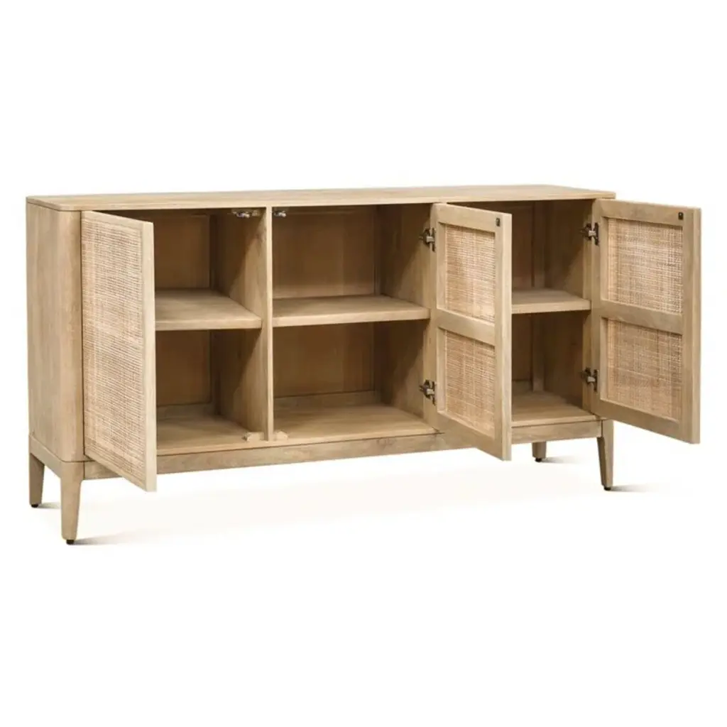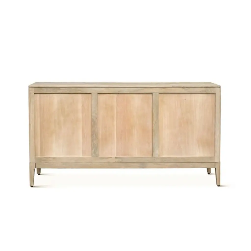 Mid-century-spirited while beautifully on trend. A texture-driven sideboard of white-washed mango features door fronts with natural cane paneling. Spacious interior for plenty of storage space, with adjustable shelving plus rear cutouts for cord management.