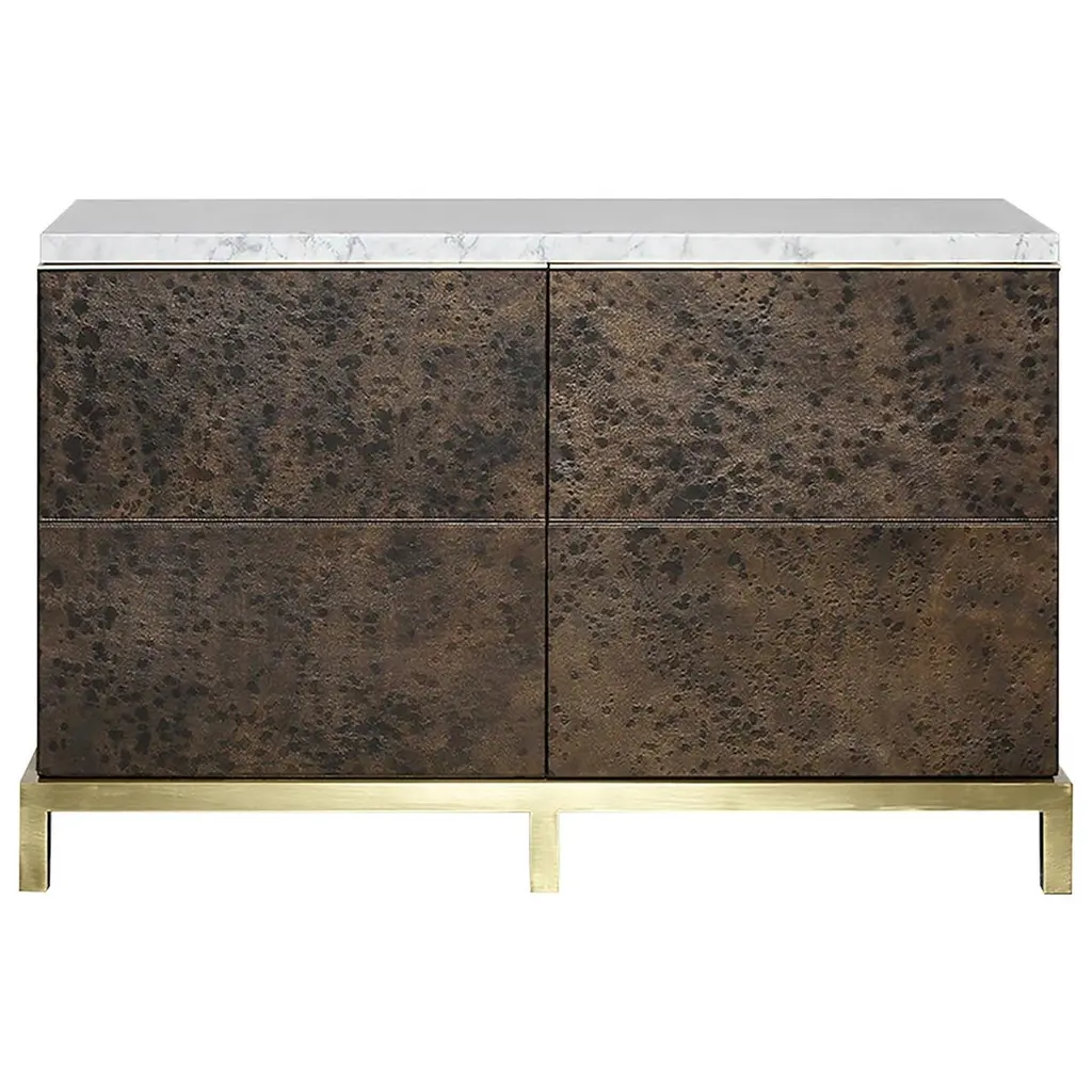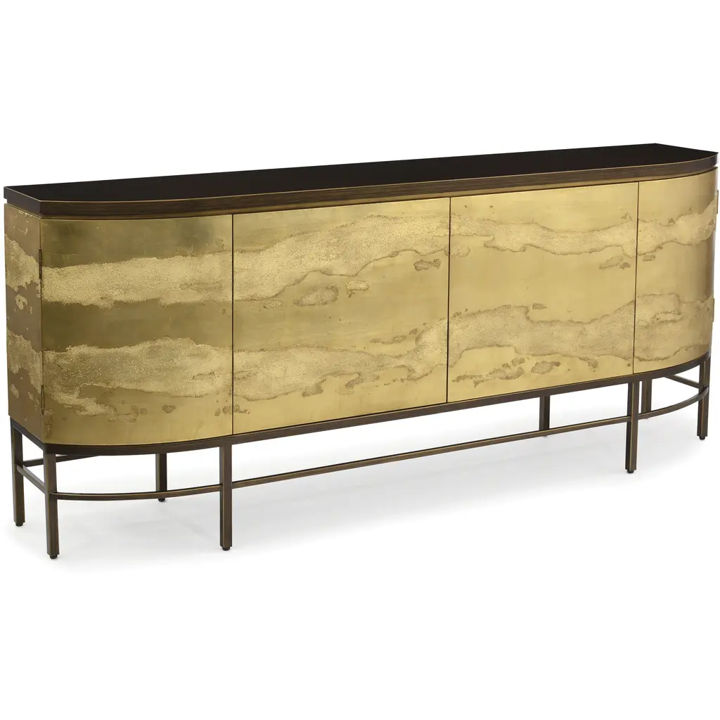 This sideboard is encased in a Gold Coast finish. The three door fronts, with a finish in Galaxy Gold, feature broken glass nuggets embedded in high gloss.