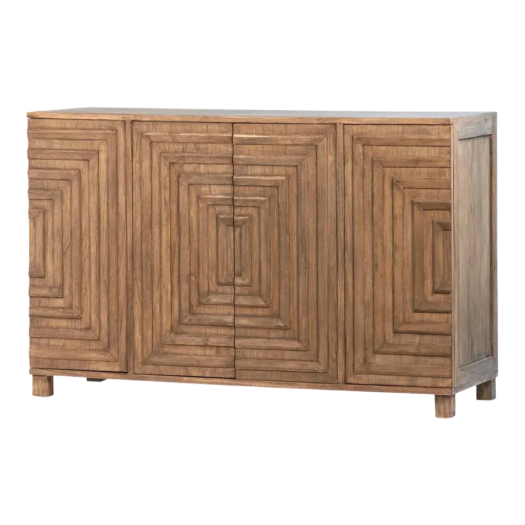 A sumptuous addition to a classically furnished home, this sideboard is crafted entirely of walnut. Its rectangular shape is adorned with details that give a traditional look to the piece, such as the carved elements on the sides, the inlaid pattern below the top, and the diamond-shaped decorations on the front panels of both doors. A luxurious addition to a living room or dining room, this piece exudes elegance and luxury.
