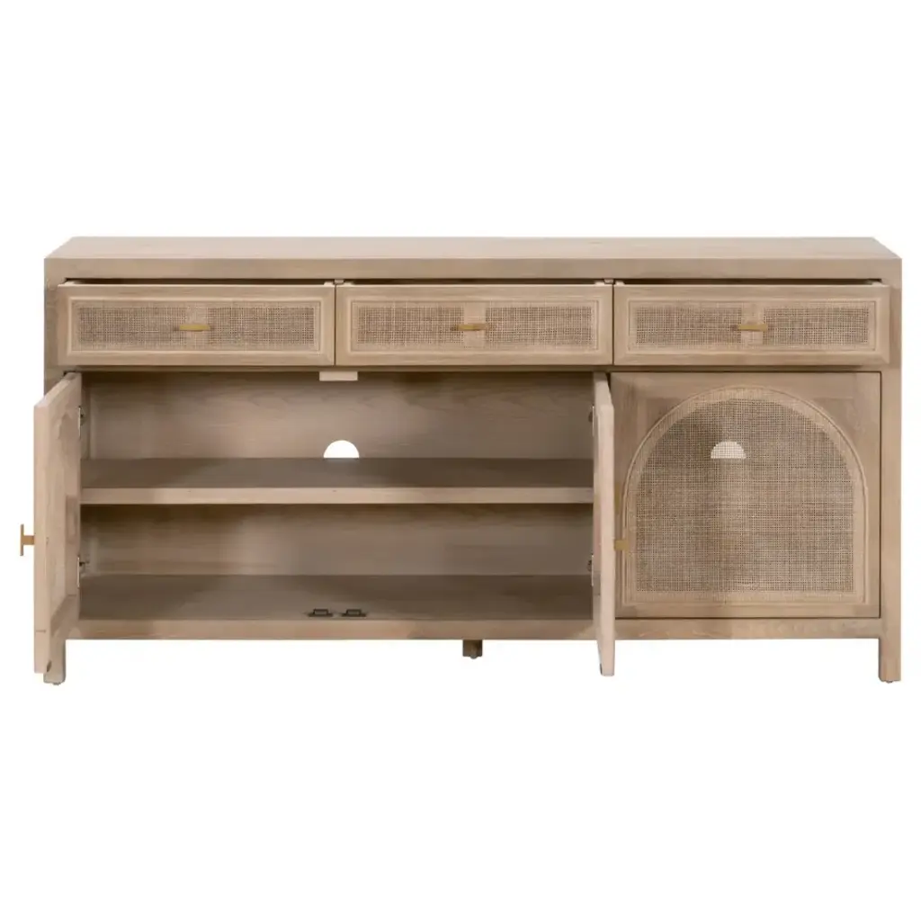 This is a bohemian-style media sideboard with rustic charm. It features muted smoke gray tones and a natural appearance. Constructed with reclaimed oak wood, the overall aesthetic of this sideboard is eco-friendly and earthy. The cabinet doors and drawers have a beautiful front-facing cane inlay, creating a very tropical and bohemian vibe. Conveniently, the cabinet contains lots of storage space with its three storage drawers and large cabinet space with removable and adjustable shelves. It also contains dual cord management holes for media and electronic components. This remarkable sideboard cabinet will be a grand addition to any entryway, living room or bedroom.