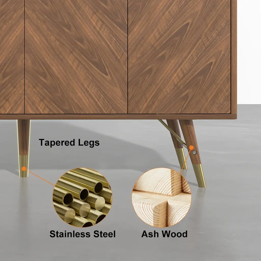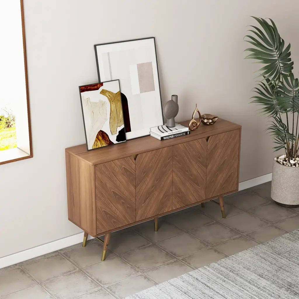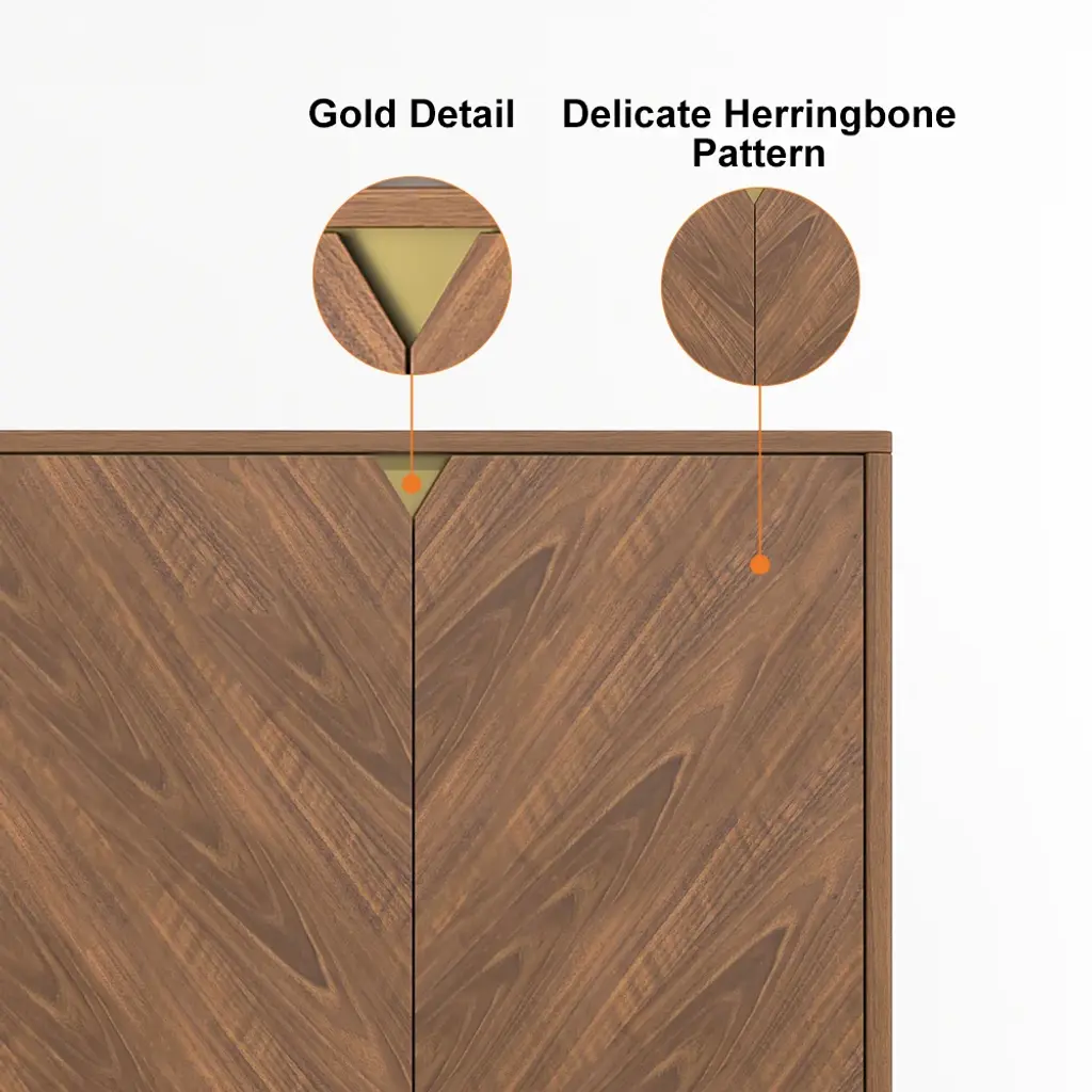 Add a touch of mid-century accent to your space with this functional sideboard cabinet. Featuring a stunning herringbone design on the door fronts, this sideboard makes the ultimate statement to any interior design. Boasting four doors with two adjustable shelves, it can be ideal to store your crockery and other dining essentials. Supported by tapered legs, it ensures steady support and a long-lasting option.