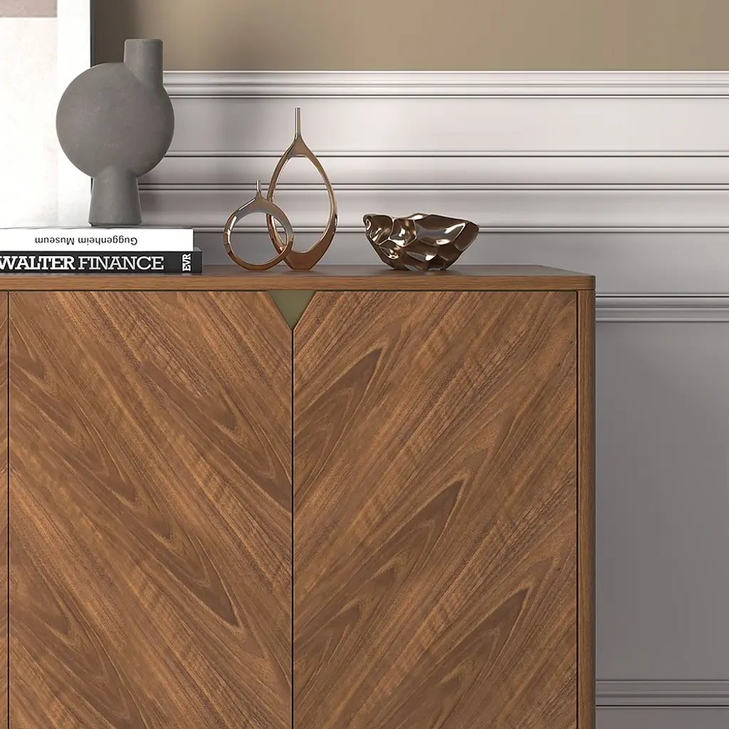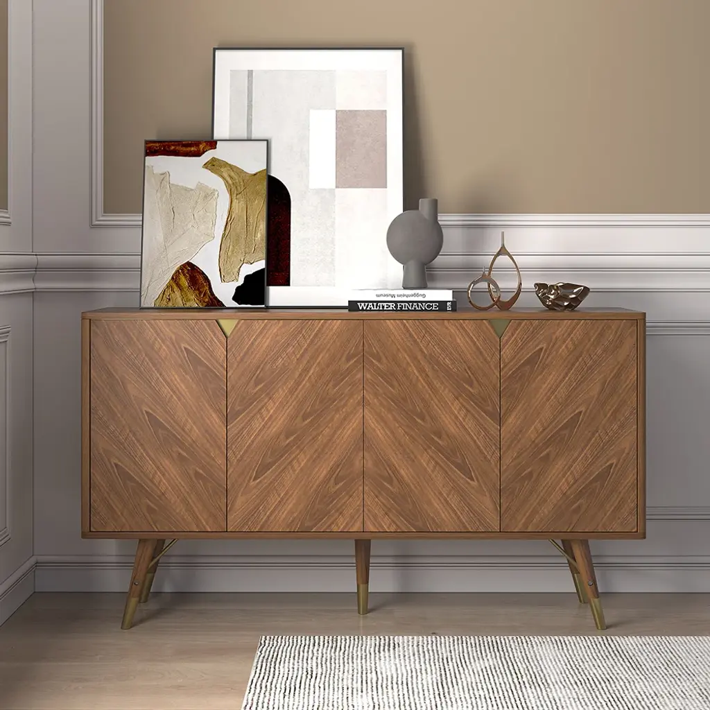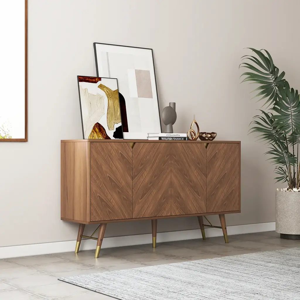 Add a touch of mid-century accent to your space with this functional sideboard cabinet. Featuring a stunning herringbone design on the door fronts, this sideboard makes the ultimate statement to any interior design. Boasting four doors with two adjustable shelves, it can be ideal to store your crockery and other dining essentials. Supported by tapered legs, it ensures steady support and a long-lasting option.