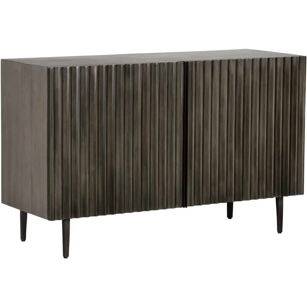 This bold sideboard will command attention through living, lounge and dining spaces. Features a grey mango wood frame with dramatic sculpted details on the face of the two cabinets. Steel legs complete the urban and contemporary look. Made in India. With refined craftsmanship, this design was brought to life by skilled local artisans. By nature, these materials develop unique imperfections such as fissures, markings and colour variations for a truly one-of-a-kind piece. As wood is an organic, porous material, these pieces will contain natural variation of texture and may also exhibit fine indentations and cracks. Wood pieces will also display a disparity of colour and grain, and visible knots and burls that add to the character of each piece.