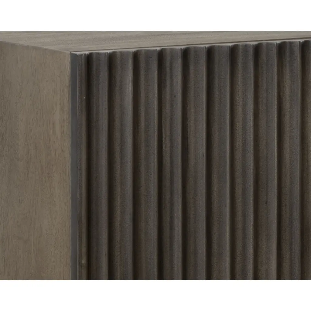 This bold sideboard will command attention through dining, living and lounge spaces. Features a grey mango wood frame with dramatic sculpted details on the face of the two cabinets. Steel legs complete the urban and contemporary look. Made in India. With refined craftsmanship, this design was brought to life by skilled local artisans. By nature, these materials develop unique imperfections such as fissures, markings and colour variations for a truly one-of-a-kind piece. As wood is an organic, porous material, these pieces will contain natural variation of texture and may also exhibit fine indentations and cracks. Wood pieces will also display a disparity of colour and grain, and visible knots and burls that add to the character of each piece.