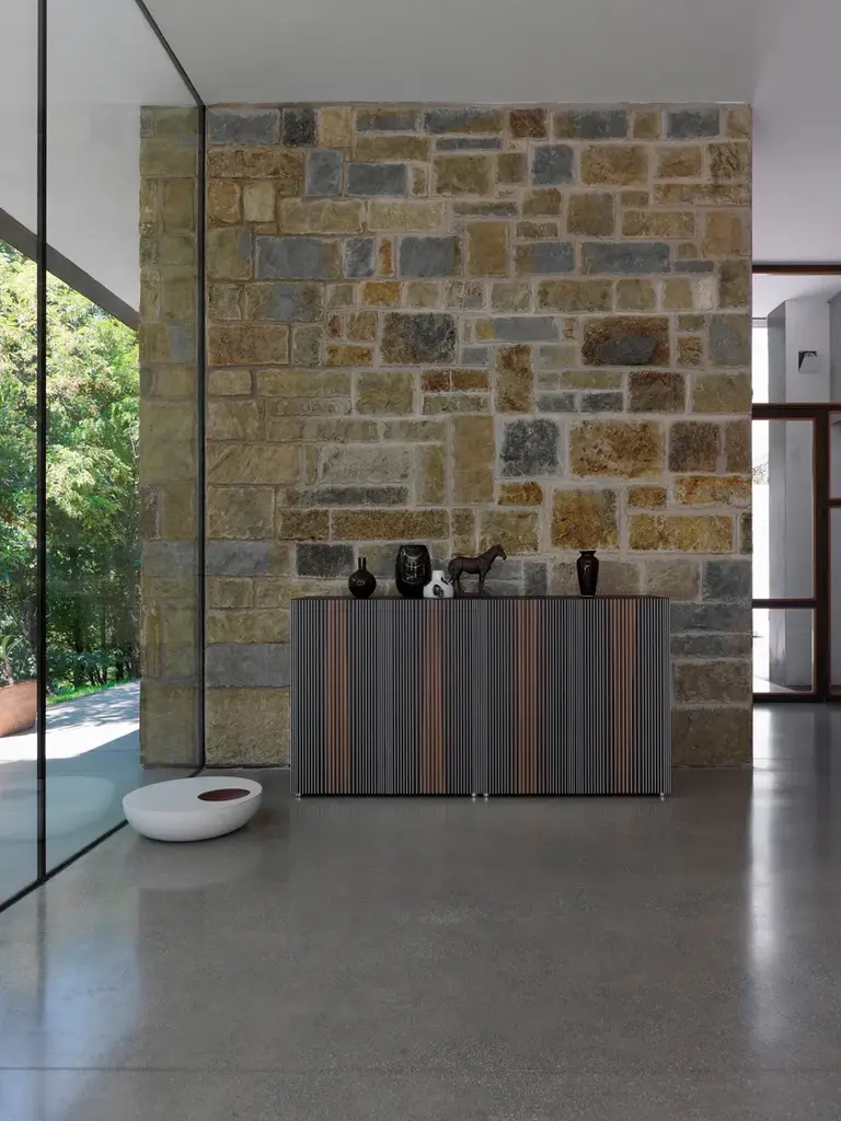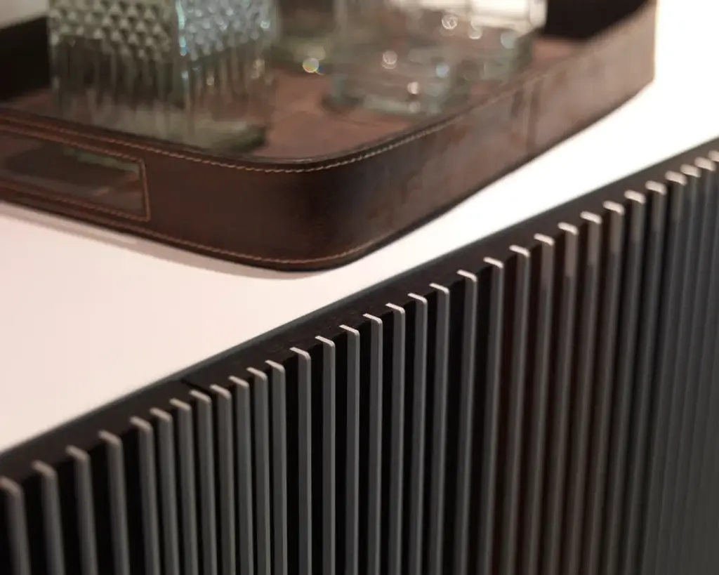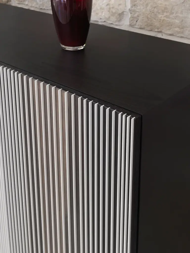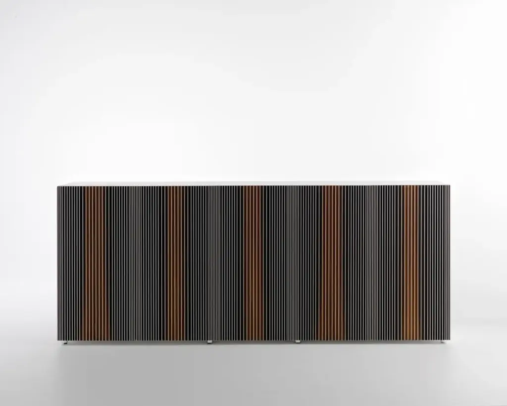 Freely inspired by the work of the Venezuelan artist, Carlos Cruz-Diez and his Op Art style. You perceive this item not as a spectator but as a player who is actively involved with the object itself. It changes in colour depending on your viewpoint, giving the effect of a curtain which opens and closes.Structure made from particleboard, melamine-coated and lacquered. The thickness of the structure and shelves is 18 mm, the back panel 10 mm, and the fixed central divider 36 mm. Door panels of hardboard or plywood, veneered with heat-treated oak, machined vertically to accommodate vertical inserts made of white, full-colour laminates. Shelves made from transparent tempered glass, with polished edge, 5 mm thick. PVC or felt bumpers. Painted ABS adjustable feet with aluminium finish. Optional base, height 16 cm or 32 cm, made from powder-coated iron. Optional accessories: shelf for glasses, extractable cutlery box, extractable tray, wooden shelves.FINISHBody: white lacquered or mocha stained beech Doors: heat-treated oakOptional metal base: white or black
