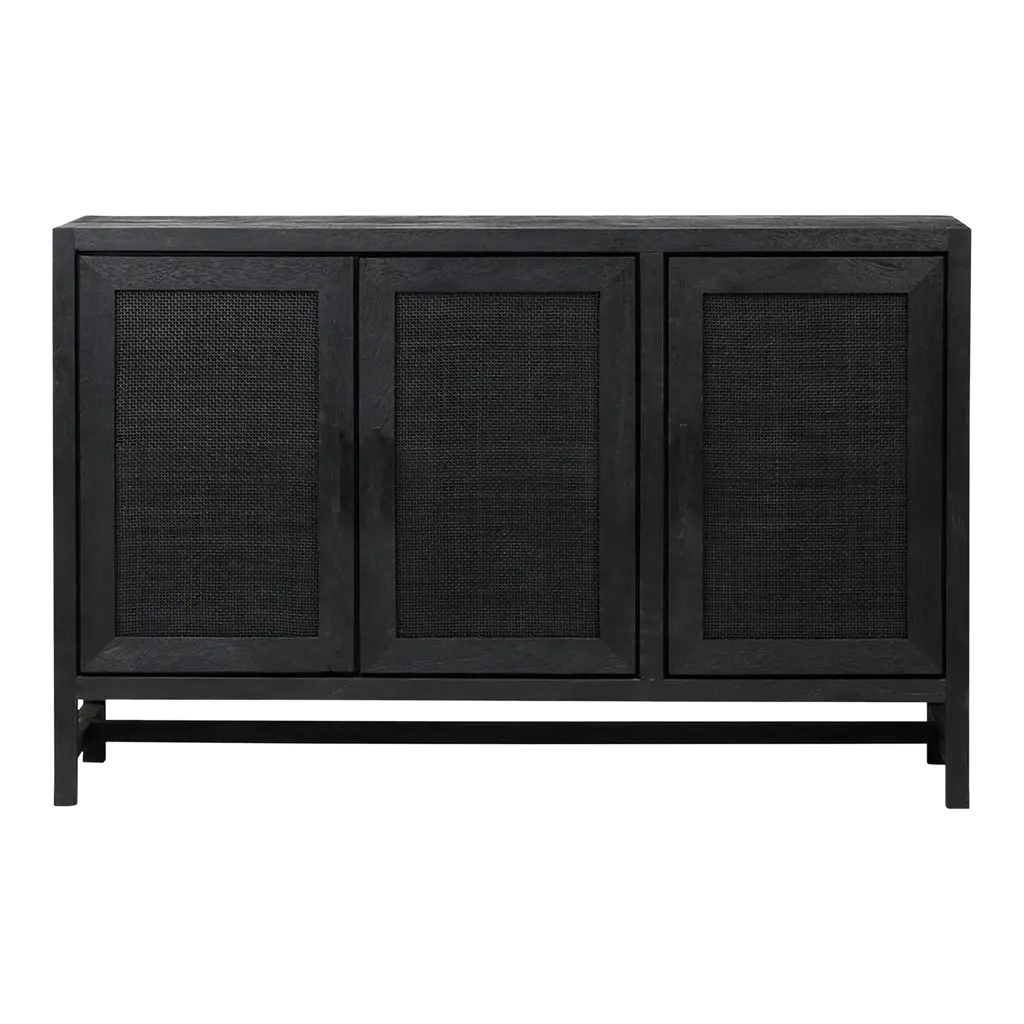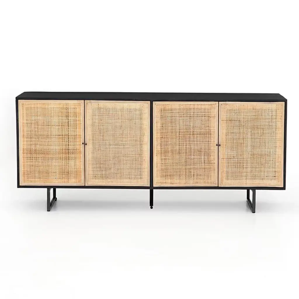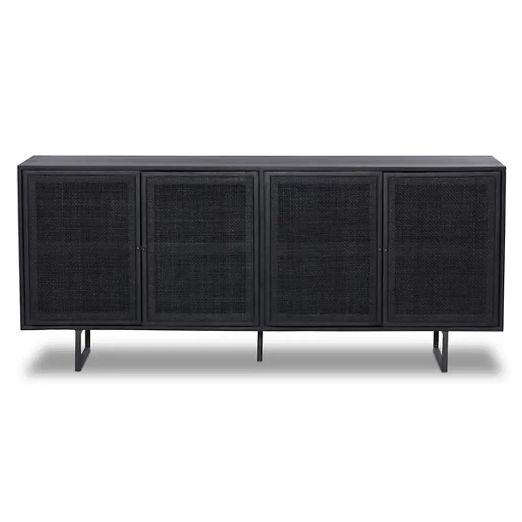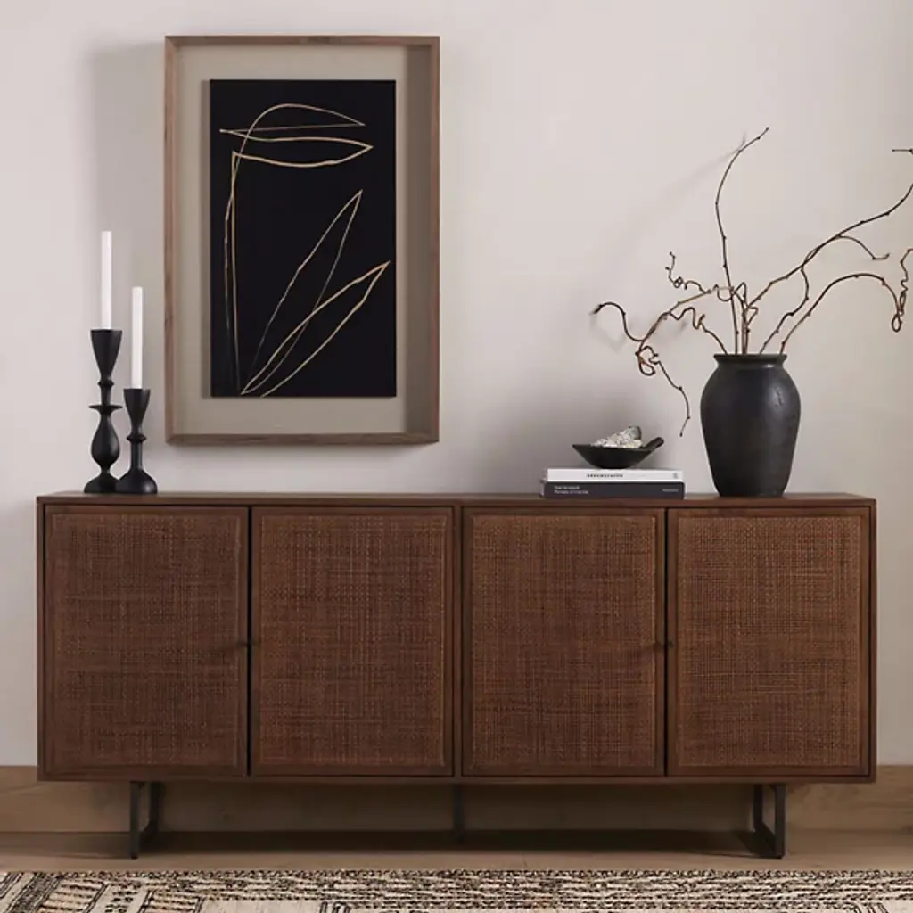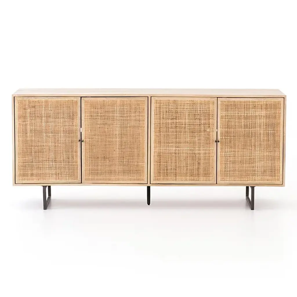 The Carmel Sideboard from Four Hands combines a mid-century-inspired style with an organic twist. It features light cane weaving encased in rich mango wood for a fresh, high-contrast look with natural depth. The angular gunmetal-finished iron legs add a striking contrast in both texture and tone, enhancing the overall design. This thoughtfully crafted piece perfectly blends retro charm and modern elegance, making it a standout addition to any room.