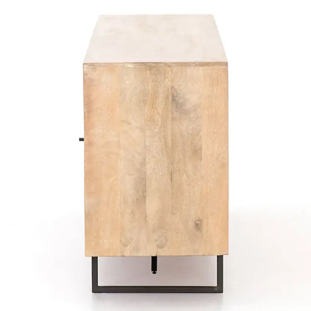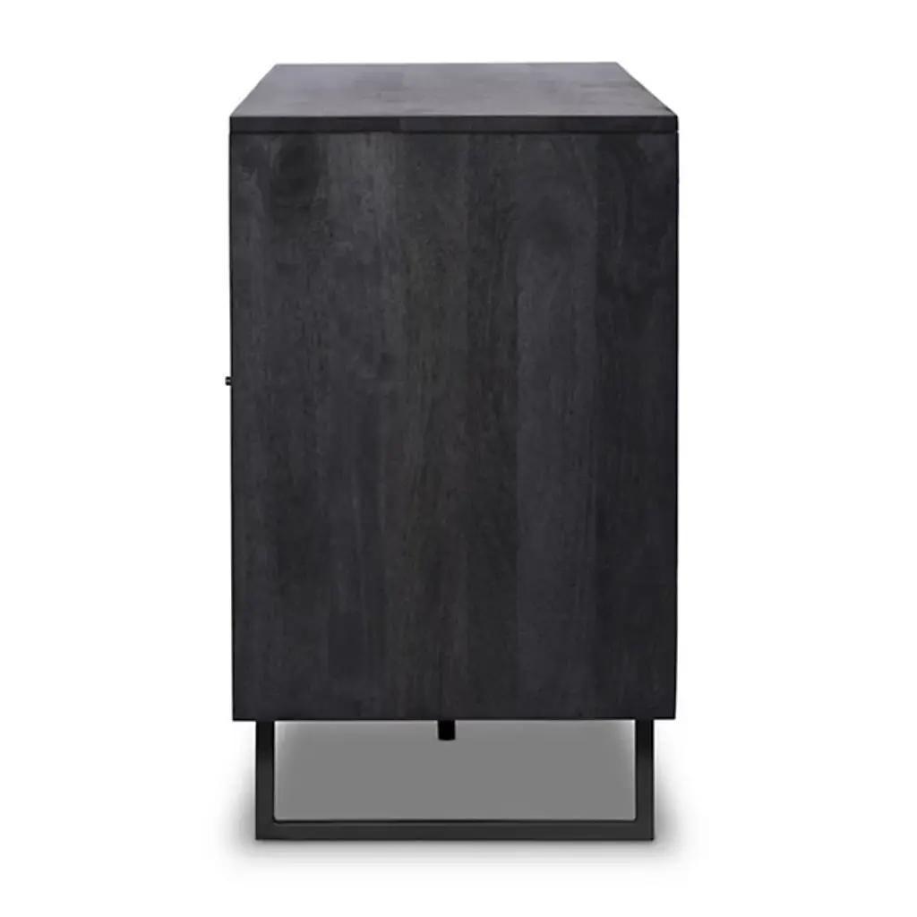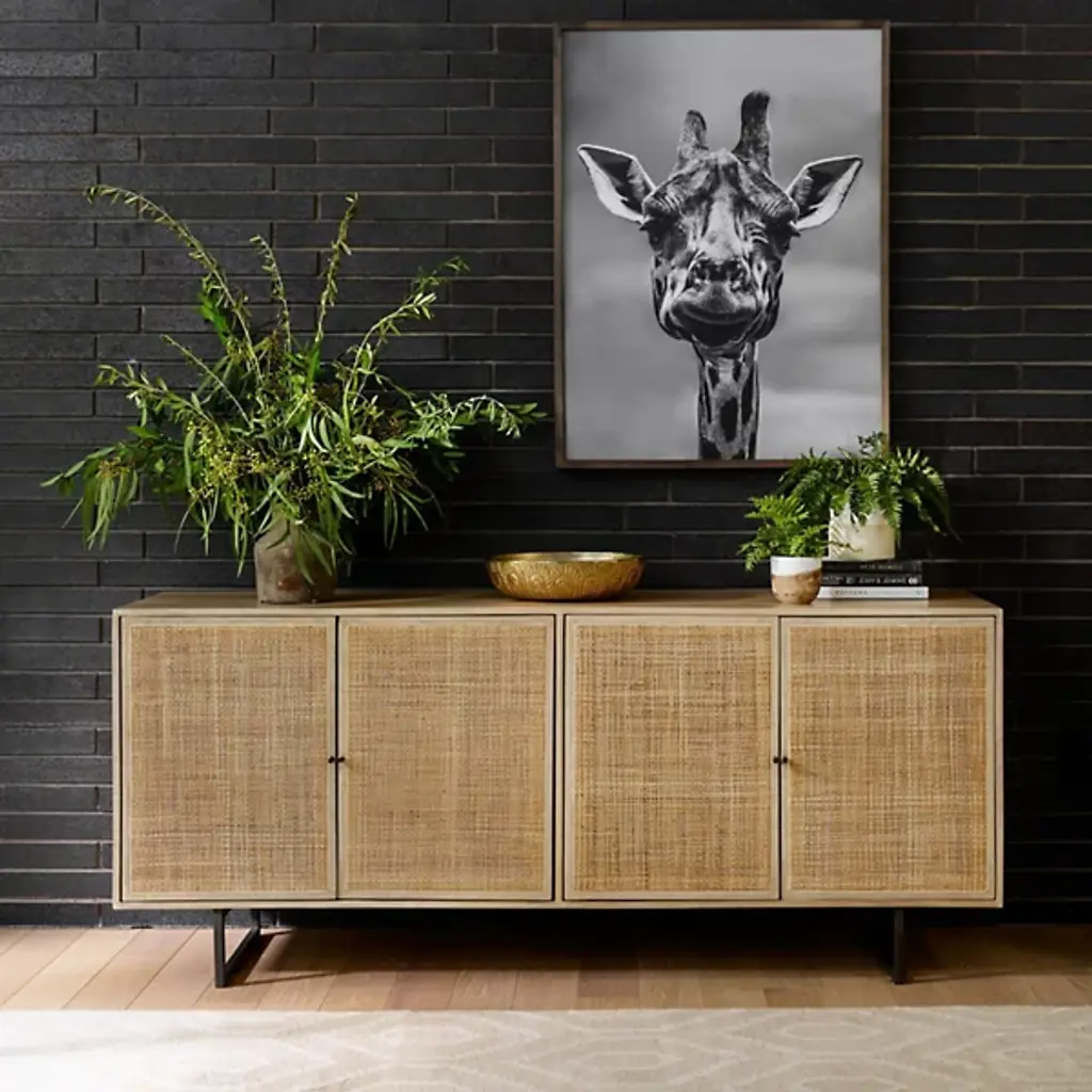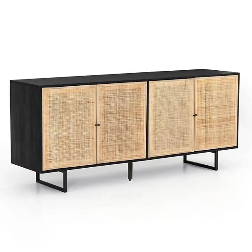 The Carmel Sideboard from Four Hands combines a mid-century-inspired style with an organic twist. It features light cane weaving encased in rich mango wood for a fresh, high-contrast look with natural depth. The angular gunmetal-finished iron legs add a striking contrast in both texture and tone, enhancing the overall design. This thoughtfully crafted piece perfectly blends retro charm and modern elegance, making it a standout addition to any room.