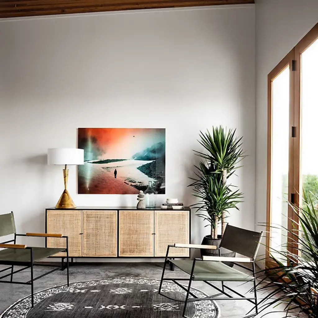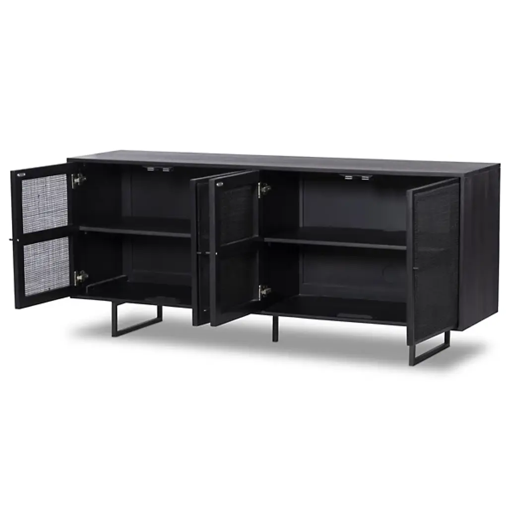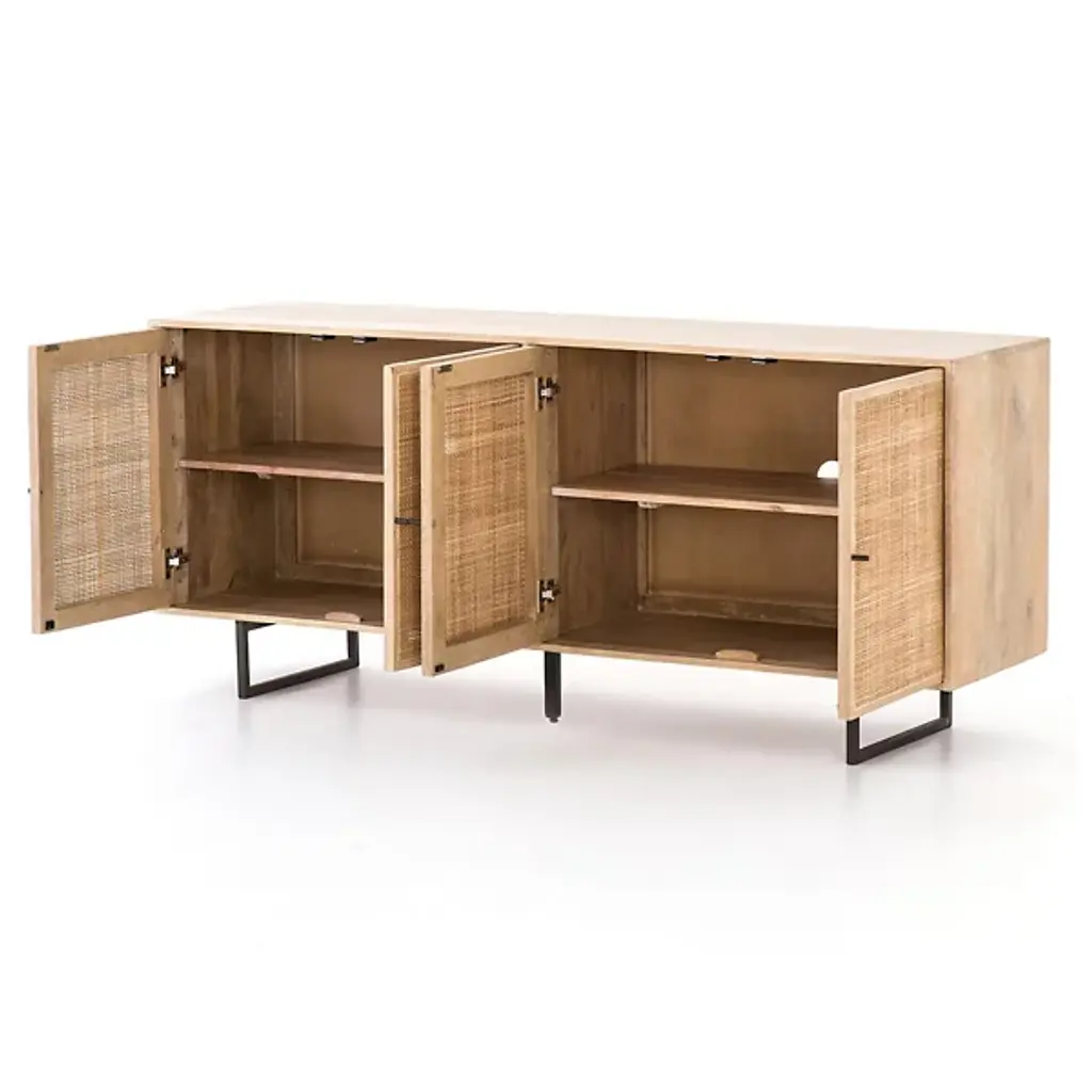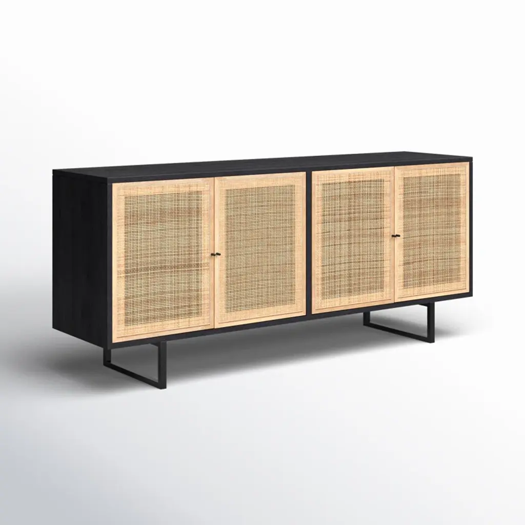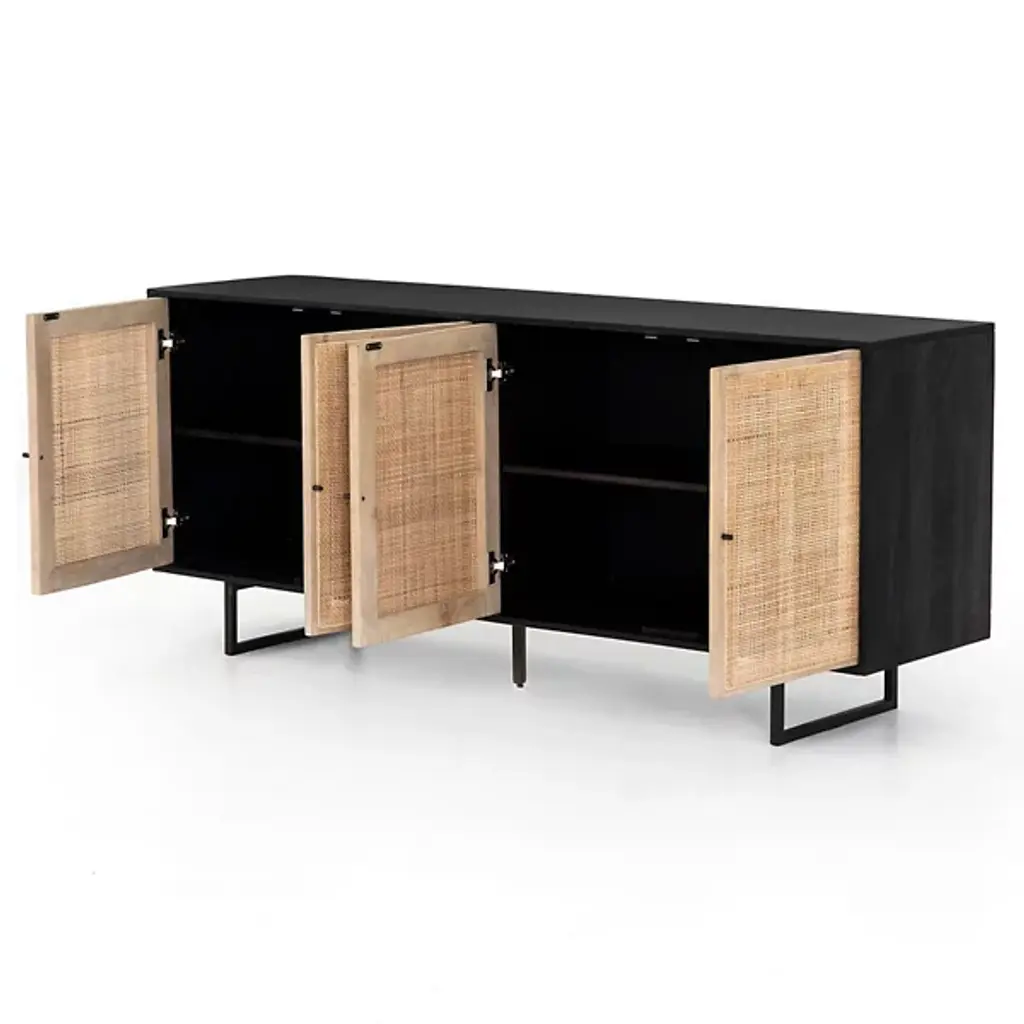 The Carmel Sideboard from Four Hands combines a mid-century-inspired style with an organic twist. It features light cane weaving encased in rich mango wood for a fresh, high-contrast look with natural depth. The angular gunmetal-finished iron legs add a striking contrast in both texture and tone, enhancing the overall design. This thoughtfully crafted piece perfectly blends retro charm and modern elegance, making it a standout addition to any room.