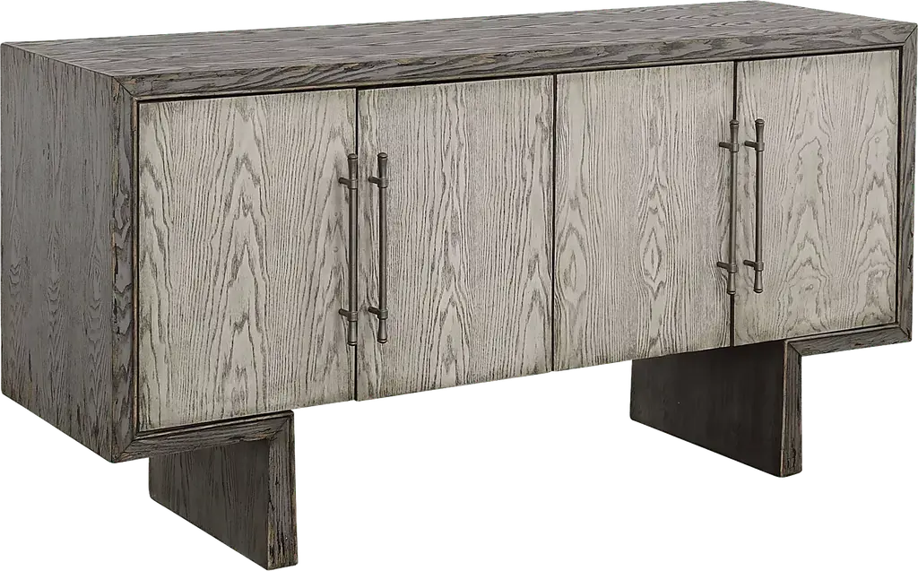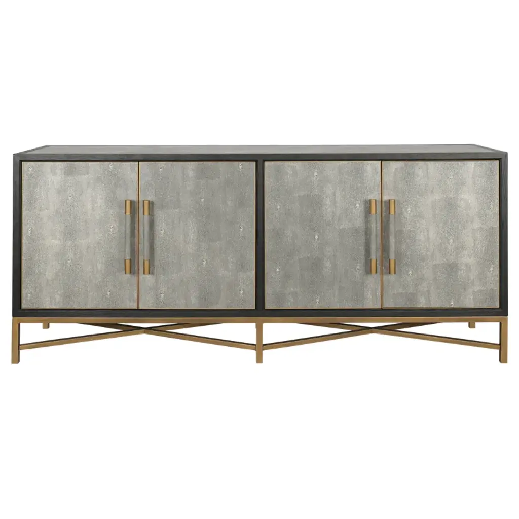 The slim silhouette of the Carol sideboard makes it an easy fit in a variety of settings. Ribbing in a warp and weft-like pattern brings interesting texture to the cerused white sideboard. A stained brass X-design base adds a little glamour.
