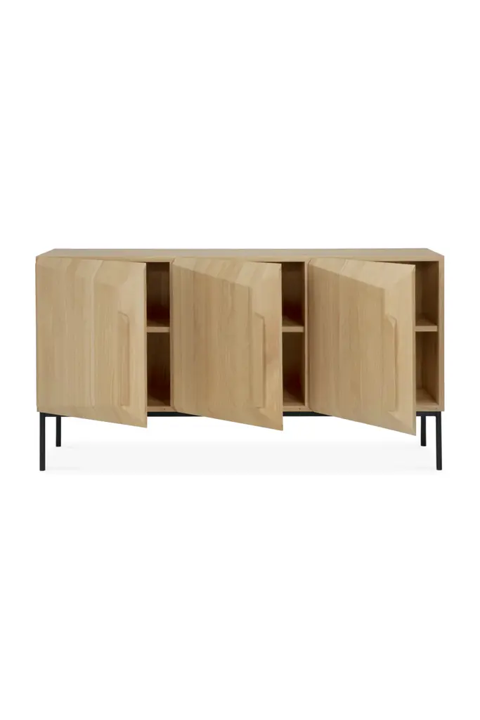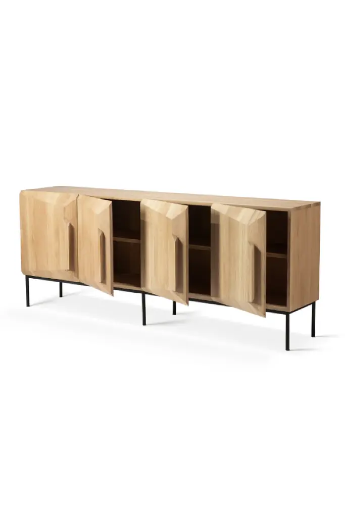 The Carved Oak Sideboard by Ethnicraft redefines conventional design with its captivating angular composition, breaking away from static and immobile surfaces. This Stairs sideboard's unique facade creates a sense of depth that transforms your perception of the sideboard as you move around it. Expertly crafted from varnished solid oak, it features stunning doors that open up to reveal a spacious interior with adjustable shelves. Upgrade your living space with the unique aesthetic and practical design of this ingenious piece.
