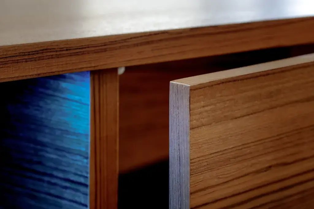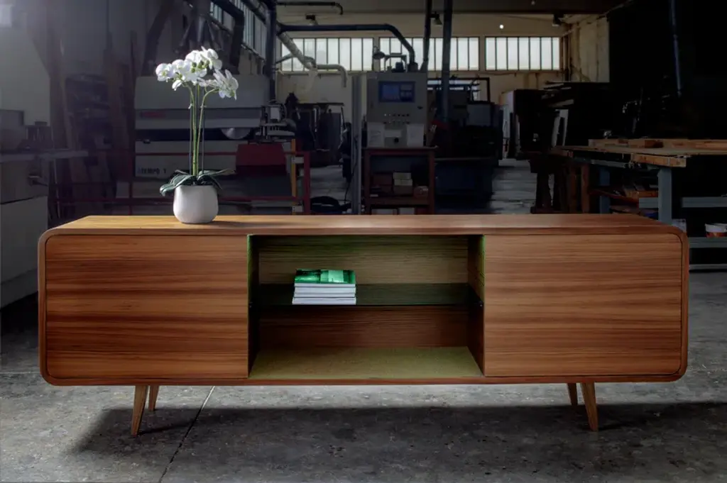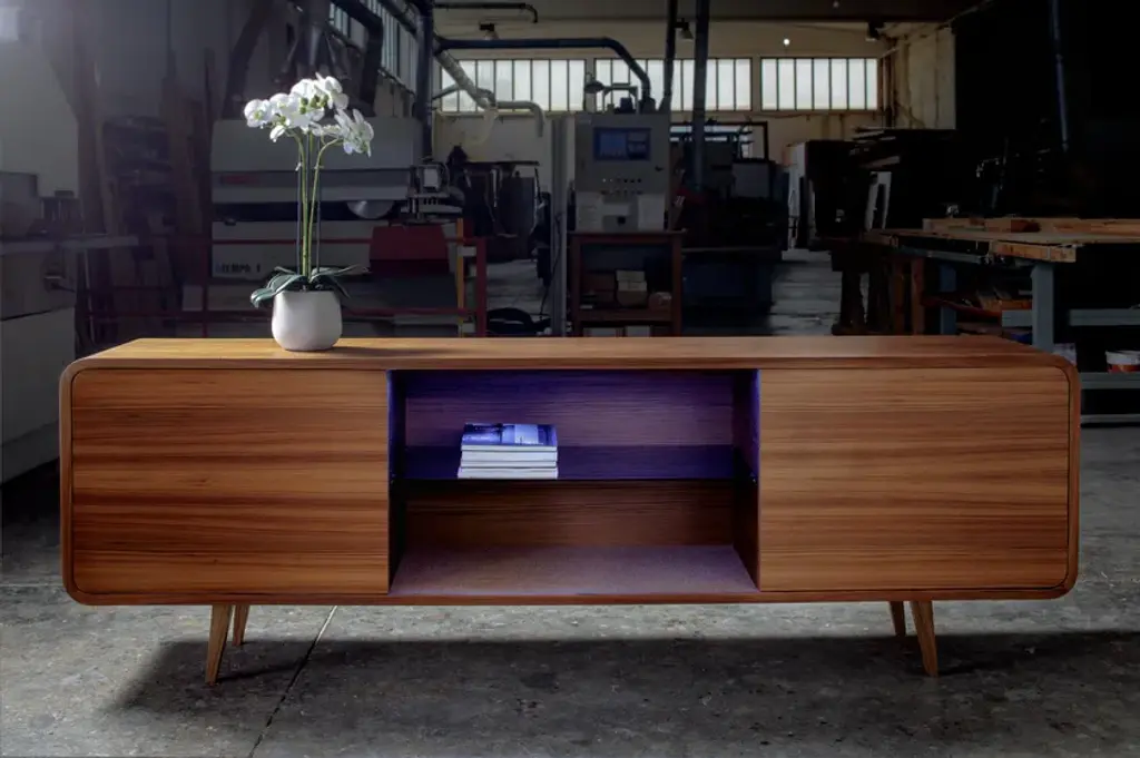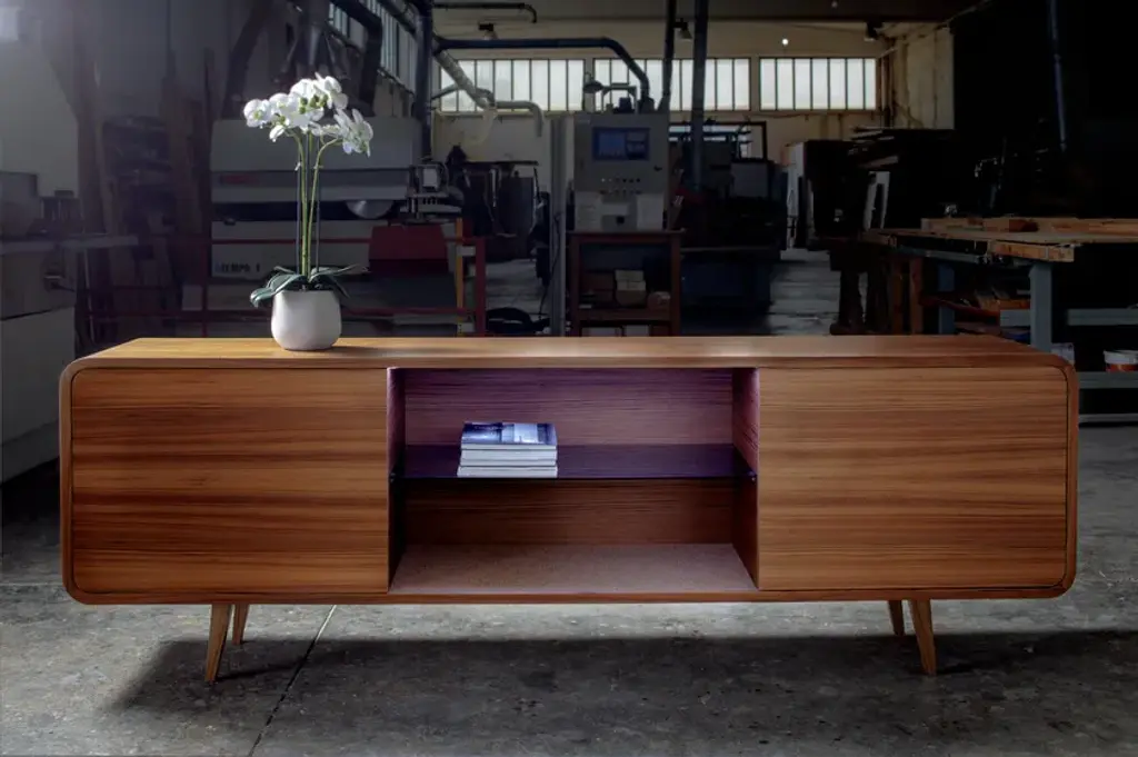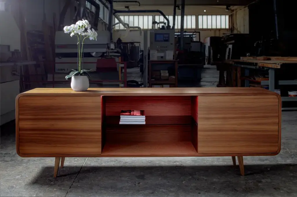 A contemporary interpretation of traditional Sardinian sideboards, this exquisite design by Matteo Congiu is defined by minimalist lines perfectly suitable for any kind of interior.Fashioned of wood, it is internally enriched with cork adding a warm and soft charm to the piece. Practical and versatile, this sideboard features two side compartments with push-to- open doors and a central open compartment divided in two by a glass shelf illuminated by an LED strip.