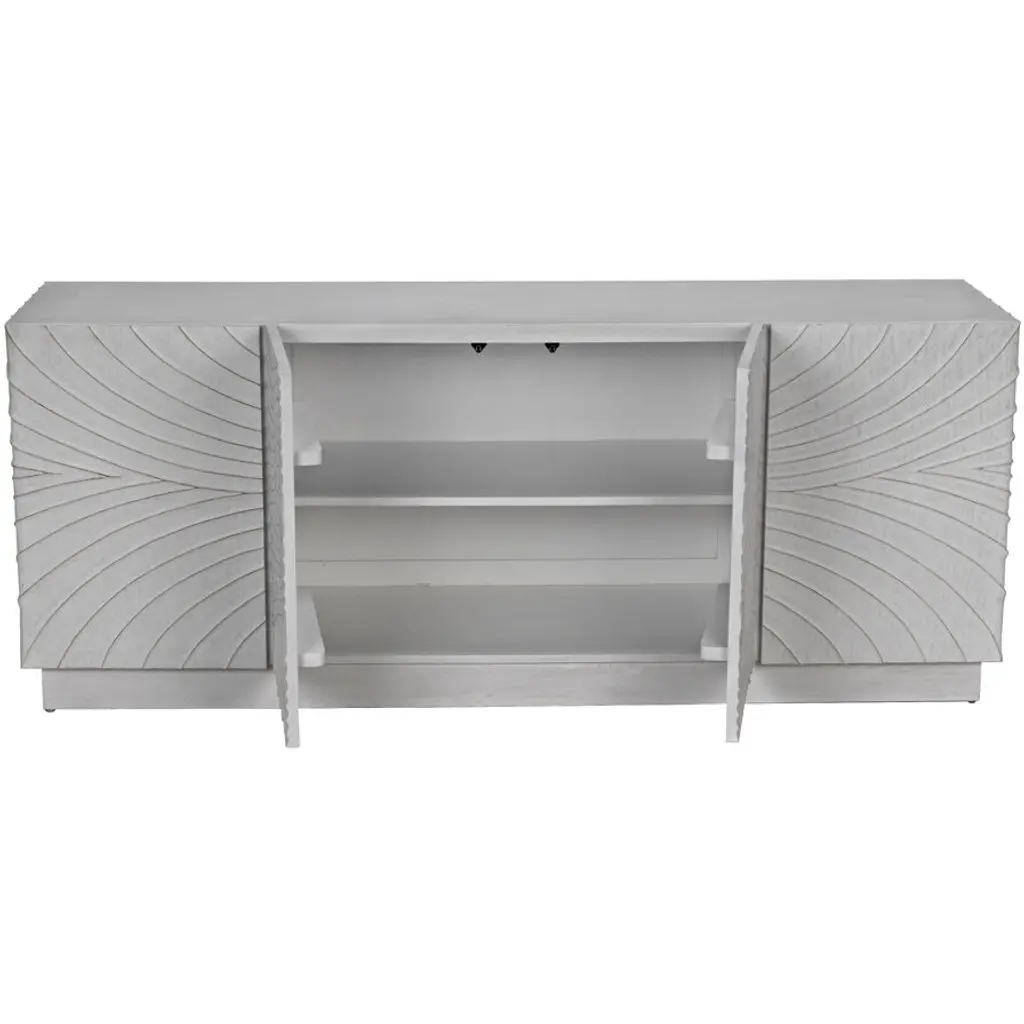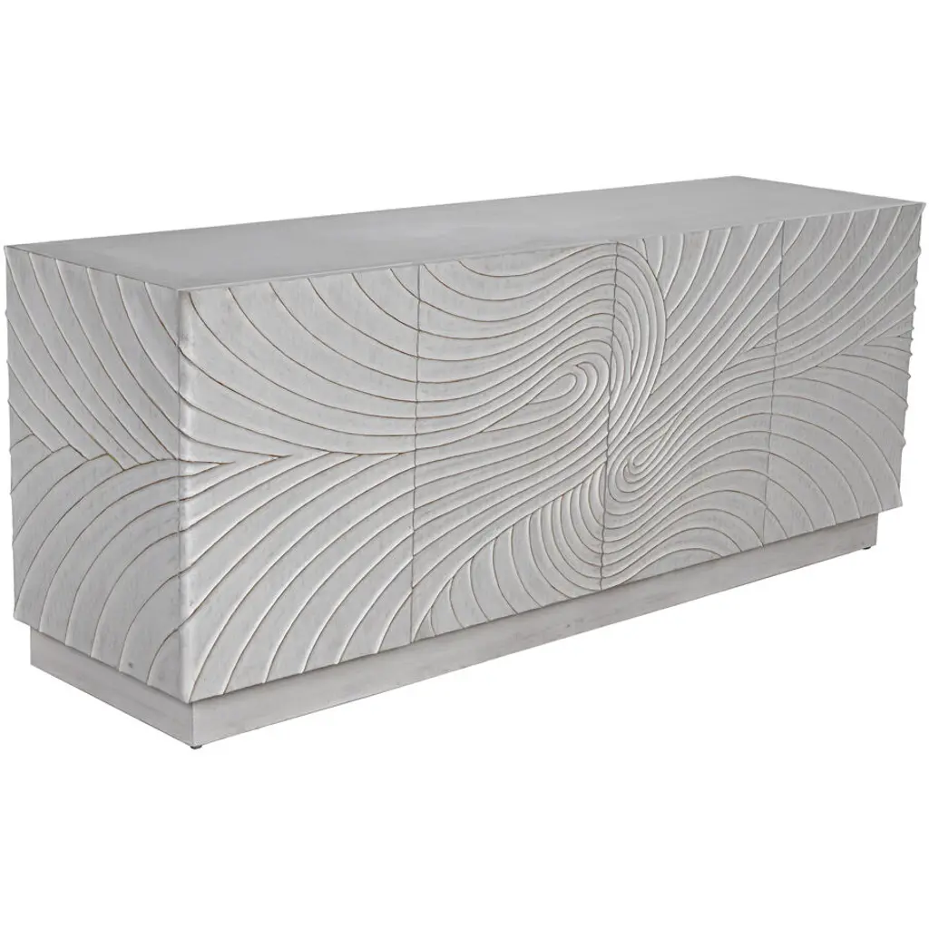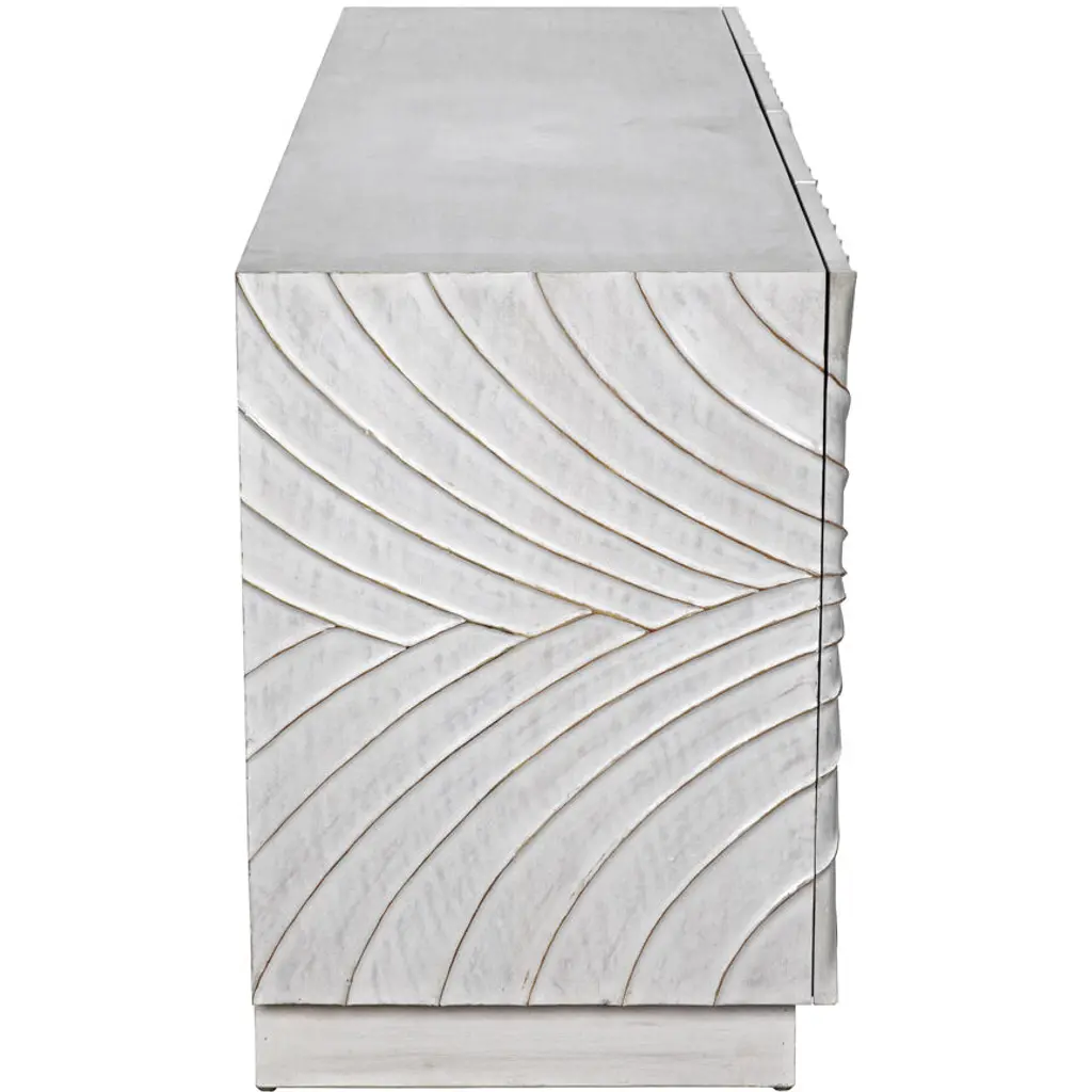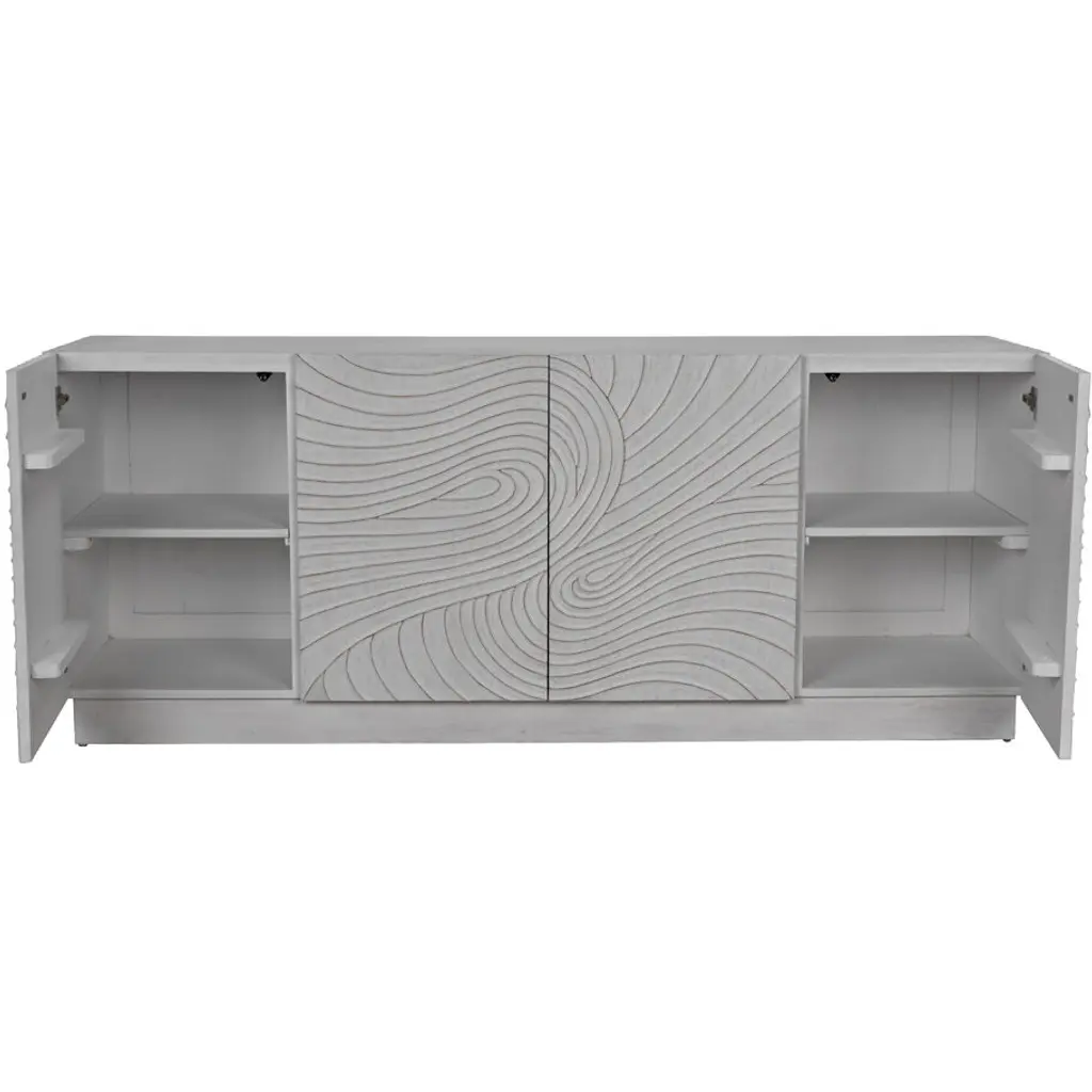 This handcrafted and beautifully finished mahogany sideboard's strong lines are enhanced with four hand-carved cupboard doors that open with a touch to reveal generous interior storage. Finished in White Wash, it is a timeless look that can be easily integrated into any home.