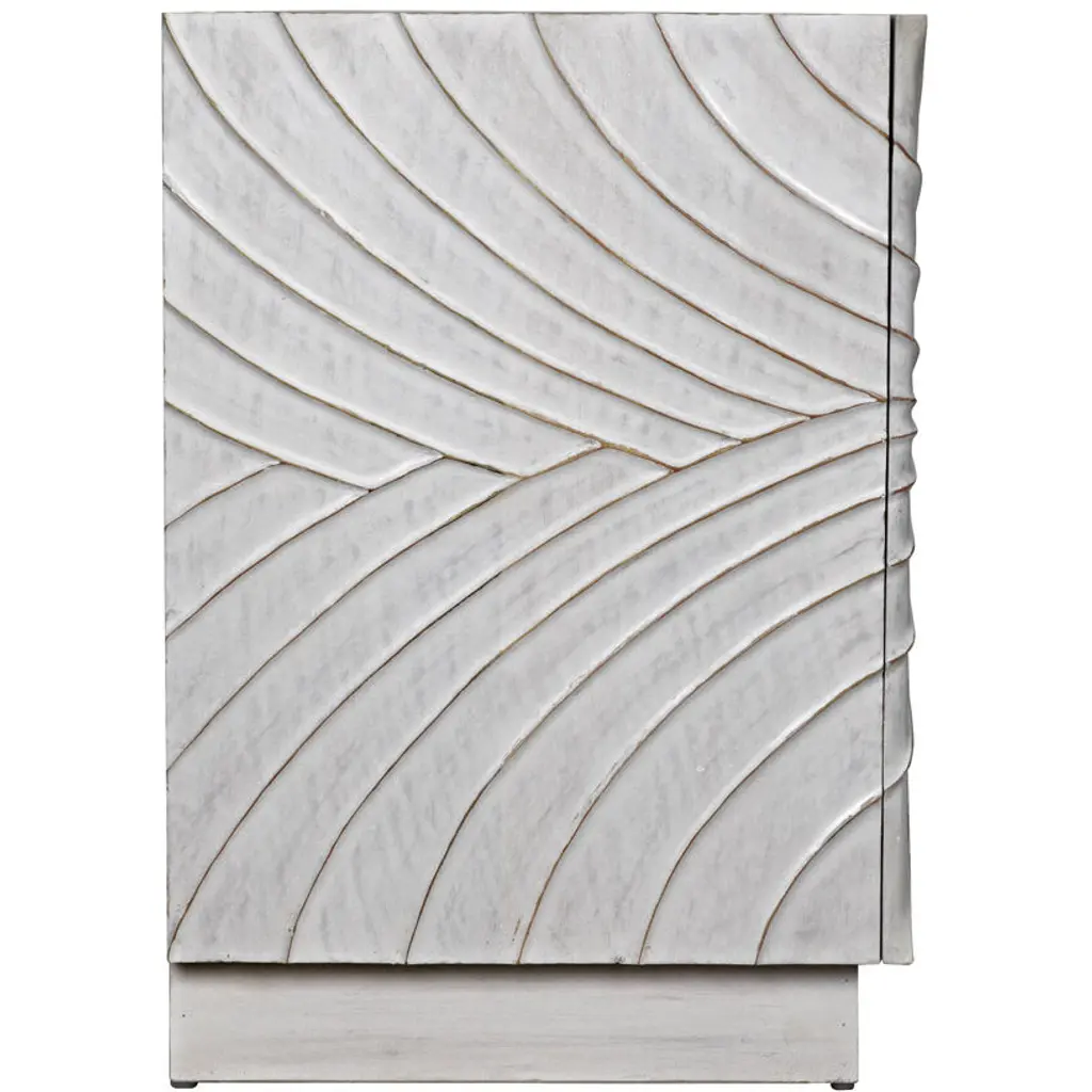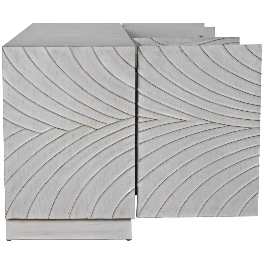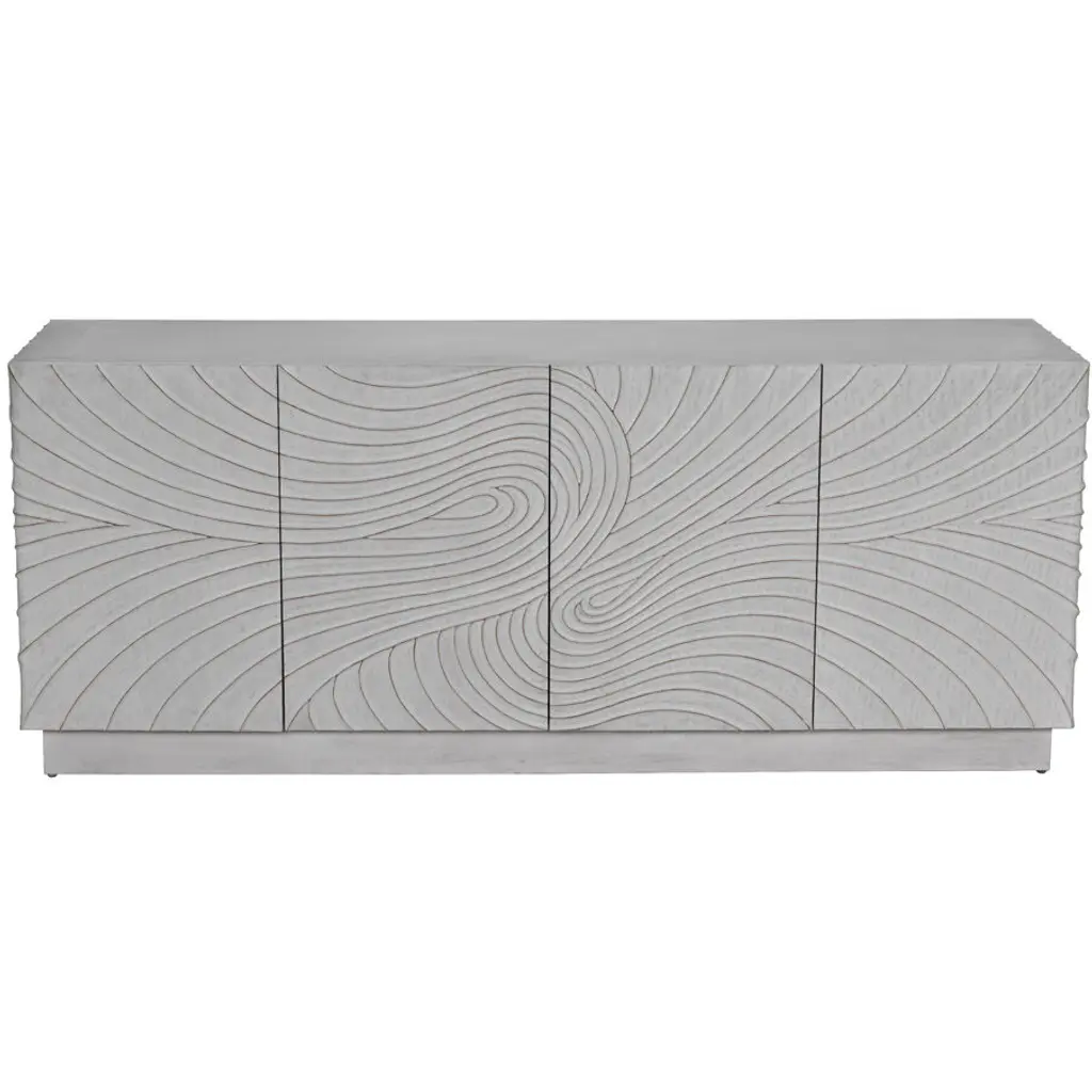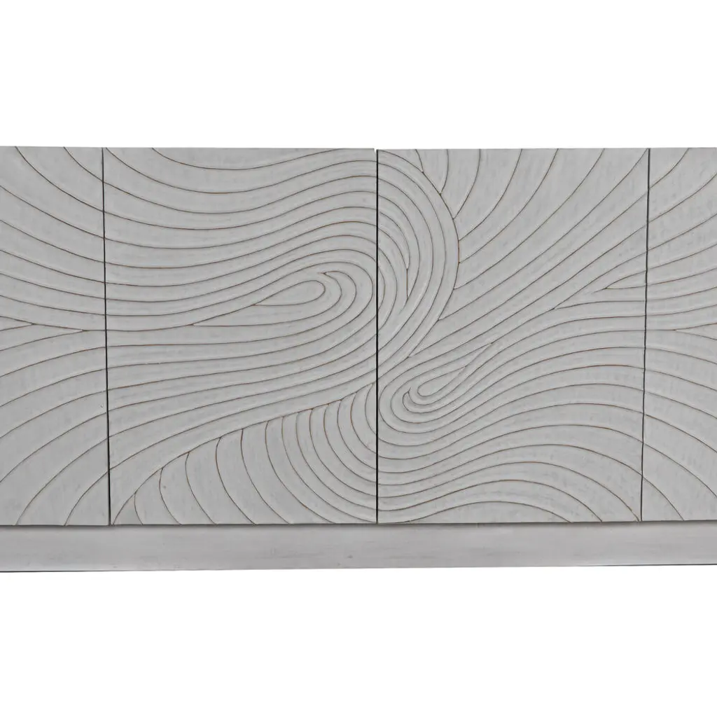 This handcrafted and beautifully finished mahogany sideboard's strong lines are enhanced with four hand-carved cupboard doors that open with a touch to reveal generous interior storage. Finished in White Wash, it is a timeless look that can be easily integrated into any home.
