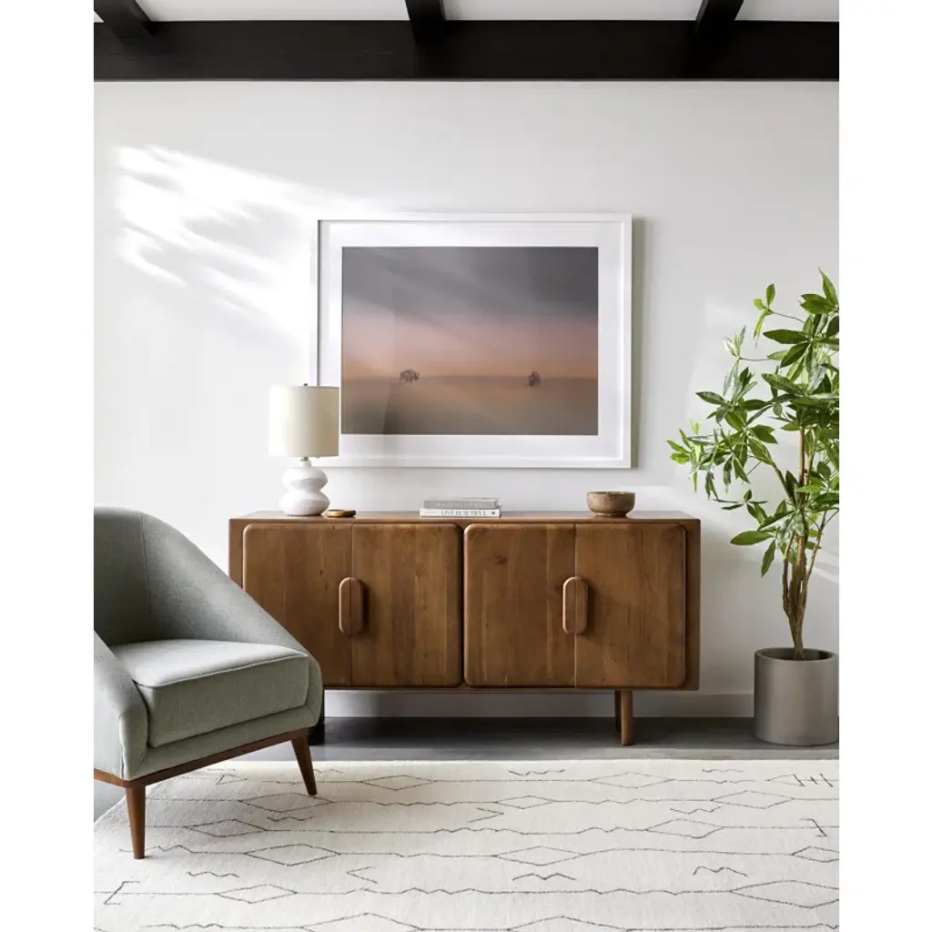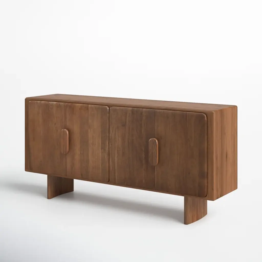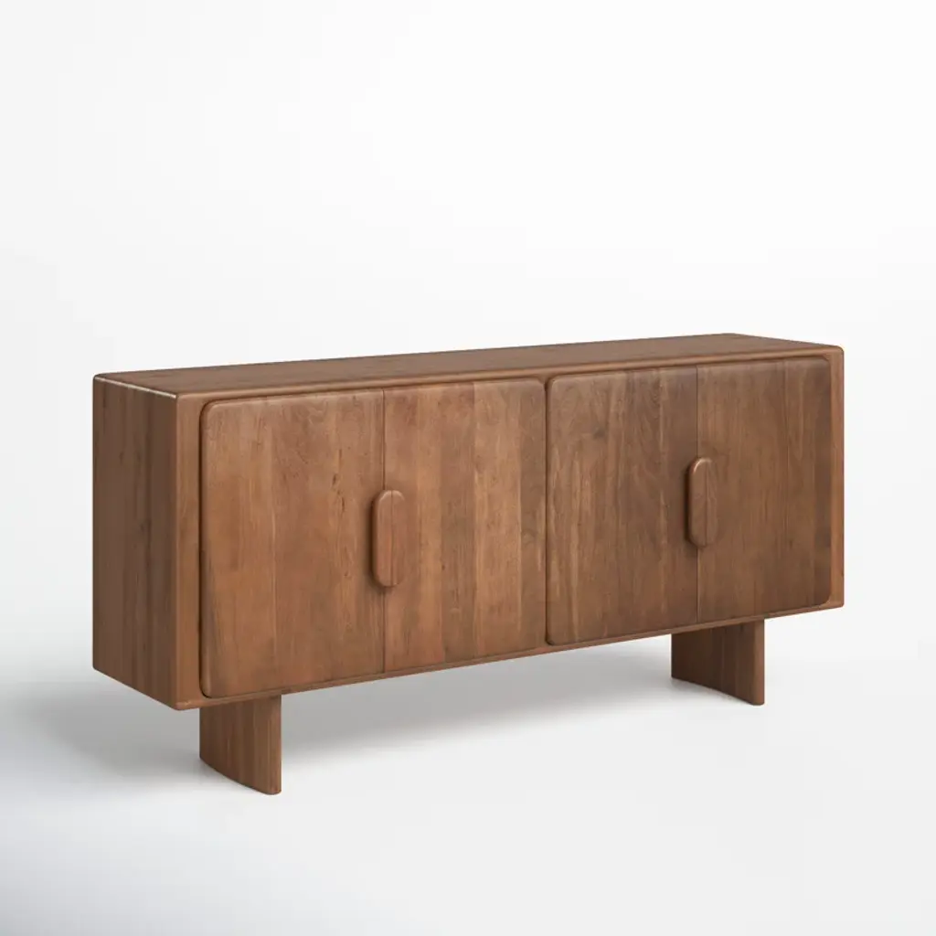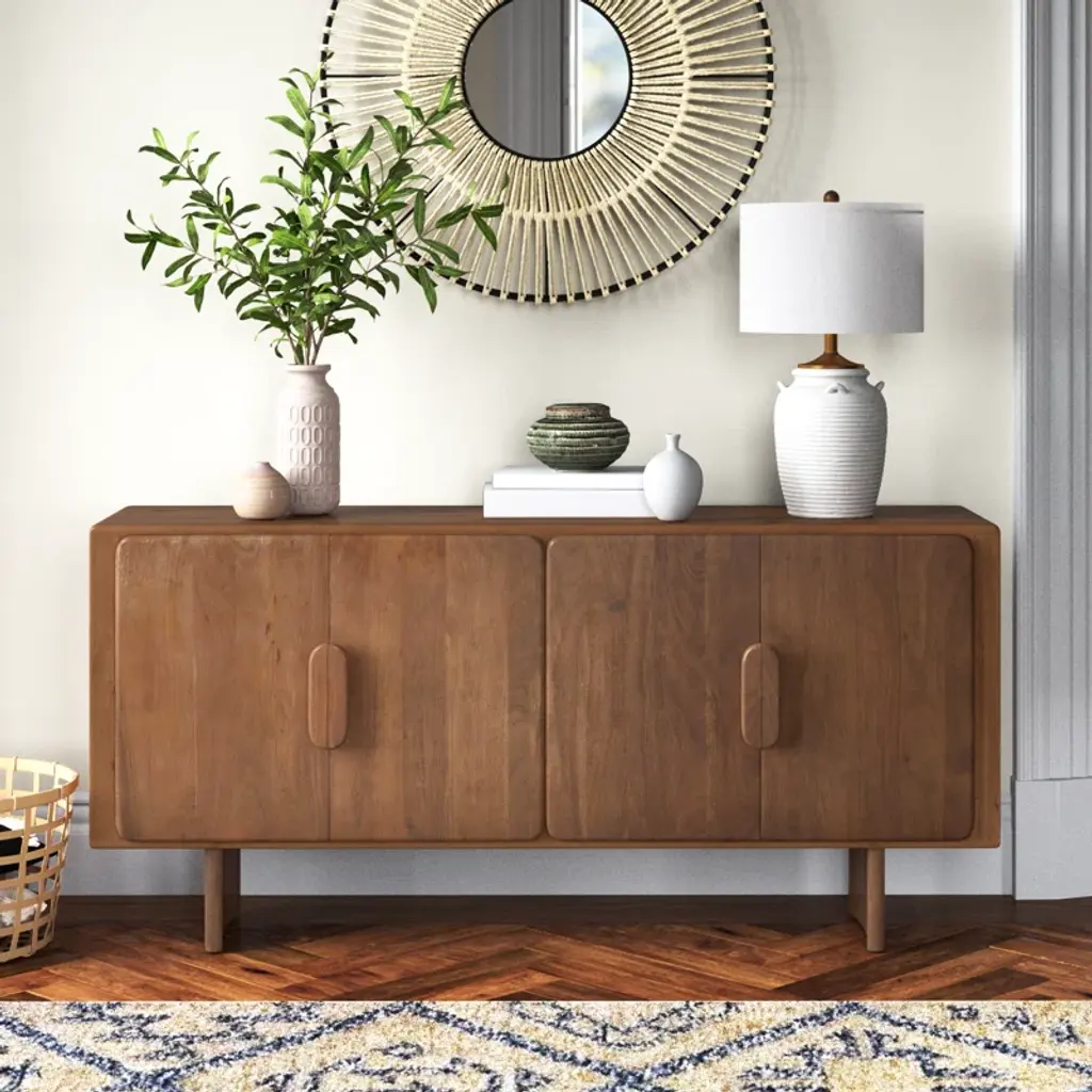 Mid-century magic. Our solid acacia wood sideboard brings a touch of timeless appeal to your home. With clean lines and an elegant design, this piece elevates any room. Four doors open up to reveal spacious shelves, offering ample storage space for your essentials. The finished back and smooth surface make it easy to style anywhere, while the tapered legs provide reliable support. Add this classic piece to your living area for an instant update and a nod to mid-century modern style.