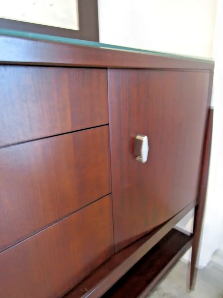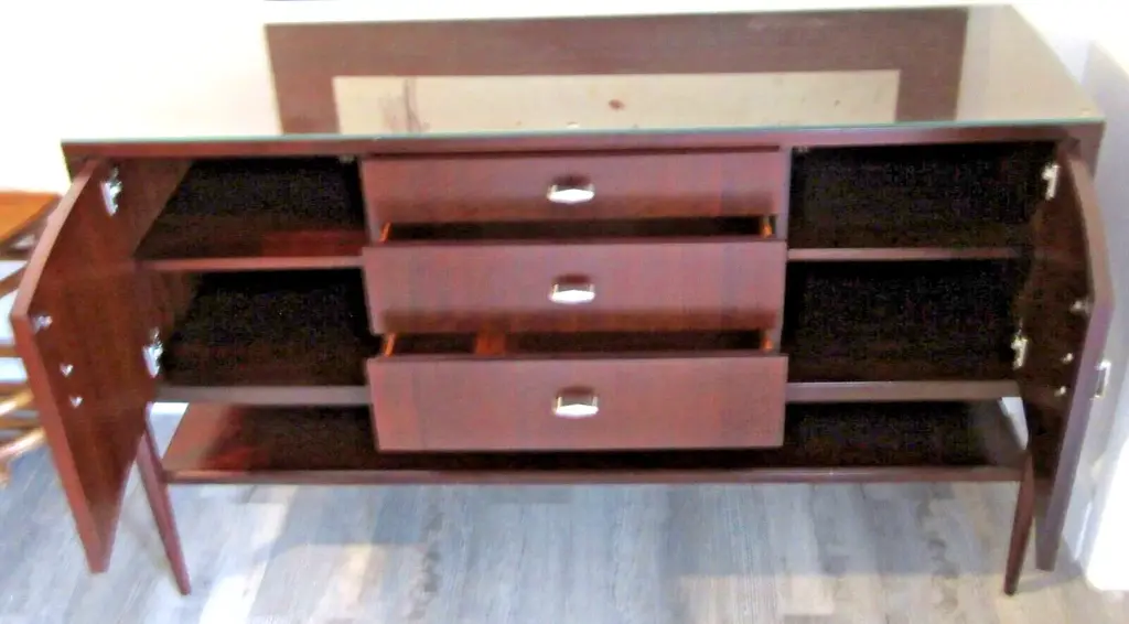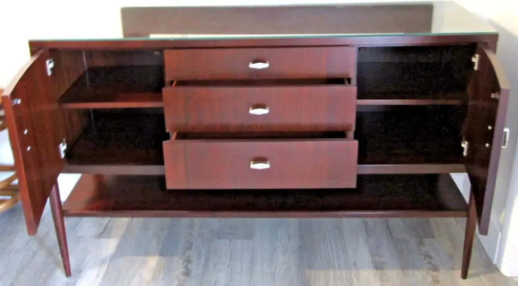 Century Furniture Paragon Club Pellissier 57" Wide Mahogany Wood Sideboard Handcrafted sideboard features paragon finish and three center drawers. Glass top. Silver tray in top drawer and single door at each end. One fixed shelf behind each door. Made of veneer and mahogany wood. Base open shelf. Approx. 18.25" L x 57.0" W x 36” T Weight 153.0 lbs