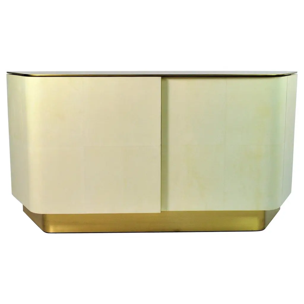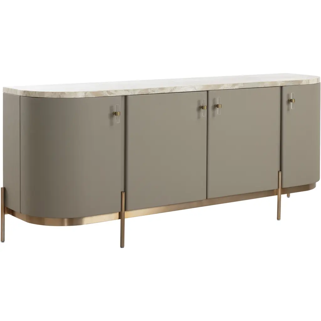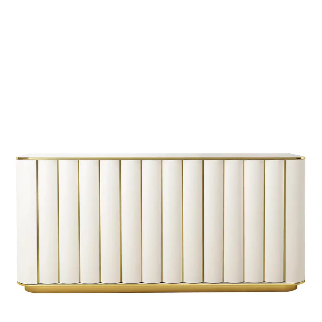 Boasting a lavish white leather upholstery, this sideboard will make a statement in any polished interior. The load-bearing frame is constructed of wood and its elliptical shape is highlighted by the gold-finished metal base that also includes four dainty feet in the same finish. Metal details, mirroring the same gold finish, outline the vertical rectangular motif adorning the sideboard's sides. Finishing and upholstery customizations are available, please ask the Concierge for options.