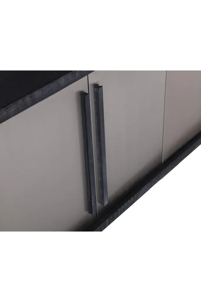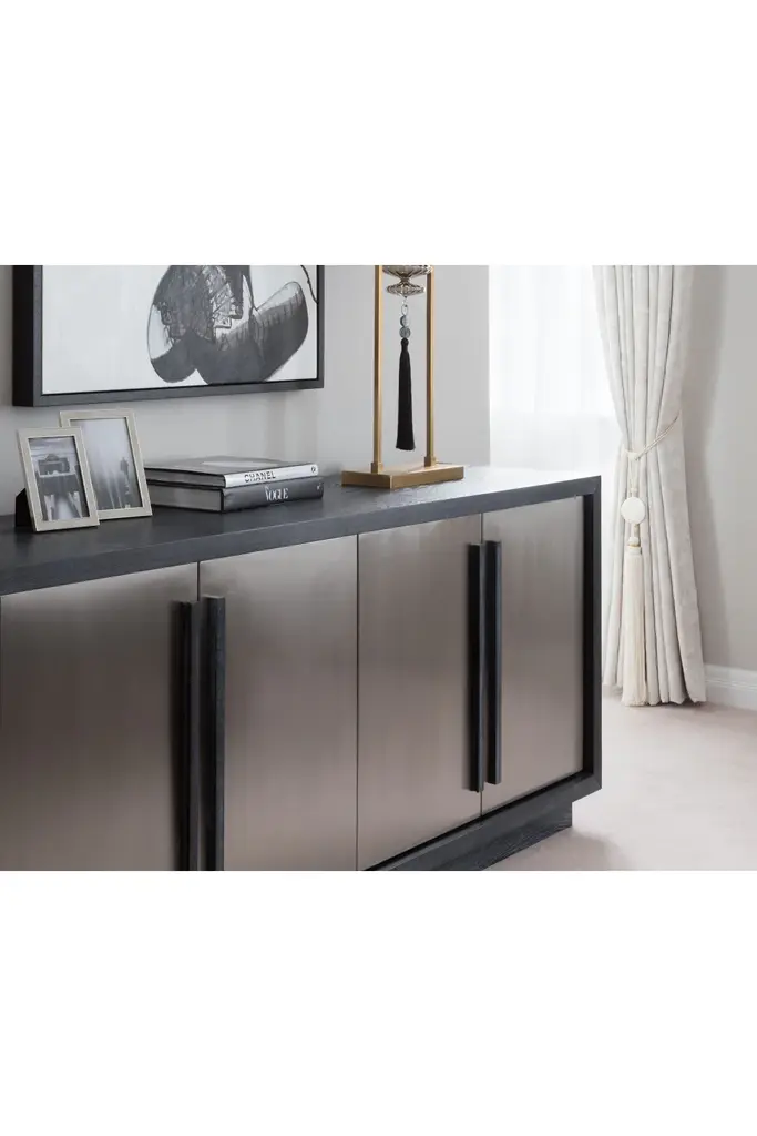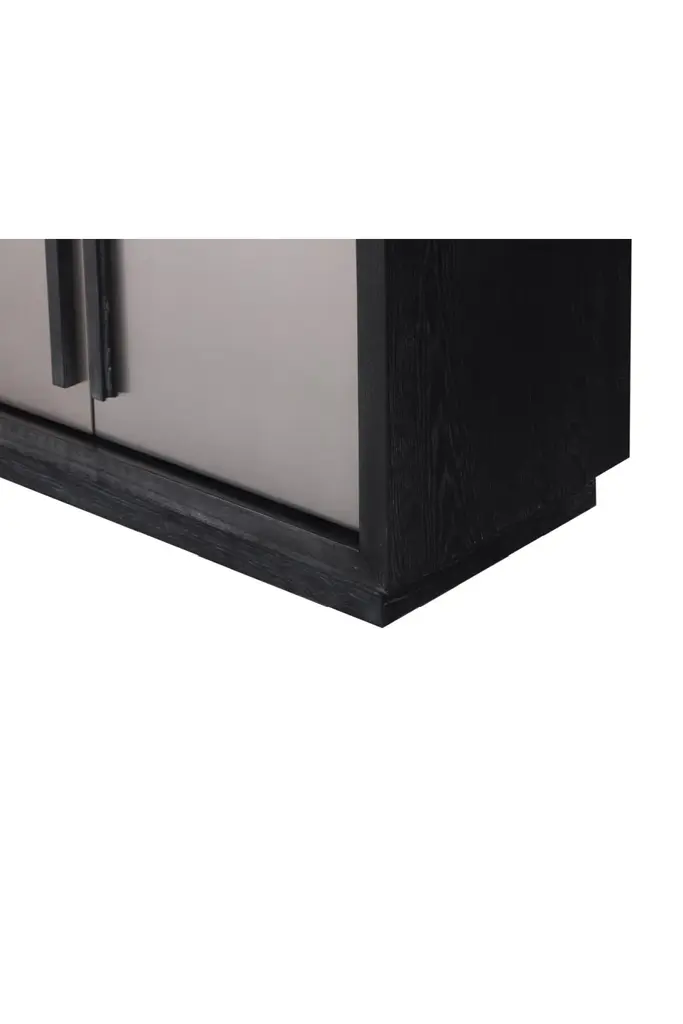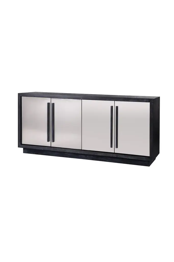 ith hand brushed doors and a masculine chic, the cerused textured ash veneer gives movement to this architectural form. A recessed base lends lightness to the modern cubed design accented with solid wood baton handles. The spacious interior of two sections, each with a shelf, gives ample space for storing your dinnerware. Ideal as a sideboard for a dining room or a tall TV stand for a larger living space.ith hand brushed doors and a masculine chic, the cerused textured ash veneer gives movement to this architectural form. A recessed base lends lightness to the modern cubed design accented with solid wood baton handles. The spacious interior of two sections, each with a shelf, gives ample space for storing your dinnerware. Ideal as a sideboard for a dining room or a tall TV stand for a larger living space.