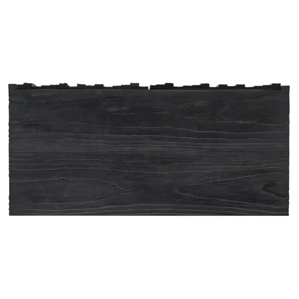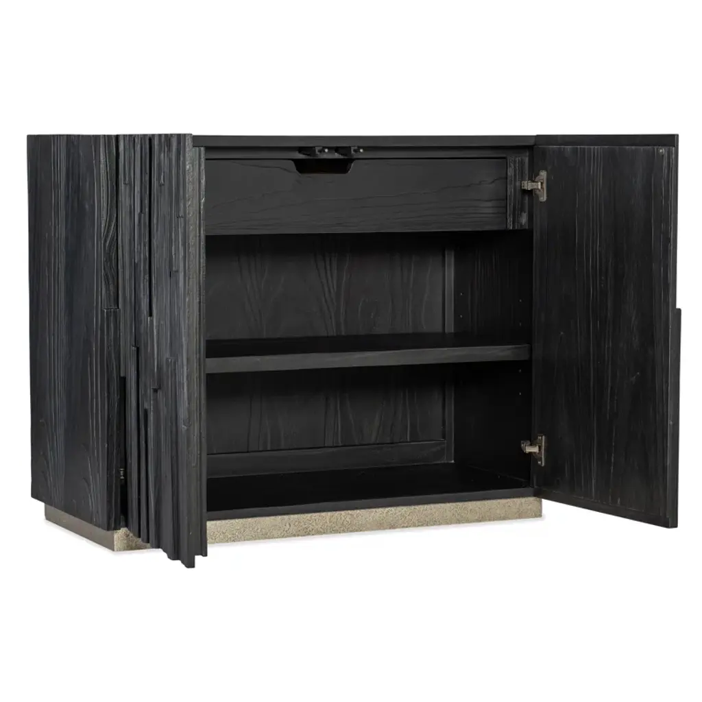 Pine Veneers in a Charred Black finish featuring a Japanese technique to achieve the look of burnt wood create a truly unique piece in the Chapman Accent Chest. With a rustic and casual yet sophisticated design, the chest has two doors with soft-close hinges and touch latches, one adjustable wood shelf, one drawer behind the doors and is media-ready with a ventilated back panel.